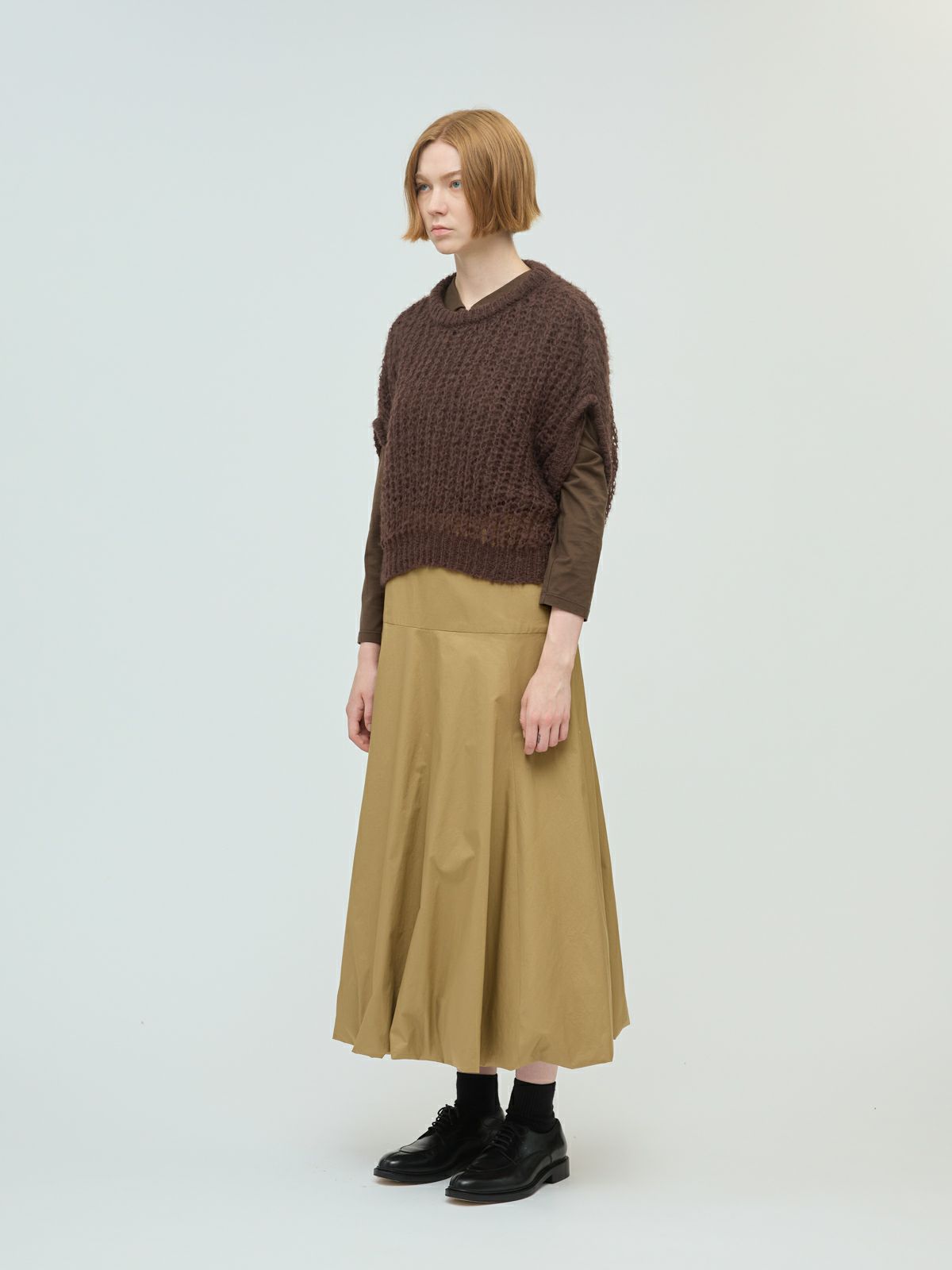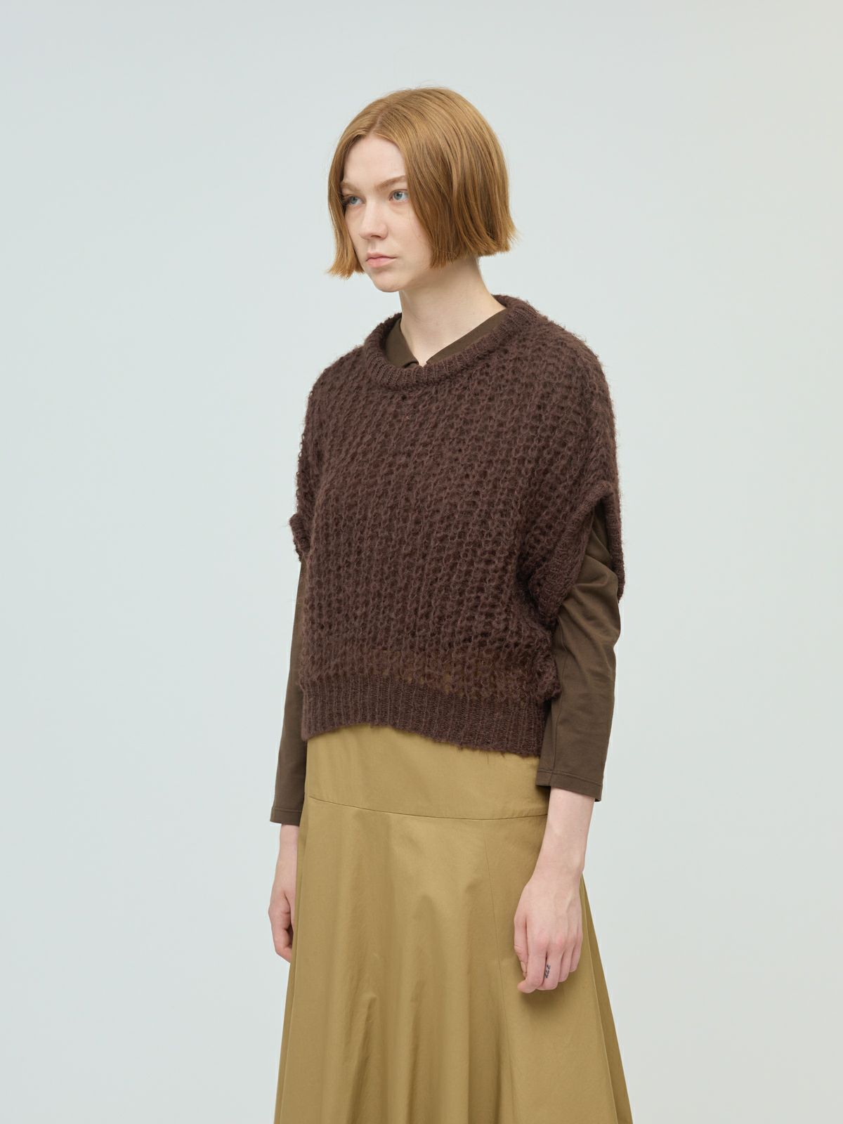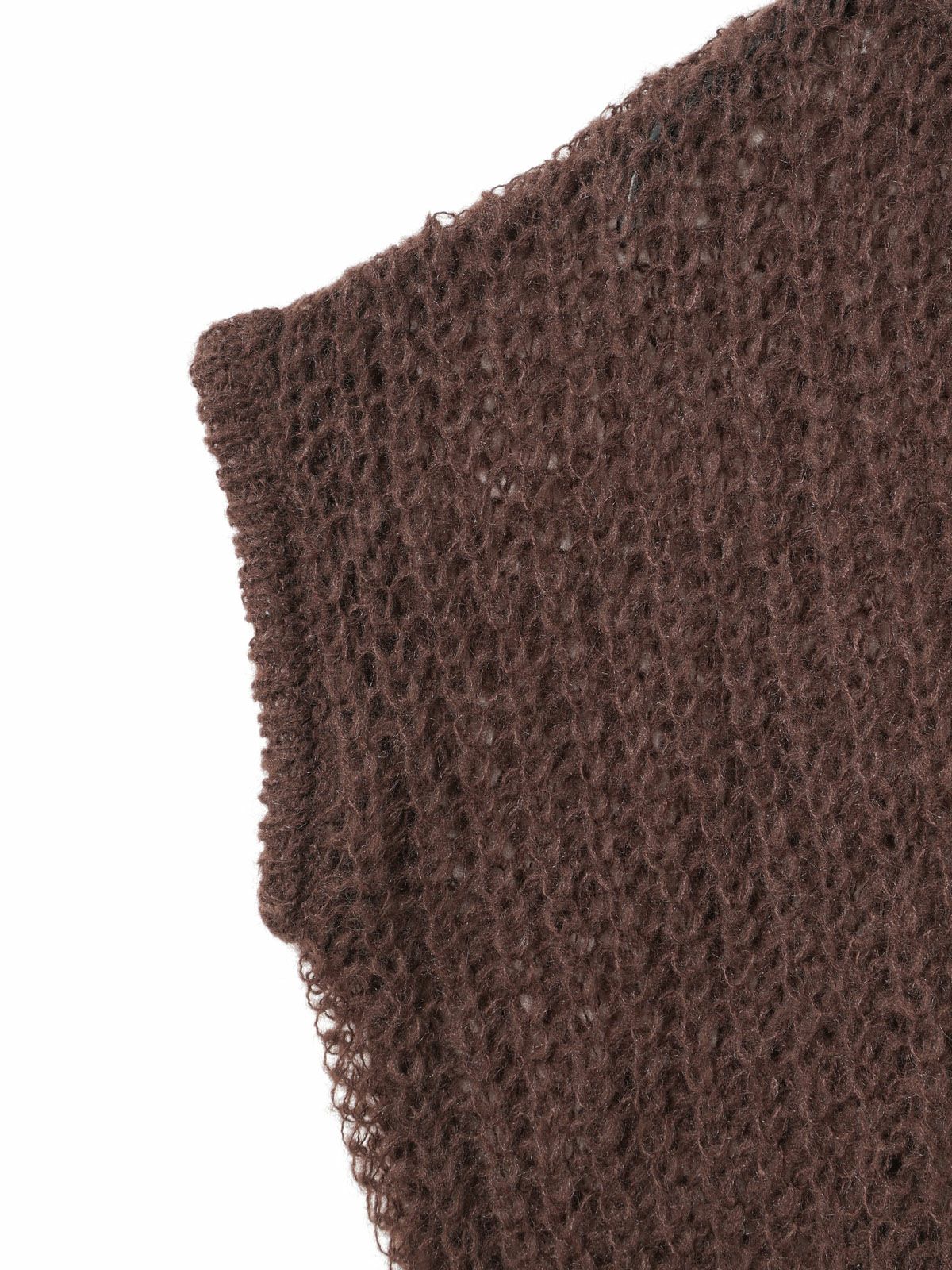 甘撚りのモヘヤ糸でふっくらと編立たヘアリーコクーンワイドベストです。ポリエステル生地を使用したウールライクな1枚。今季mizuiro ind人気のアイテムになりそうなコクーンシルエットのベストアイテムで、モードな雰囲気も演出します。編み方が大き目なので透け感があり重ね着を楽しんでいただけます。お洗濯可能なのもポイントです。