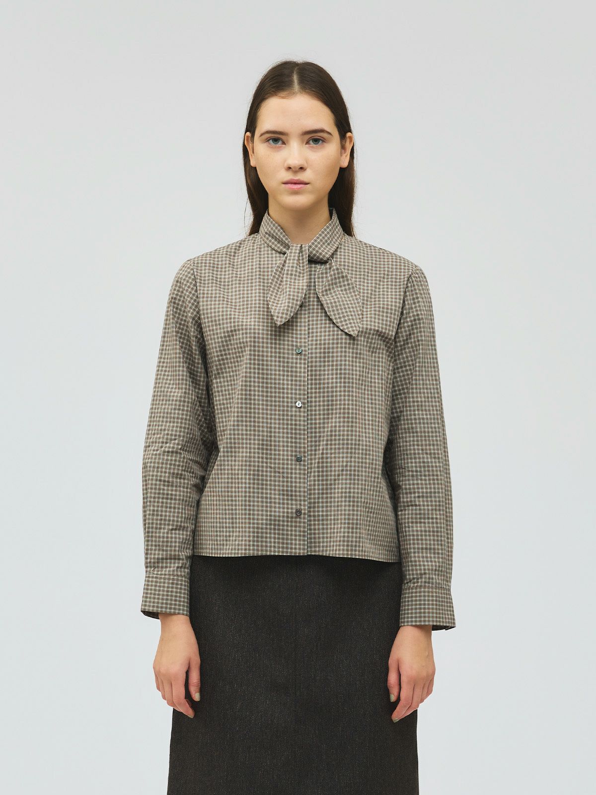 スカーフと襟が一体となったチェックリボンタイシャツです。シャツの身頃はコンパクトなサイズ感となっておりスッキリと清楚な着こなしを演出します。インナー使いにしても素敵で、首元のリボンがアクセントになってくれます。一体となっていることで、リボンを紛失することもないのがポイント。ブラウンとグレーの落着きのあるデザインはトラッドな雰囲気も演出。幅広くコーディネートができる1枚です。