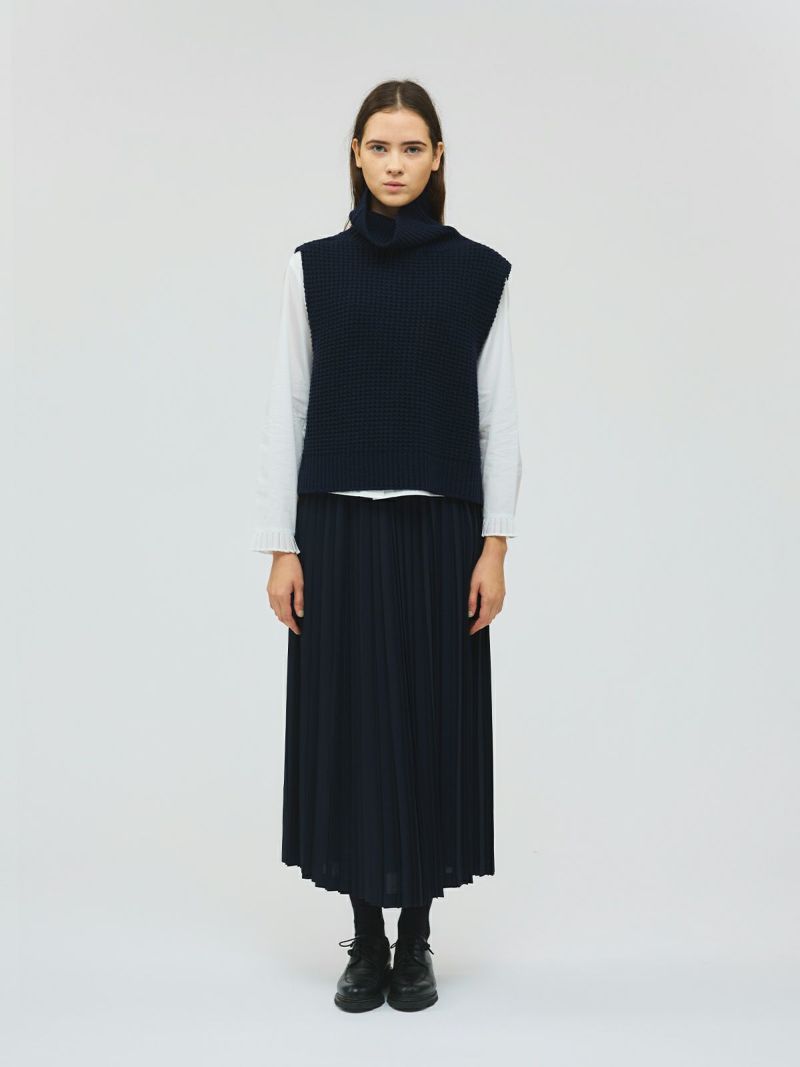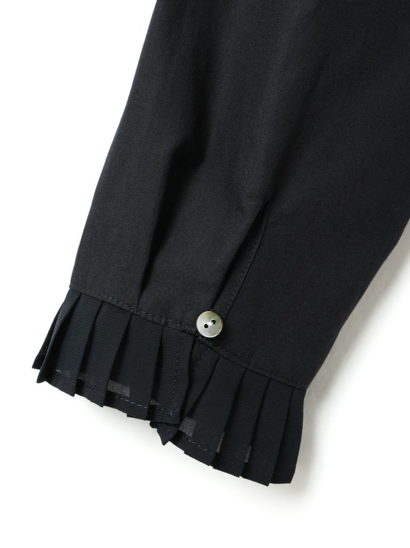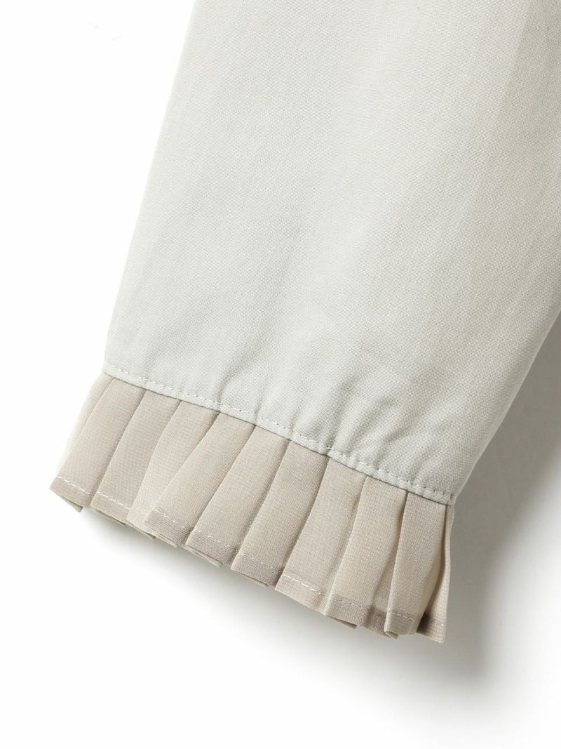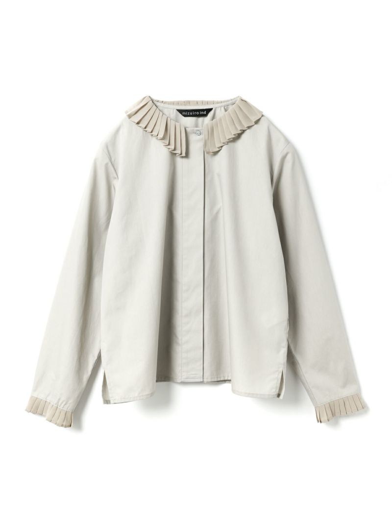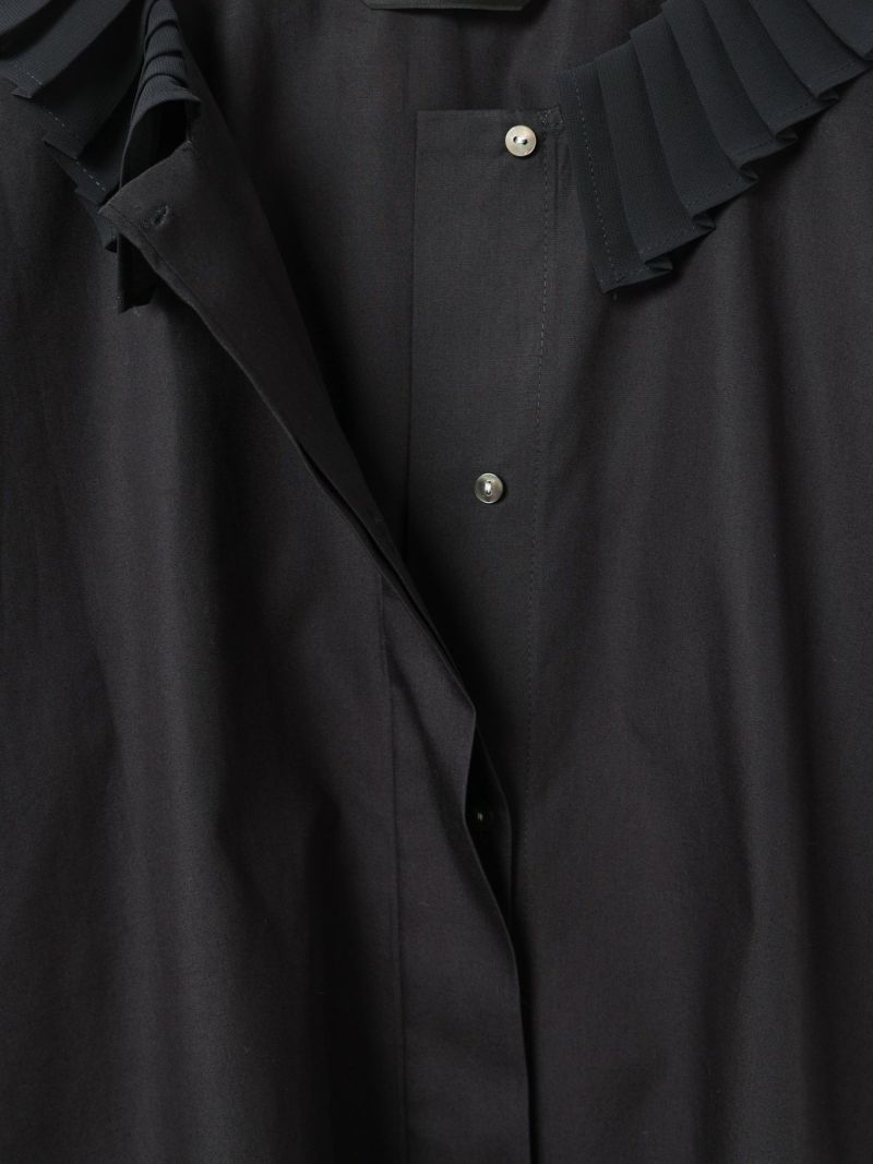 50ブロード生地を使用したプリーツカラーシャツです。以前から人気のあるデザインをシルエットを変え新登場。身頃とは別の生地に変えてデザインした襟と袖にはプリーツをあしらった上品な1枚に仕上げました。比翼仕立てのフロントはすっきりとしたデザインもポイント。襟をだしたり、袖口を見せたりインナー使いとして活躍していただけるシャツです。