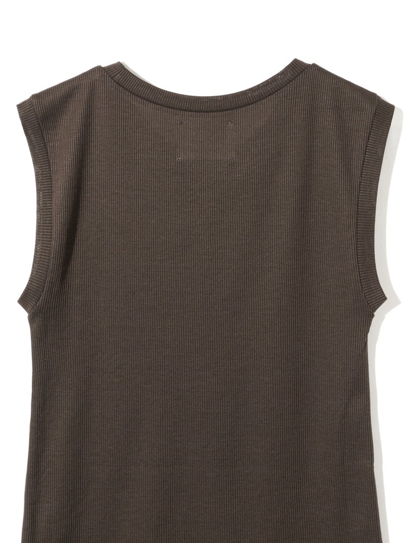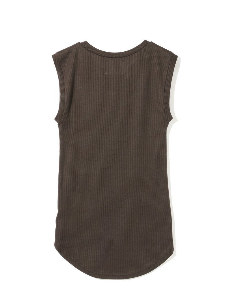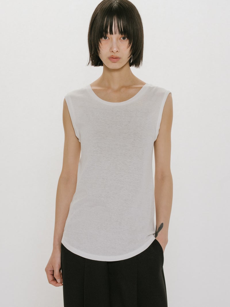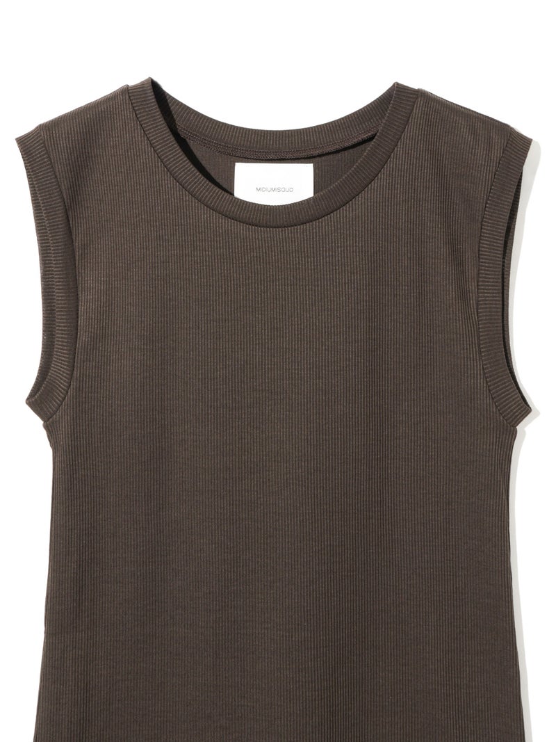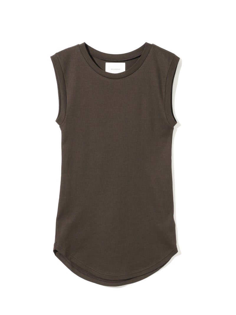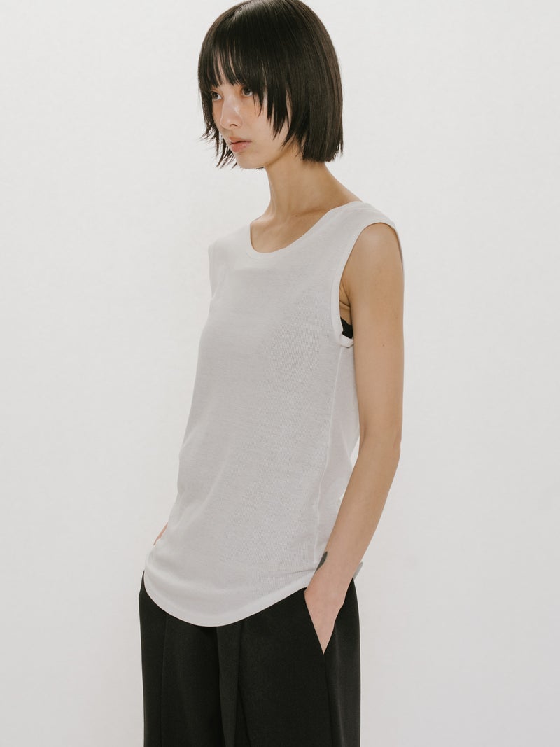 柔らかで肌触りの良いリヨセル綿のテレコリブを使用したリブタンクトップです。MIDIUMISOLID実績のある1枚で今季も再入荷させていただきました。肩線が細すぎないので安定感がある着心地、そして裾のラウンドはヒップになじみ着やすさを考えたサイズとバランスに仕上げました。透け感のあるかぎ編みニットのデザインや、夏に多く見られる軽やかな素材感のアイテムとして、これからの季節に重宝する一着です。コーディネートで見えてくるインナー使いまで拘りをもった着こなしを演出し、女性らしく上品な雰囲気を表現できるタンクトップです。