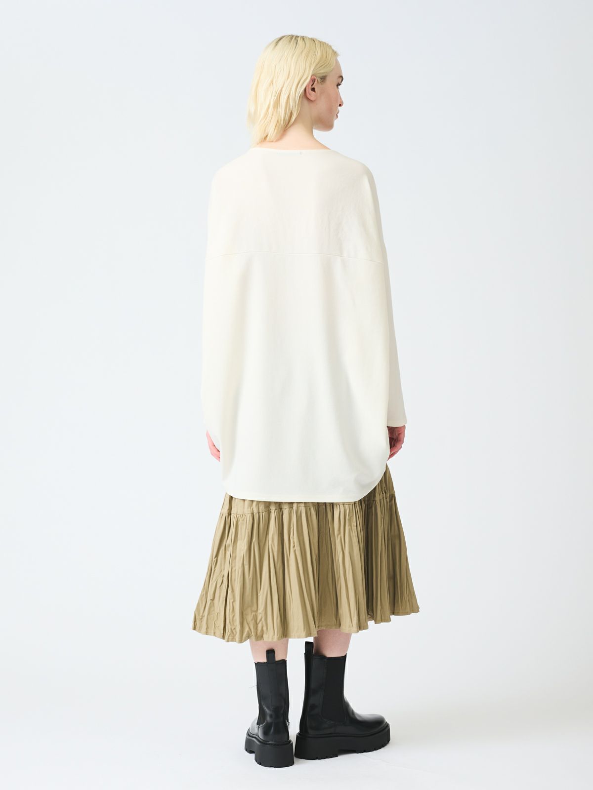 マットな表情としなやかなドレープ感が魅力的なジョーゼットボートネックコクーンプルオーバーです。mizuiro indらしい人気のコクーンアイテムで上品なジョーゼット素材を使用。前後で長さが異なり滑らかに動きのあるシルエットが特徴。着心地の良いサラッとした生地感なので暑い季節にもお勧め。着回しアイテムとして長く愛用いただける1枚です。