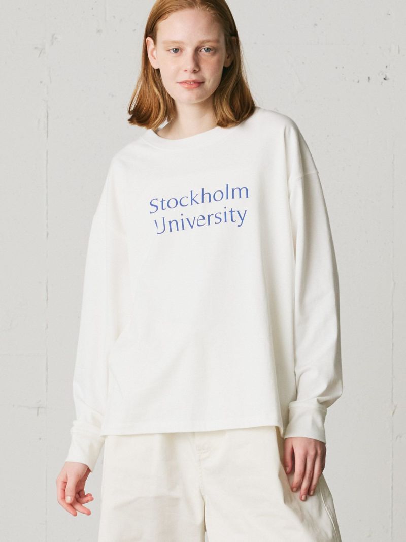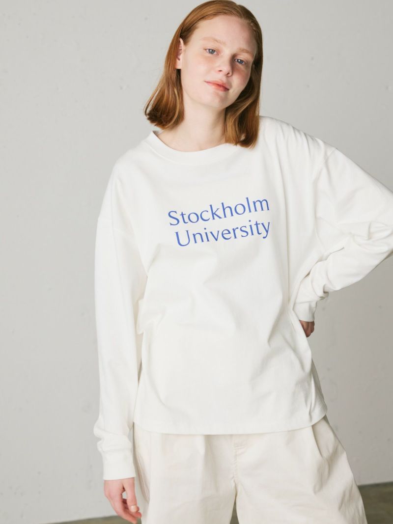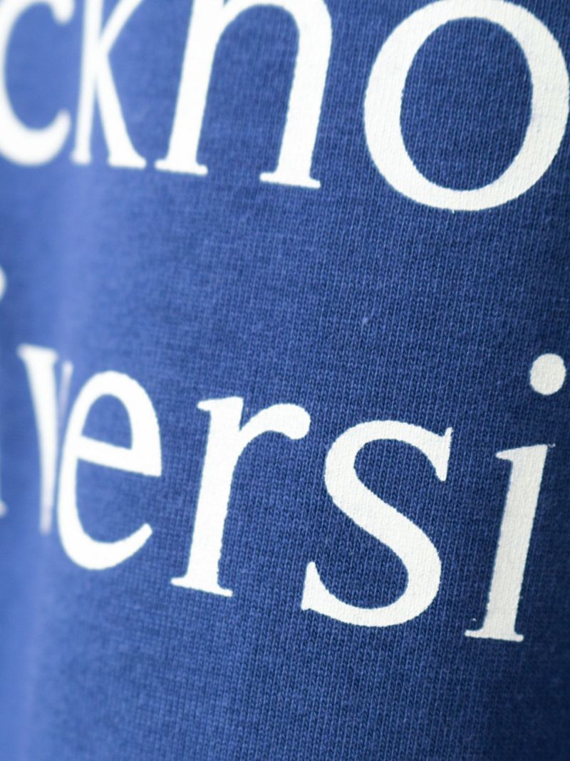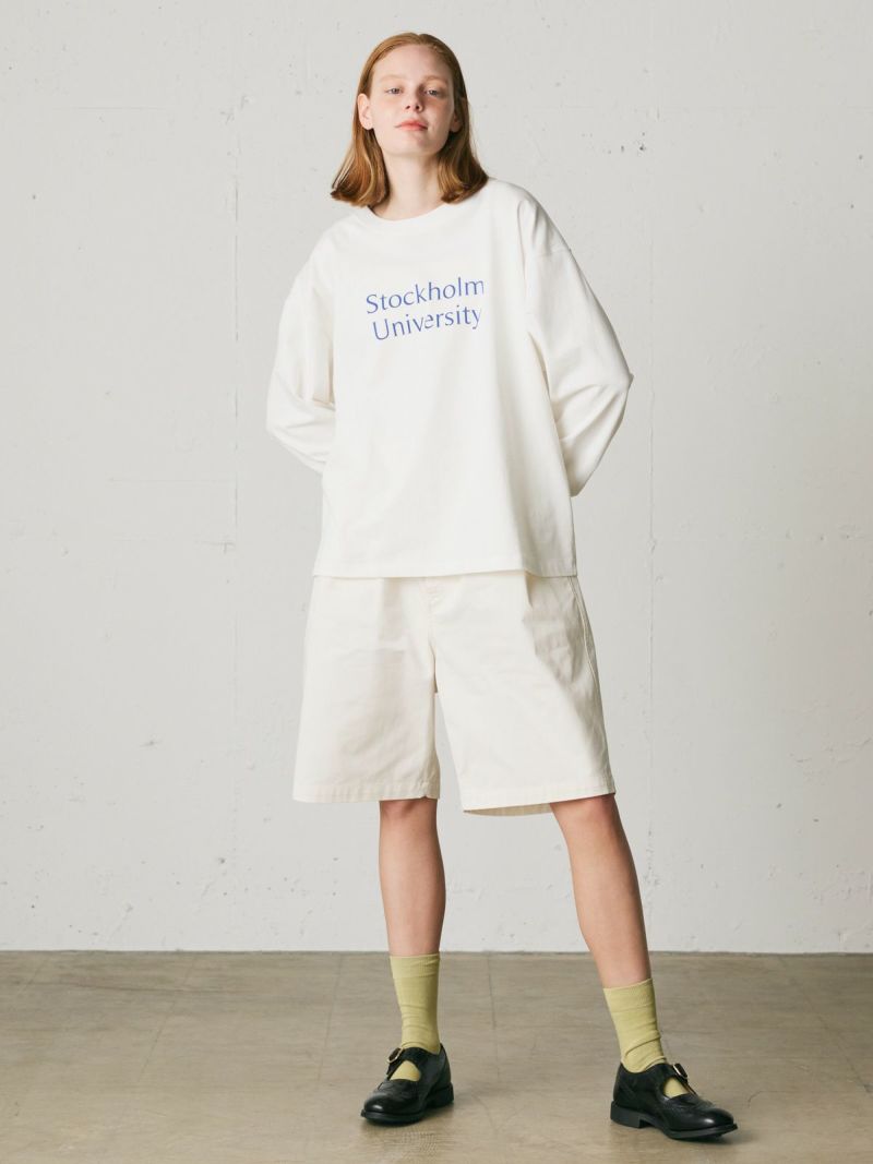 斜行しにくい目の詰まった天竺素材を使用したロゴプリントTシャツです。環境負担を軽減した染色整理加工をしています。ロゴはフロント部分のみ。オフホワイト×ブルー・ブルー×オフホワイト・グレー×グリーン・ブラック×ライトグレー。コーディネートしやすいサイズ感でシンプルな大人のカジュアルを演出します。