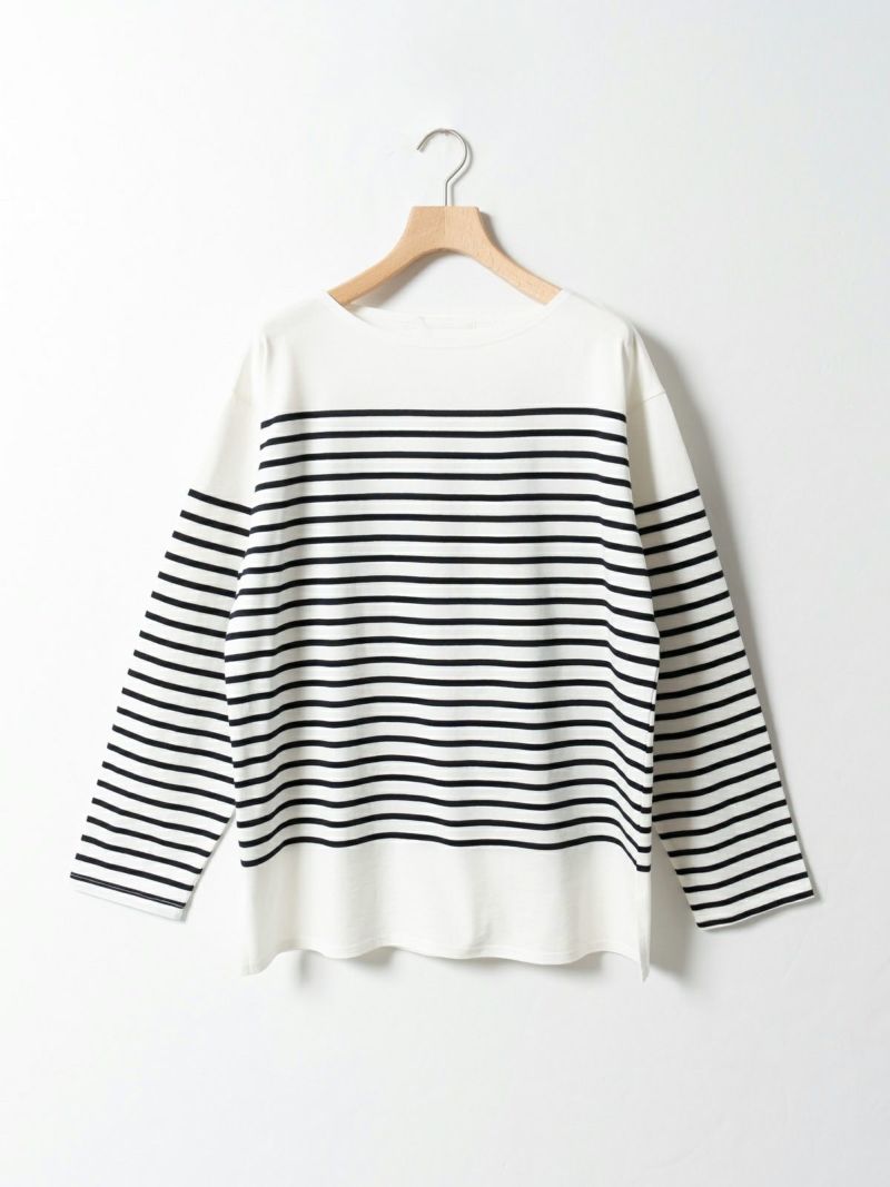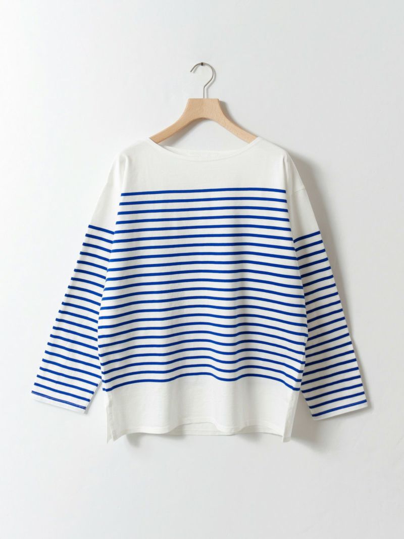 無地とボーダーで切り替えられたパネル状の生地を使用したパネルボーダープルオーバーです。メンズライクなワイドバスクシャツでカジュアルの定番として愛用できる1枚。洗濯で縮むものもあるバスクシャツですが、あらかじめ洗いをかけてひと手間を加えプレスで仕上げているMARMARMARのこだわりポイント。洗濯を繰り返しても購入時と変わらぬサイズ感を持続します。左袖口に施した‘M’の刺繍もさりげなくて魅力的。女性らしいボトムとの組み合わせやシャツに合わせるなど、トラッドな組み合わせがお勧めです。