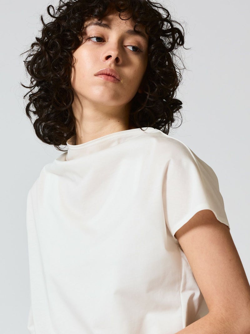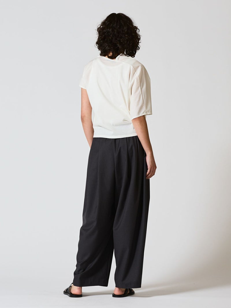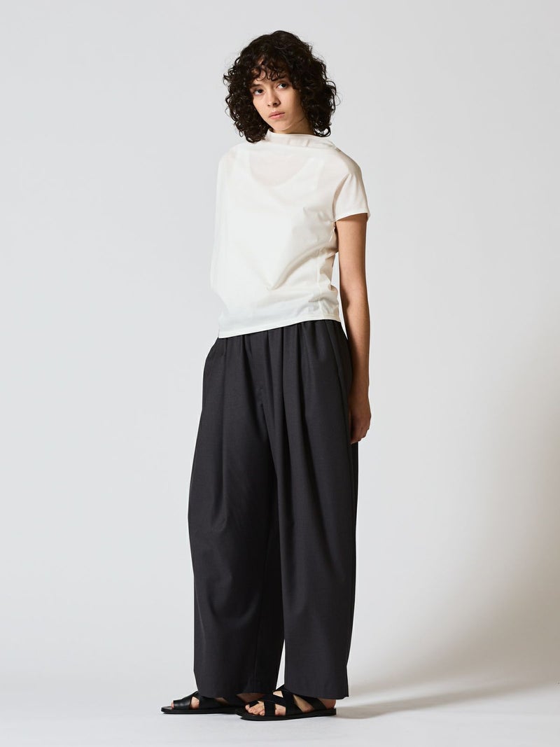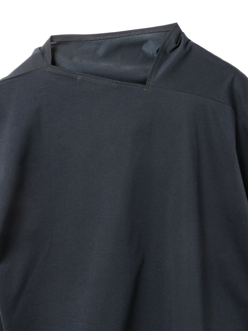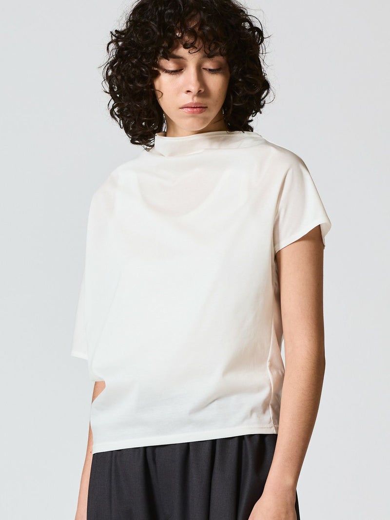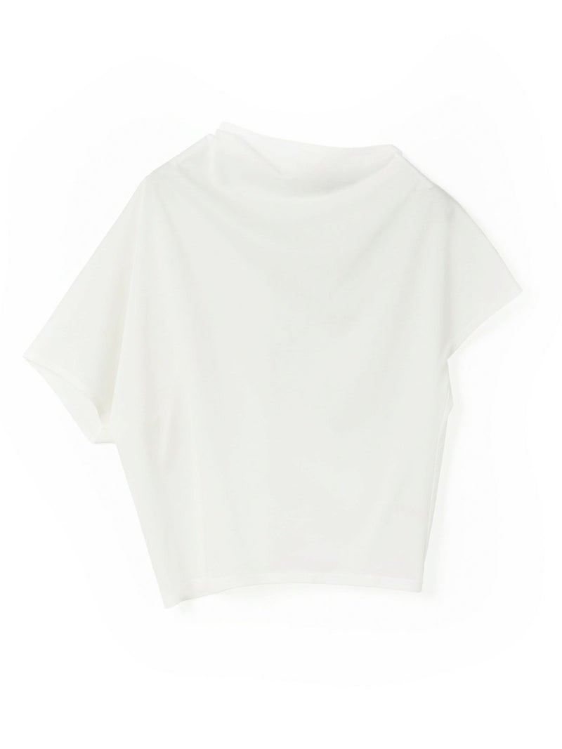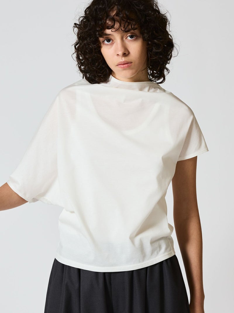 布帛ライクなハイゲージのカットソー、アシンメトリードレーププルオーバーです。アシンメトリーのデザインがポイントで右肩部分のドレープがポイント。透け感のあるシアー感が清楚で上品な雰囲気も。5色の豊富な色展開も魅力的。シンプルにかっこよく着こなせる1枚です。