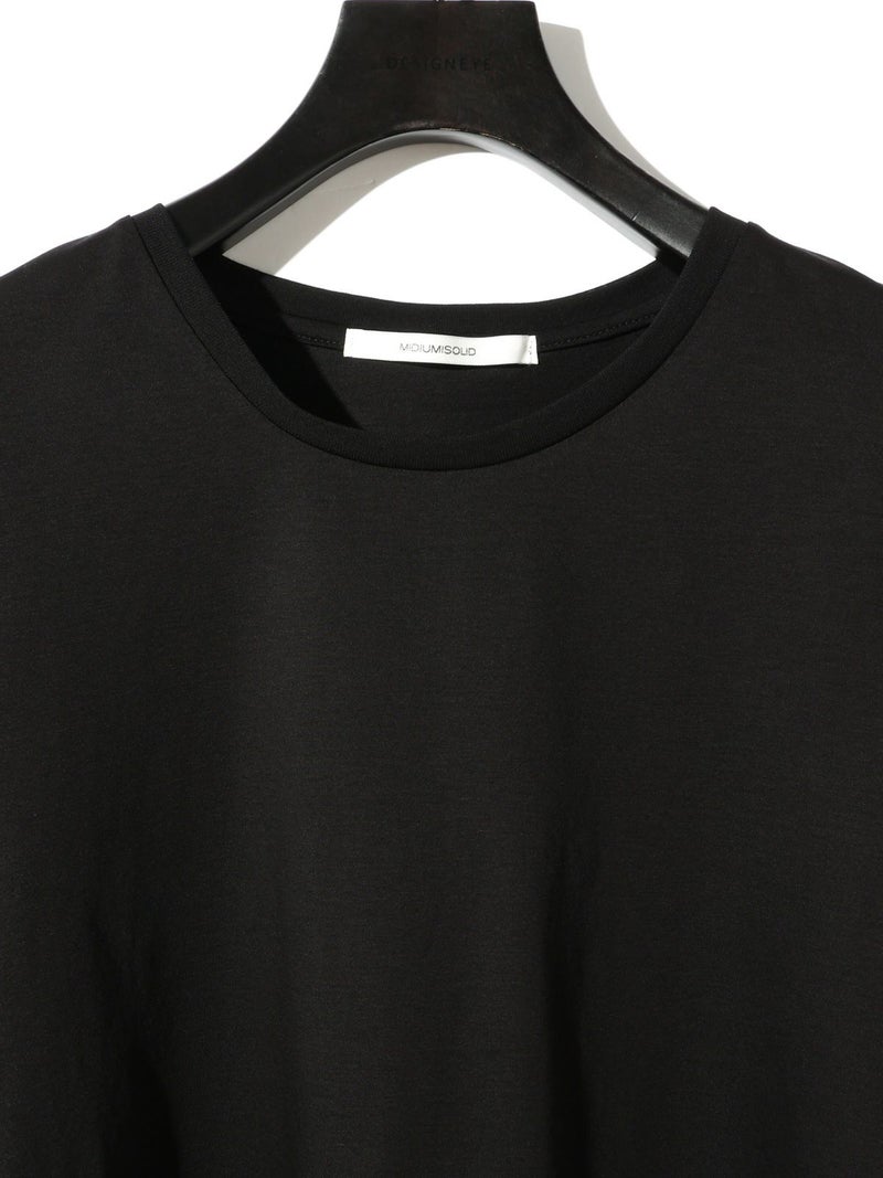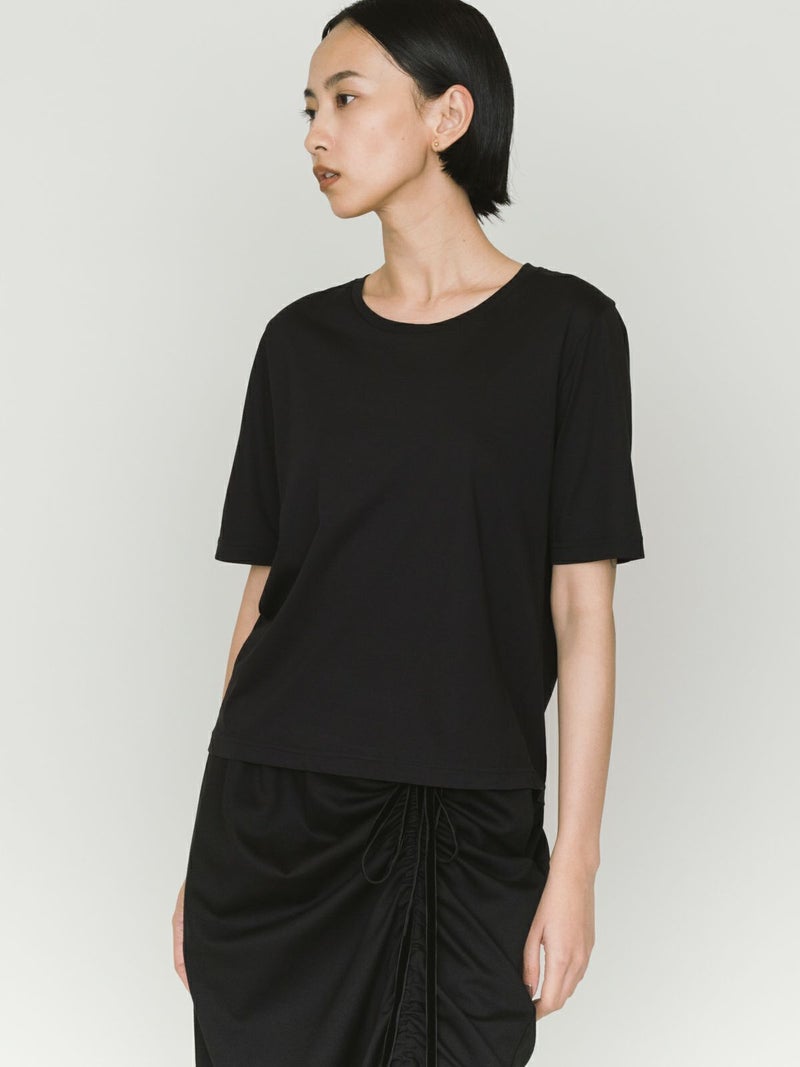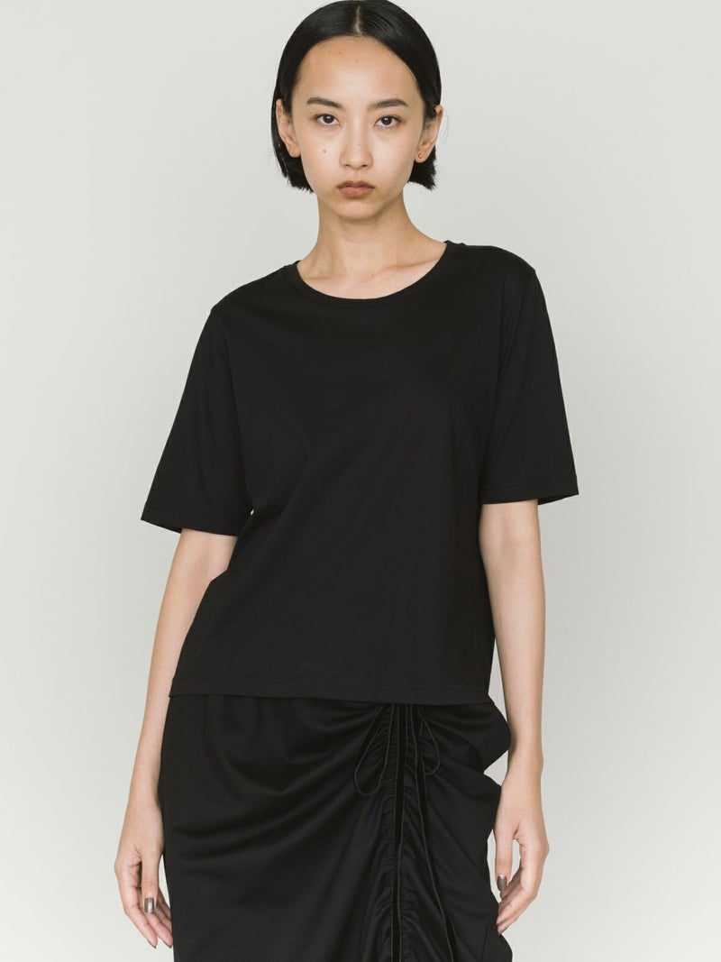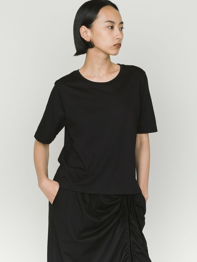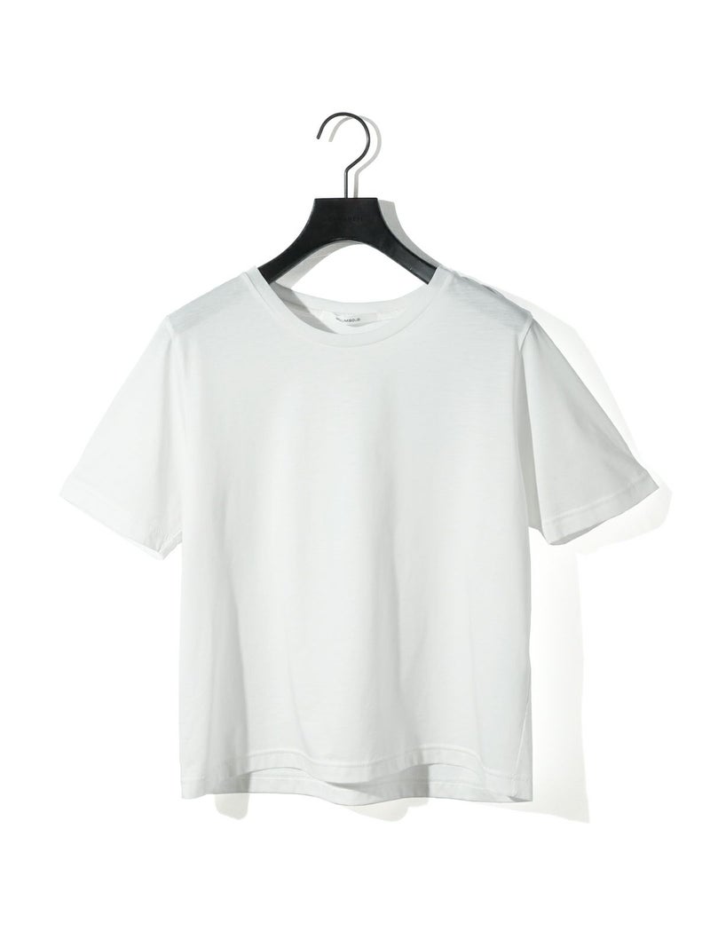 マイクロビスコース混、毛羽の少ない布帛ライクな素材が特徴のベーシックTシャツです。細いクルーネック部分は女性らしいデザイン仕上げ。身頃も着丈もシンプルなデザインなので着回しアイテムとして重宝します。カラー展開もあえてホワイトとブラックの2色展開です。晩夏の季節の変わり目で着こなせる時期を調整しながら、春の温かくなっていく季節の移り変わりにコーディネートができる1枚です。