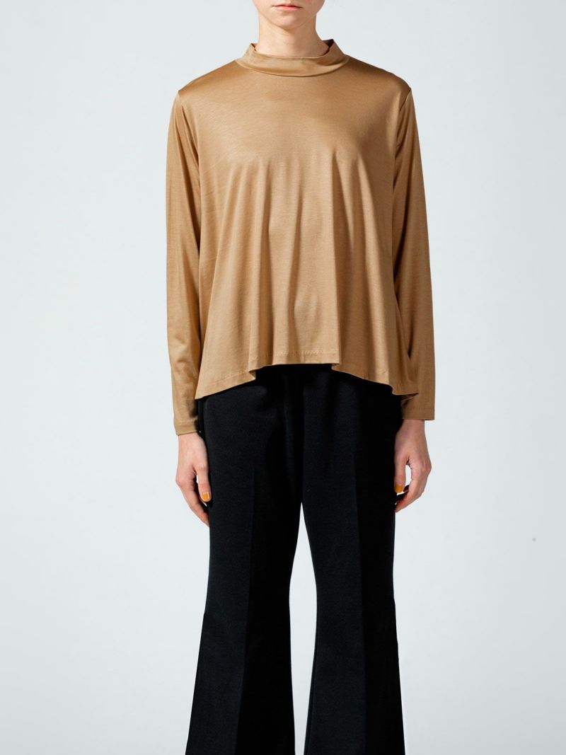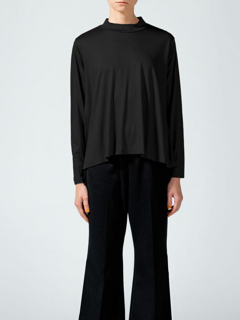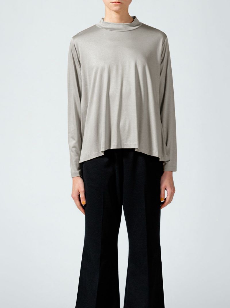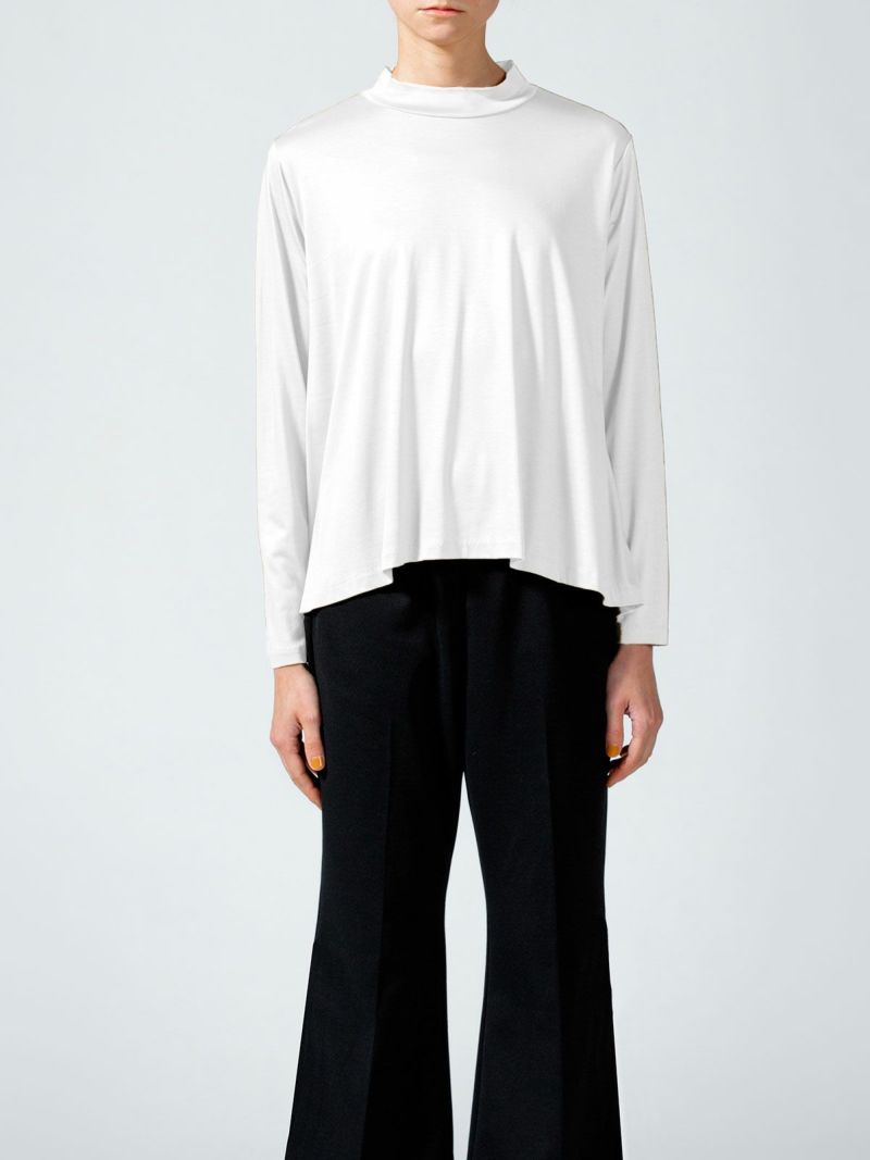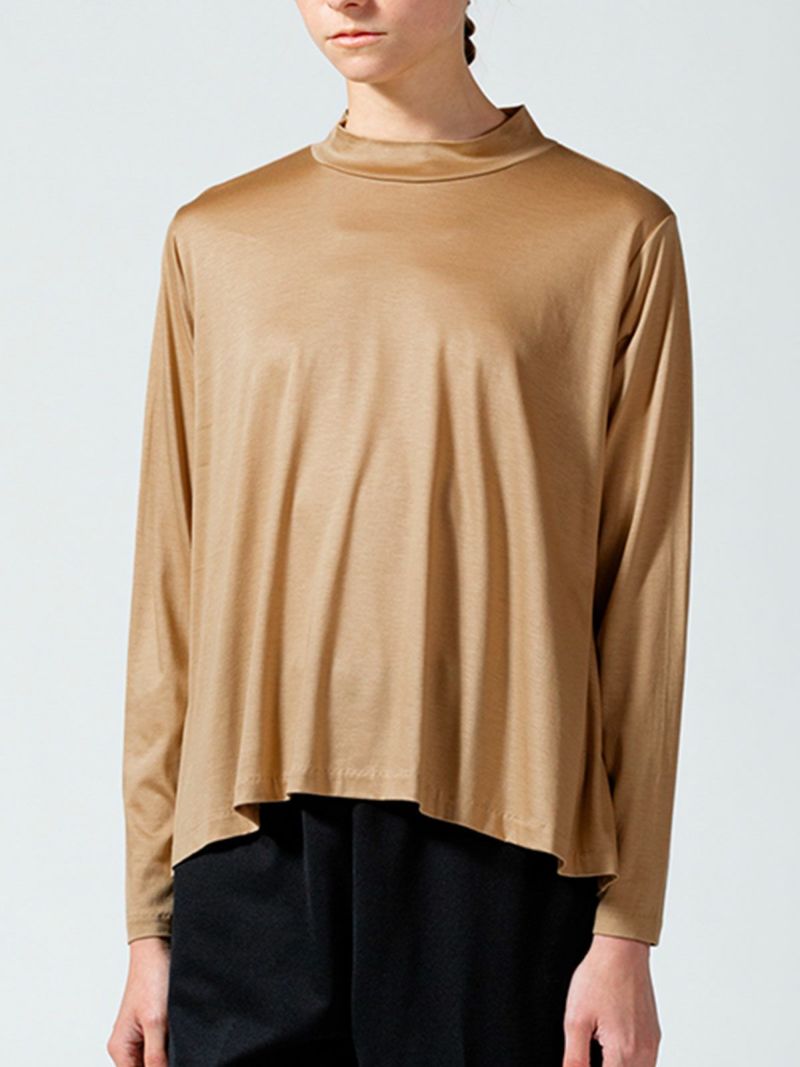 油分が多く滑らかな質感のギザ綿とエコロジー原料のセルロース混の天竺素材を使用したハイネックフレアプルオーバーです。ドレープ性とハリ感に加え目面の美しさが特長。しなやかに流れる前後差を付けた丈感は短か過ぎず長すぎないシルエットでボトムとのバランスを取りやすいデザインとなっています。着回しのきく落ち着きと華のあるカラー展開となっています。
