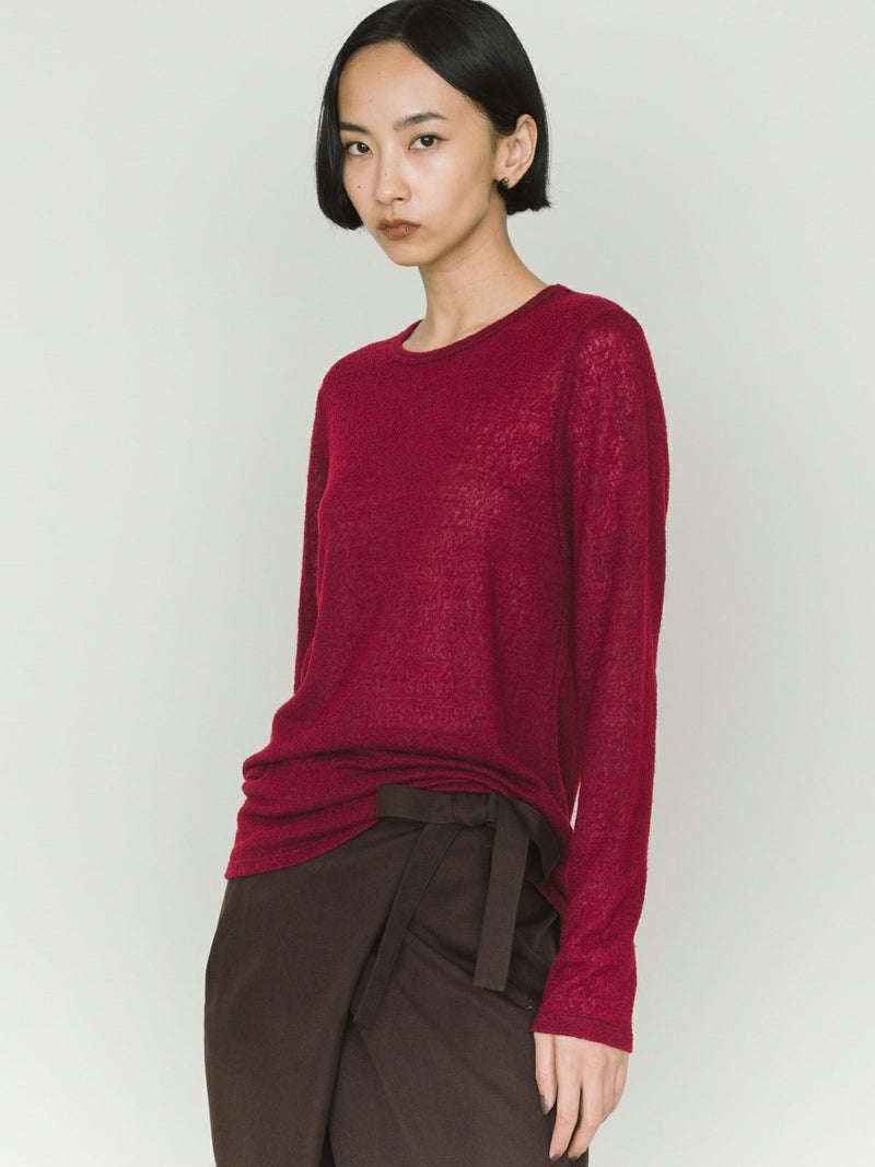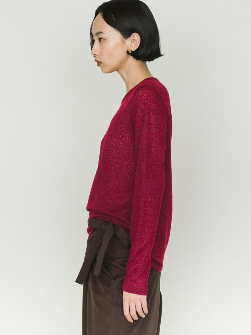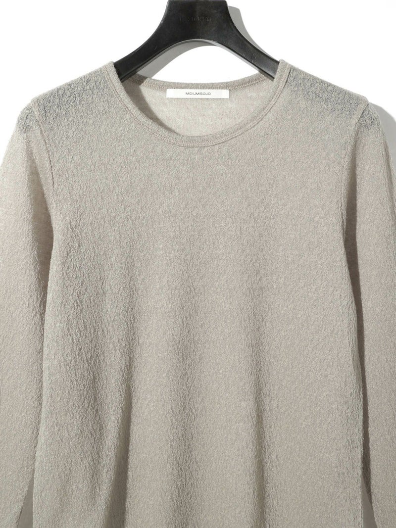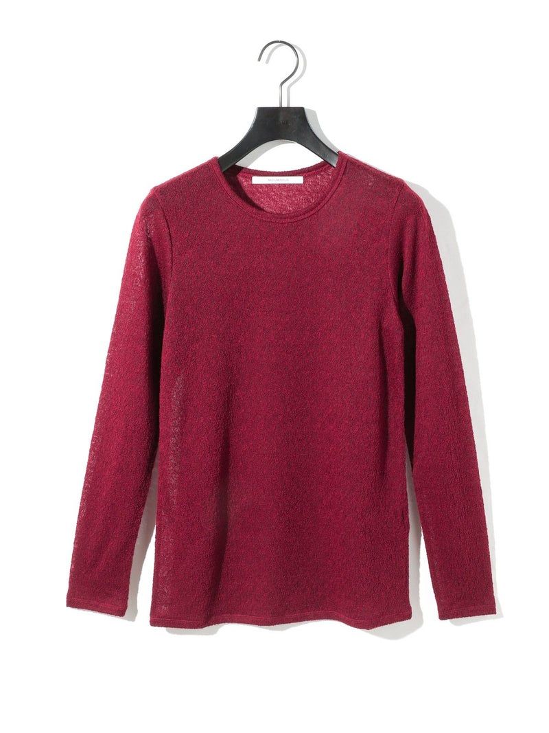 メリノウール混素材を使用したウールシアープルオーバーです。チクチクしないインナーとして着用していただけるカットソーです。クルーネックのシンプルなシルエットが特徴。ジャカード生地で雰囲気がありすっきりとした着こなしを演出します。透け感がありますが温かみがあるので寒い時期でも人気のシアーを取り入れやすい1枚です。