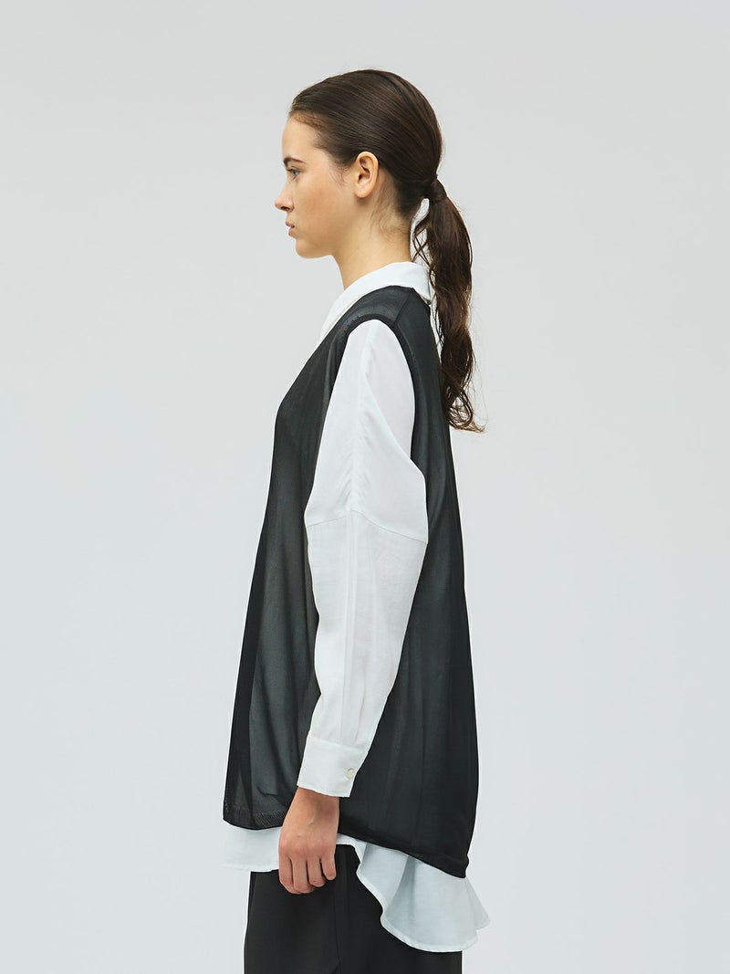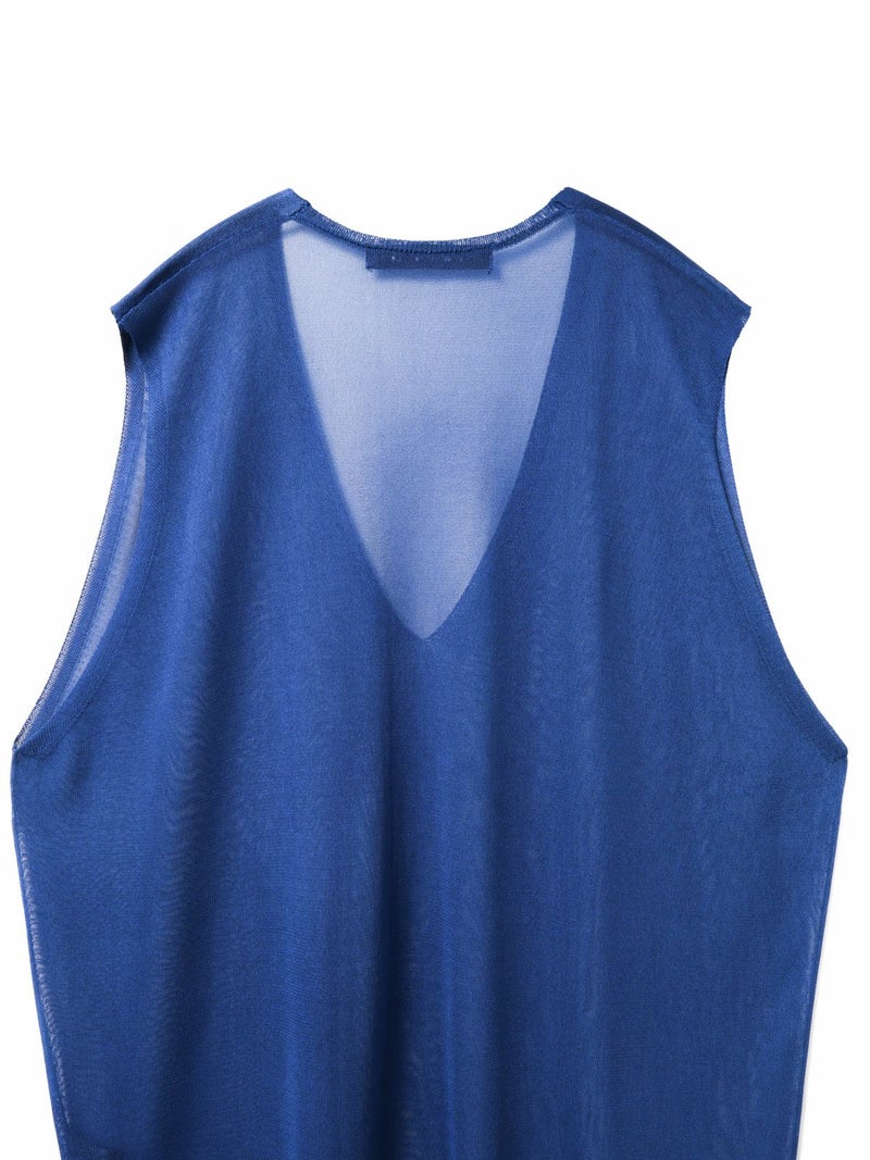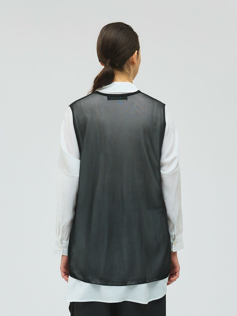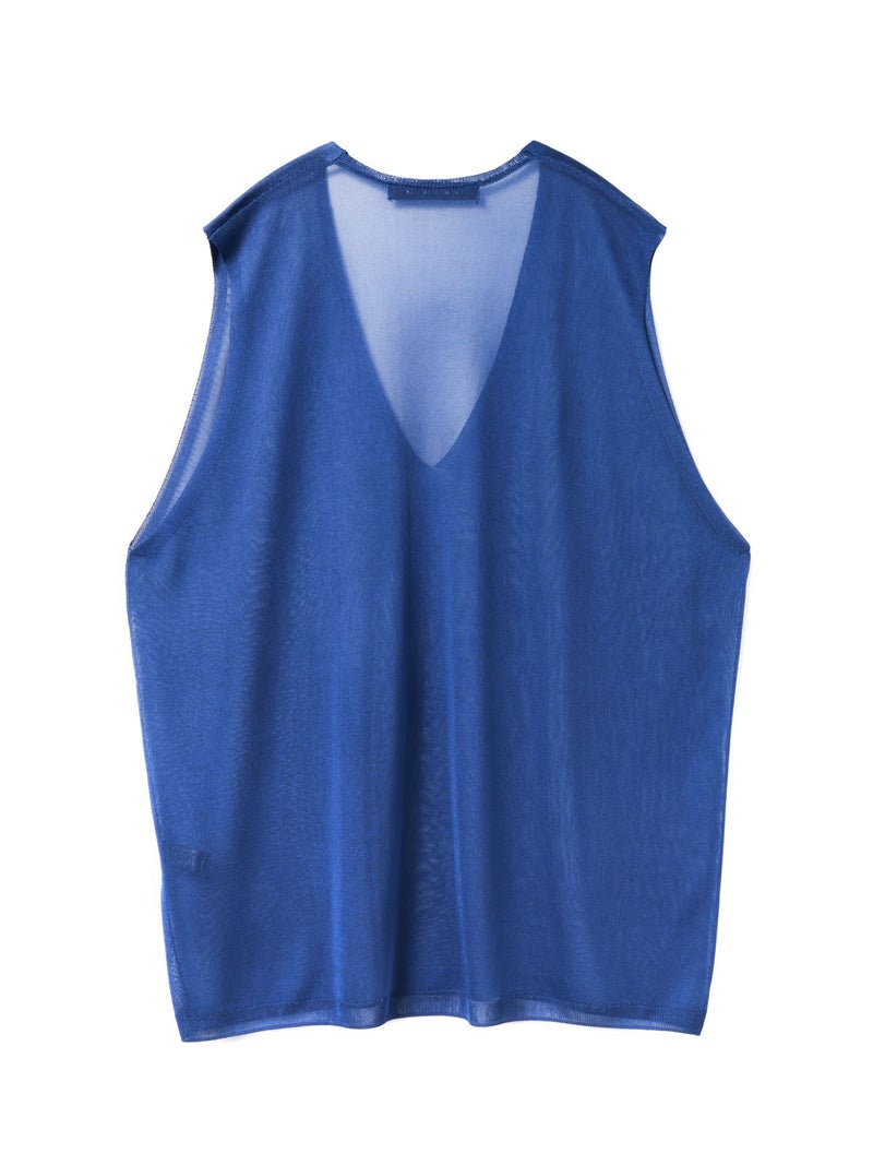 極細糸でハイゲージに編んだシアー深Vネックベストです。今季も人気のシアー素材を使用して透け感のあるニットアイテムを表現しました。ヒップの隠れる長めの丈感が特徴。アームが広く重ね着のしやすいデザインです。インナーがしっかりと見えてくれるので柄物とのコーディネートもお勧め。軽量感のある重ね着のしやすいベストになっています。手洗い可。同シリーズ1-220056/シアークルーネックプルオーバーも展開。