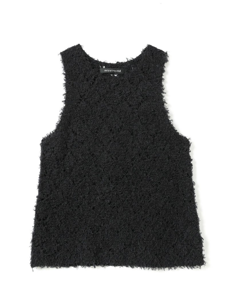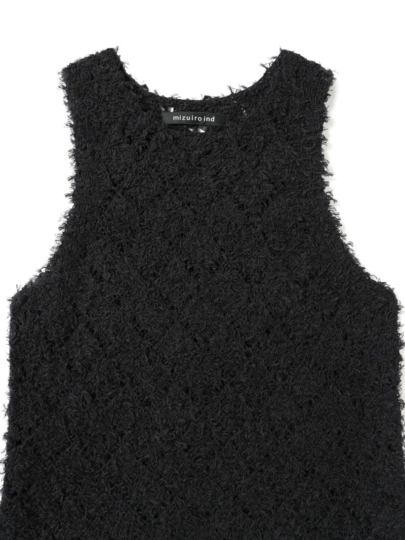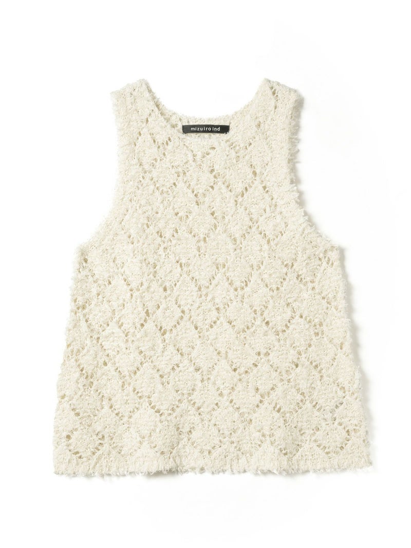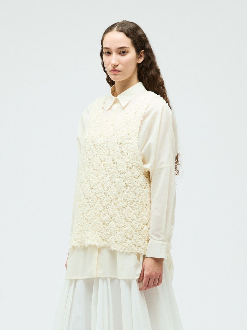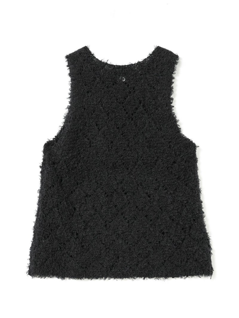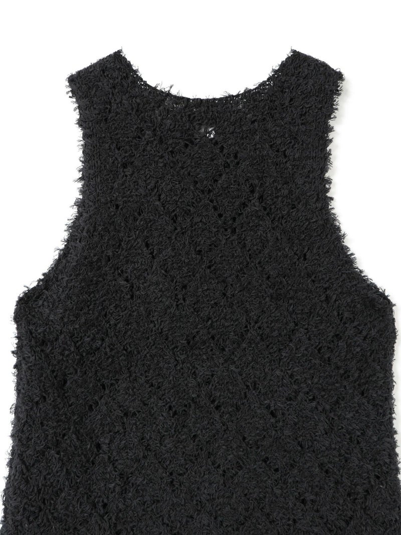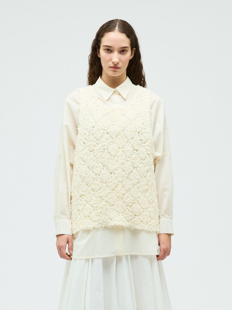 フリンジがついたテープヤーンをダイヤ柄で編んだパターンベストです。透け感と立体感のあるベストを表現しました。インナーの配色によって生地のダイヤ柄がより鮮明になります。同色でインナーを合わせても生地に特徴があるので重ね着を魅力的にしてくれます。少し長めのヒップ丈仕上げ。アームが広く重ね着がしやすいのがポイントです。軽さのあるニットアイテムでお洗濯もしていただけます。