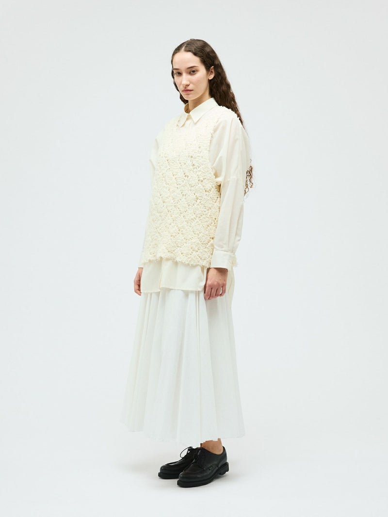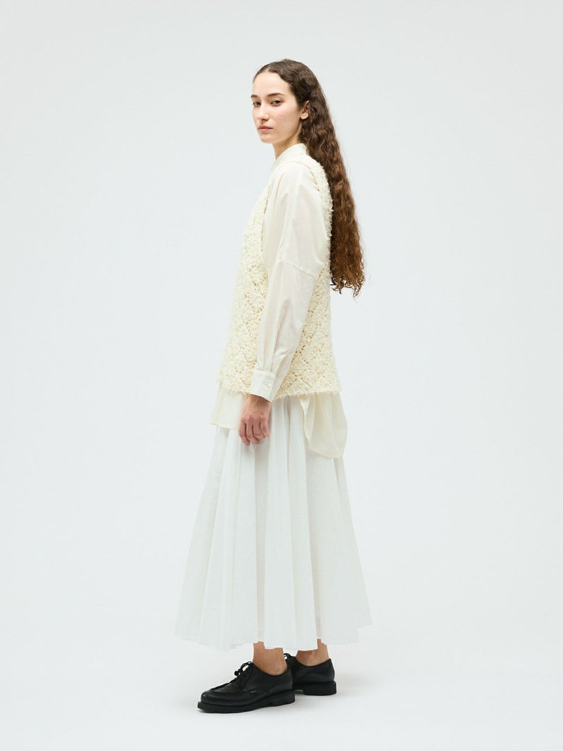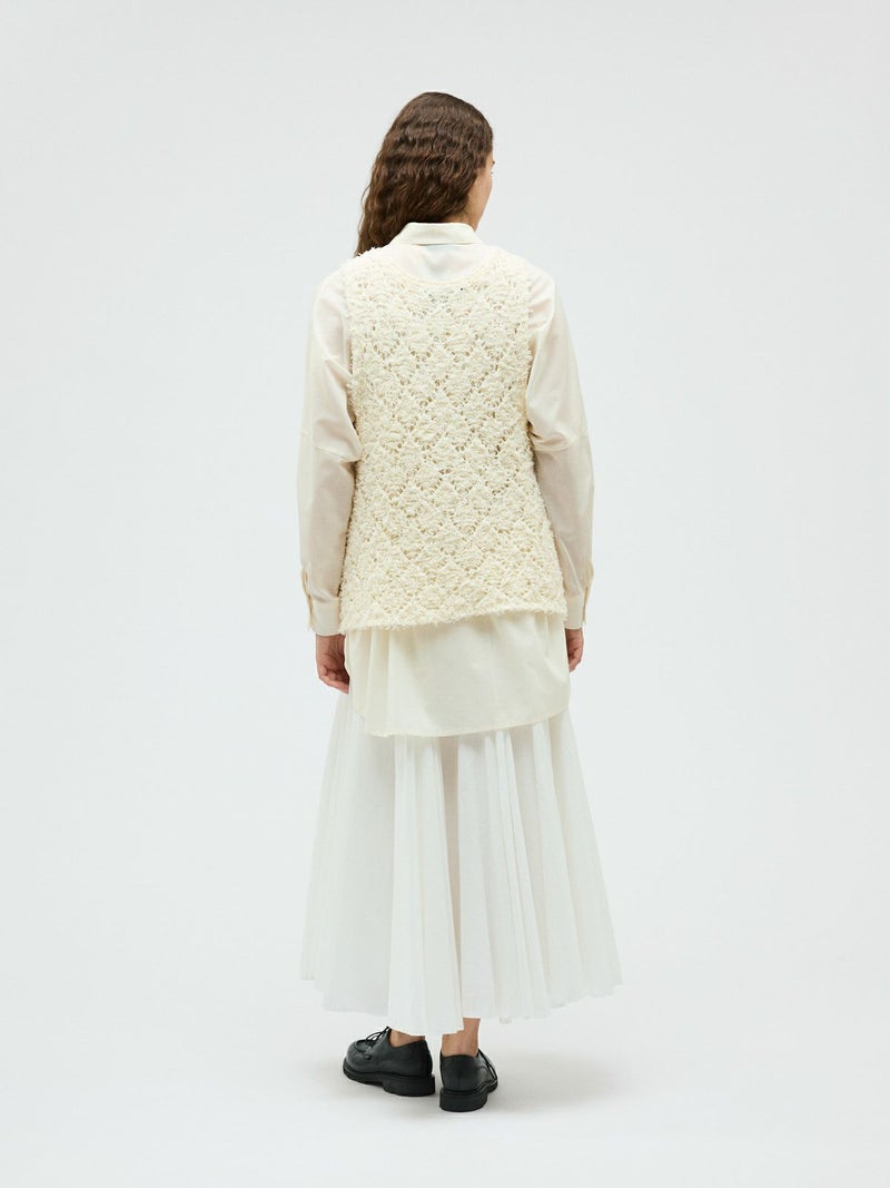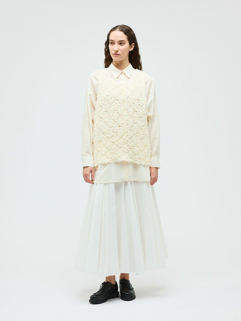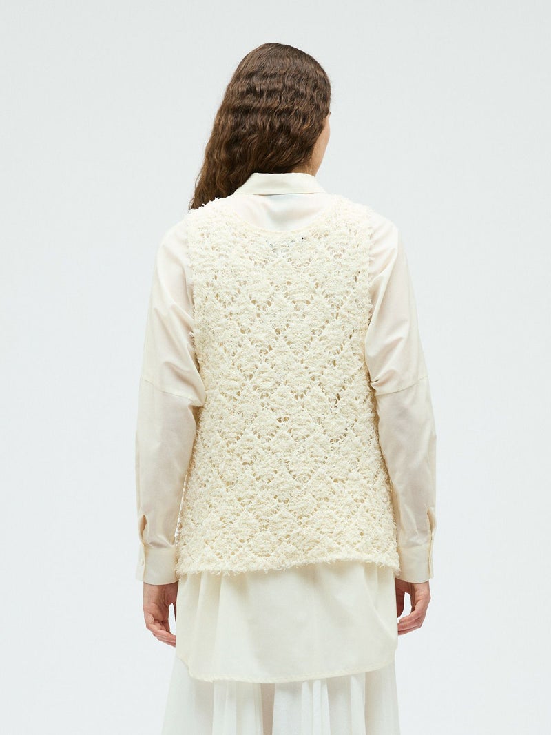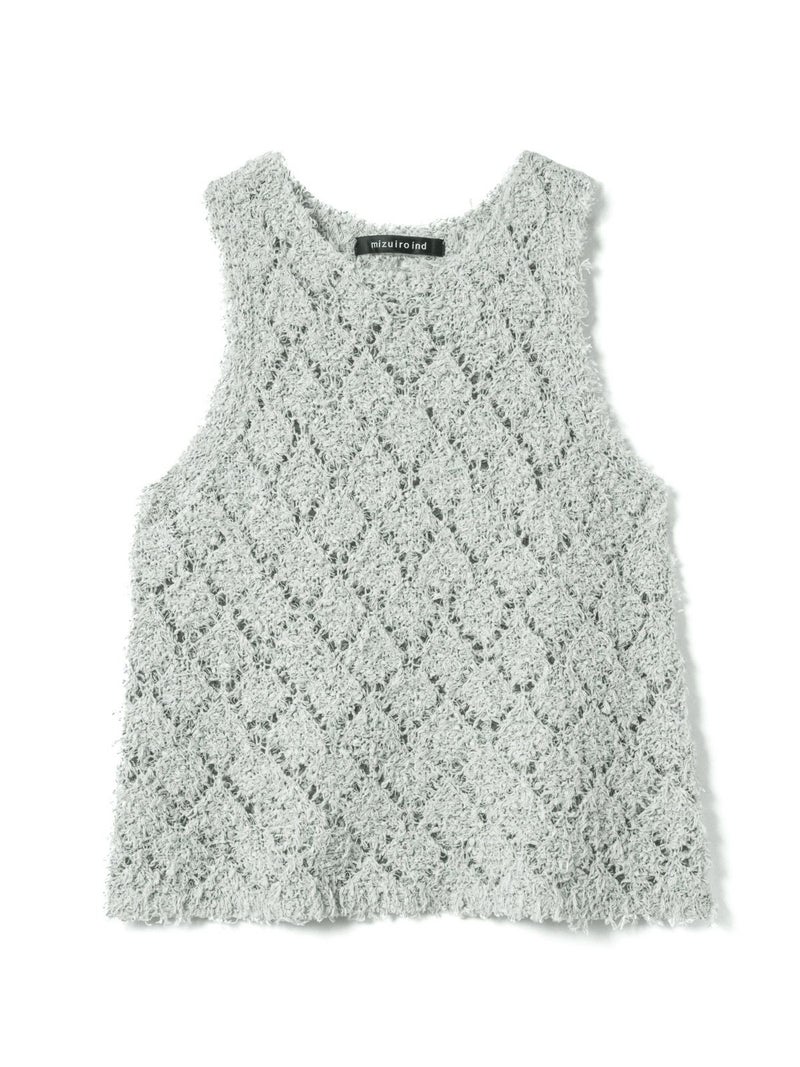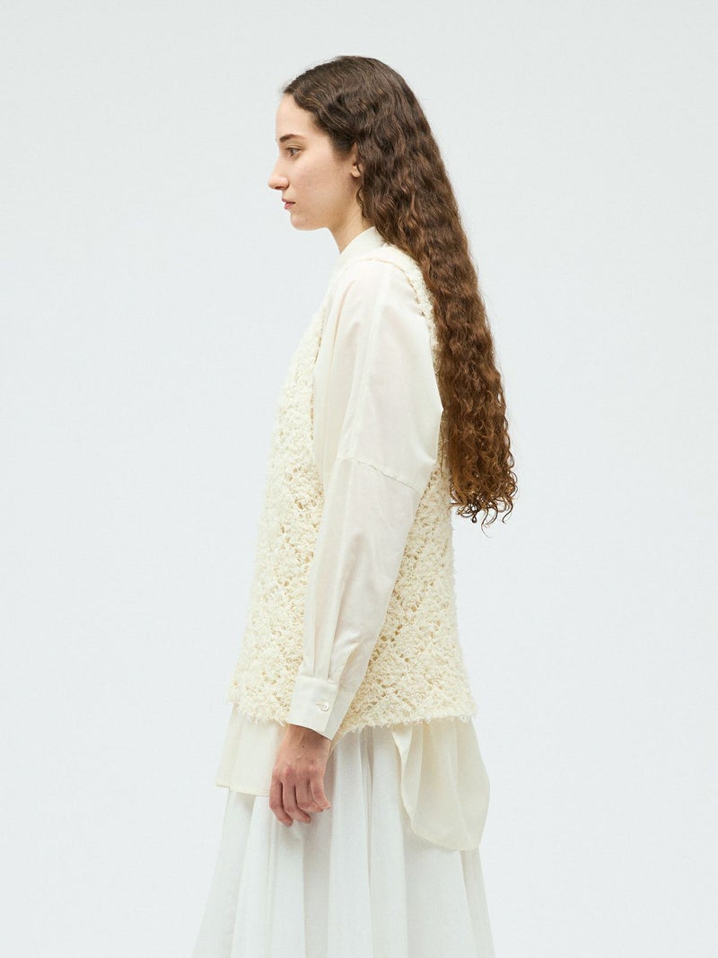 フリンジがついたテープヤーンをダイヤ柄で編んだパターンベストです。透け感と立体感のあるベストを表現しました。インナーの配色によって生地のダイヤ柄がより鮮明になります。同色でインナーを合わせても生地に特徴があるので重ね着を魅力的にしてくれます。少し長めのヒップ丈仕上げ。アームが広く重ね着がしやすいのがポイントです。軽さのあるニットアイテムでお洗濯もしていただけます。