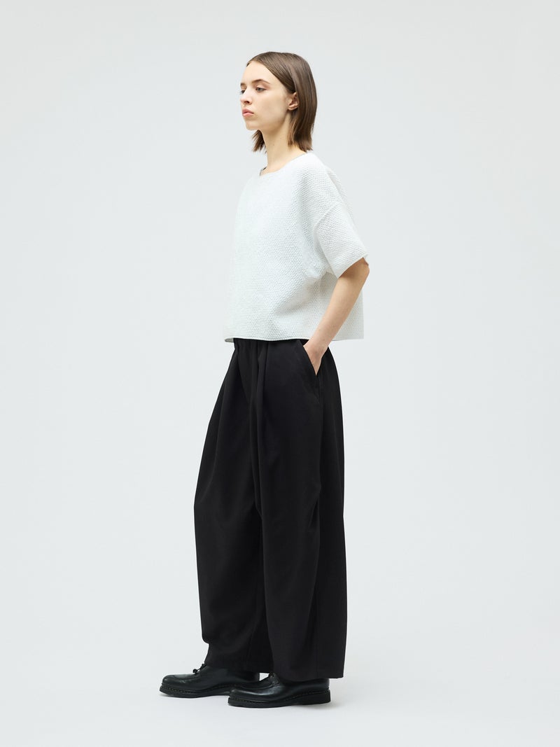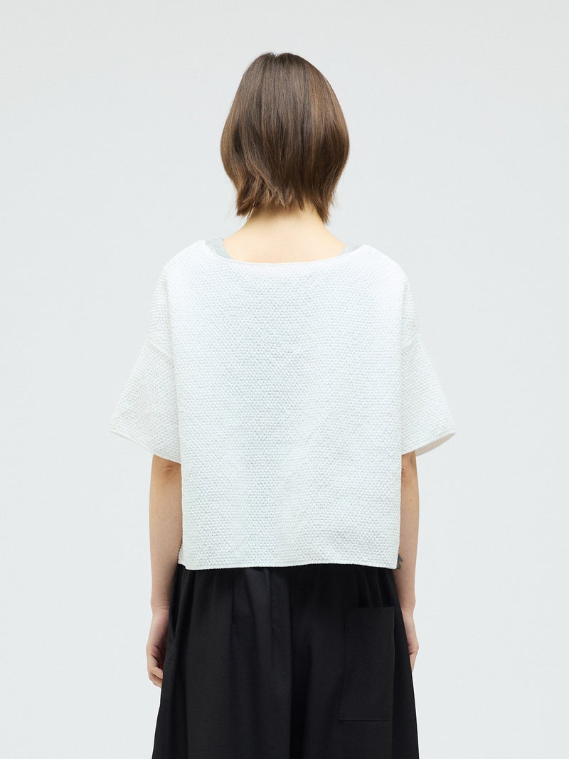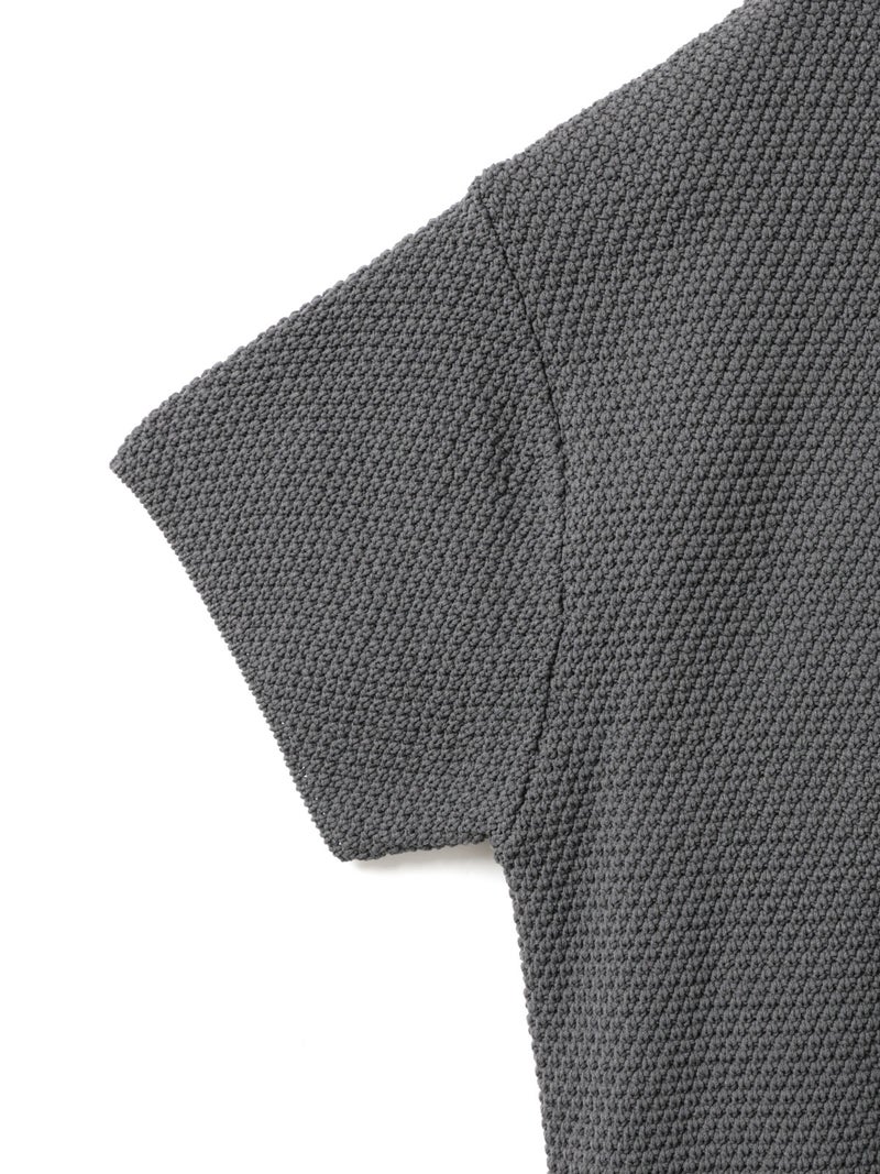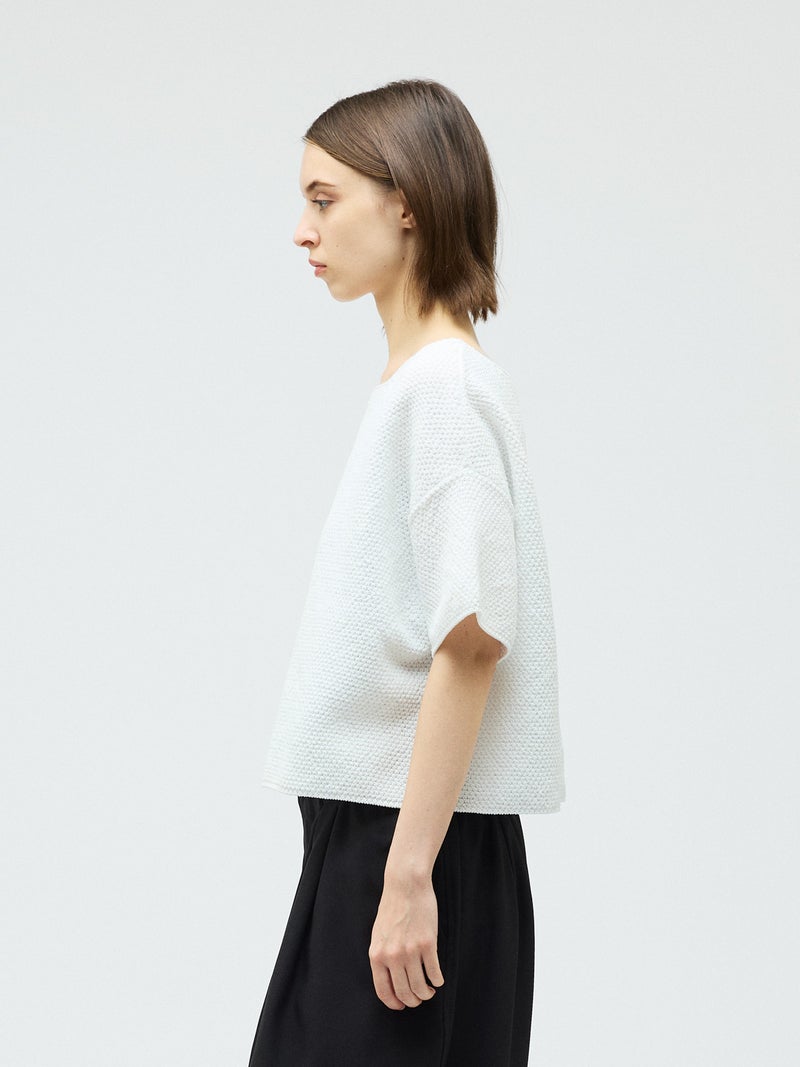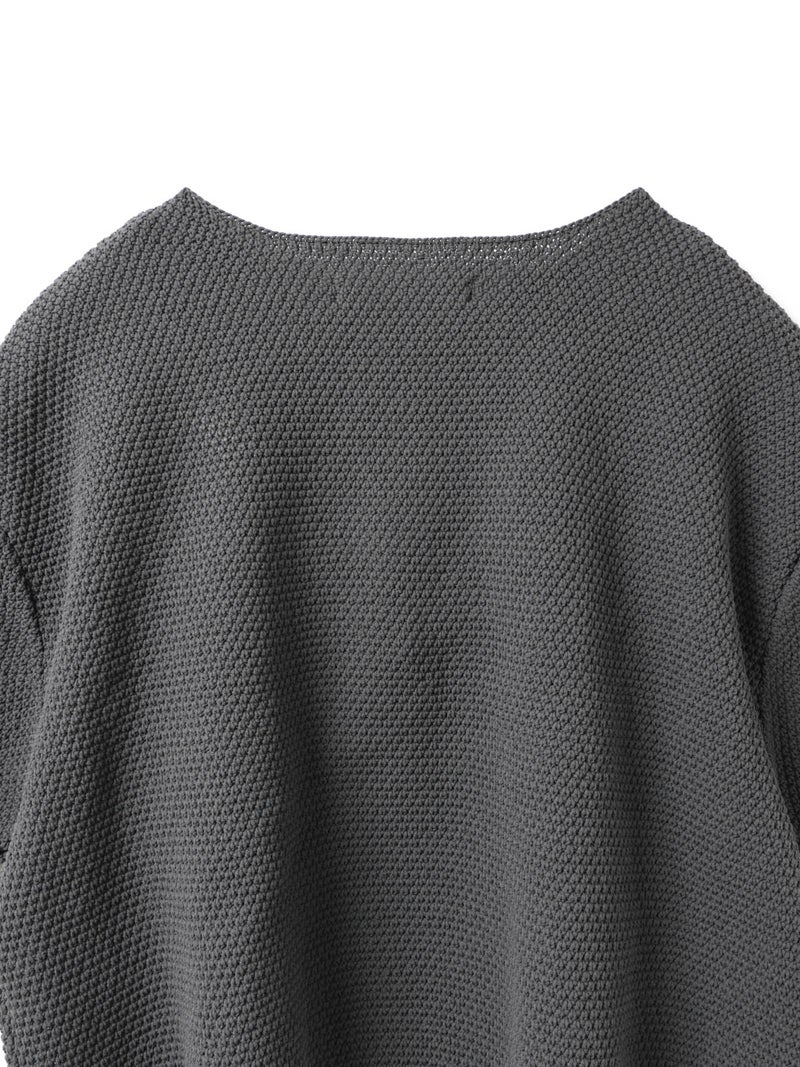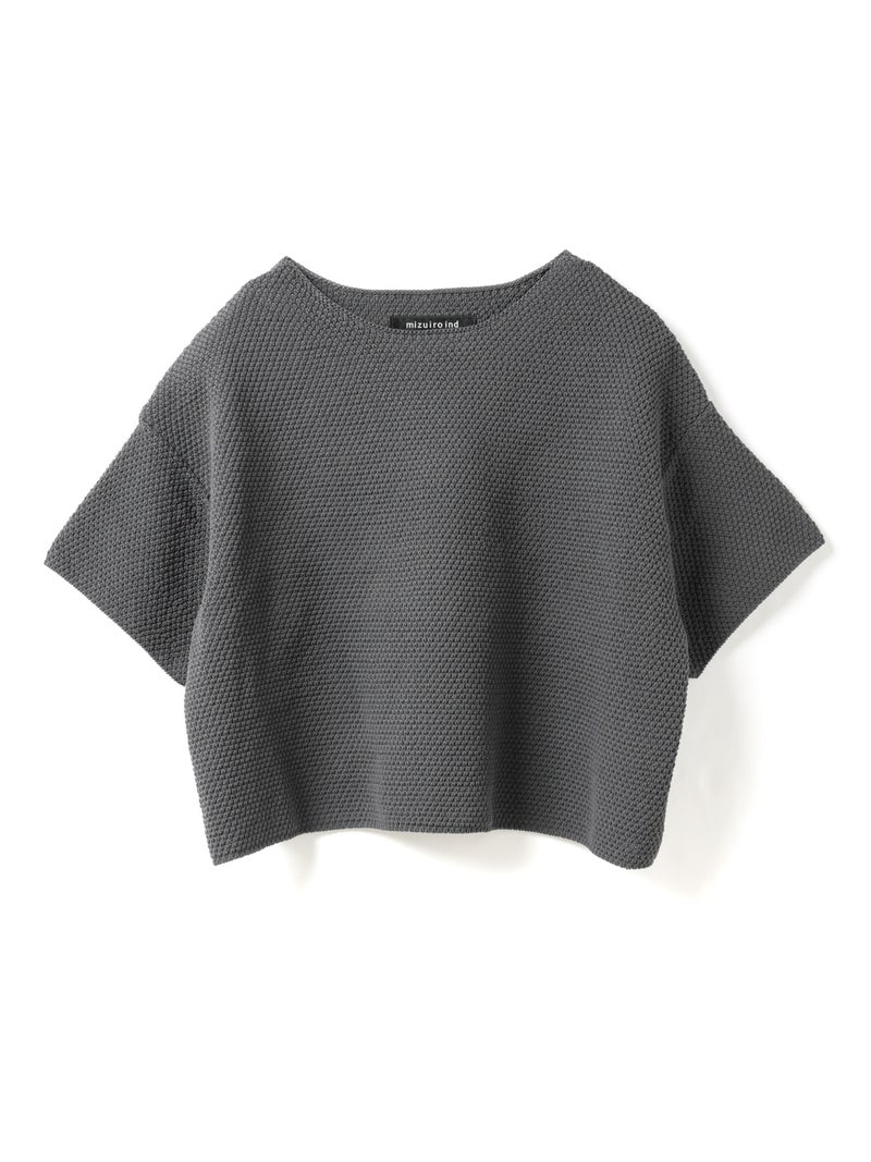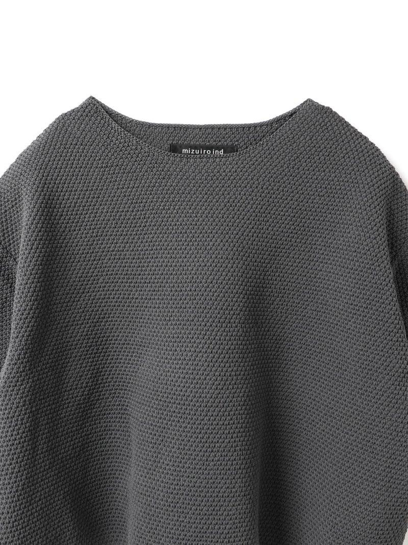 スポンジリリーヤーンの生地を使用したショートワイドプルオーバーです。軽くて丸みのある糸で編んでいることで表面にポコポコとした生地が特徴。速乾性がありストレッチのきいたニット地とは感じにくいシアーな着心地を感じられる1枚です。mizuiro indらしいワイドな身幅ですが、ショート丈のコンパクトなシルエットなので重ね着もお勧め。通気性が良いので夏場でも着用しやすいアイテムです。同シリーズ1-220075/ディープVネックベストも展開。