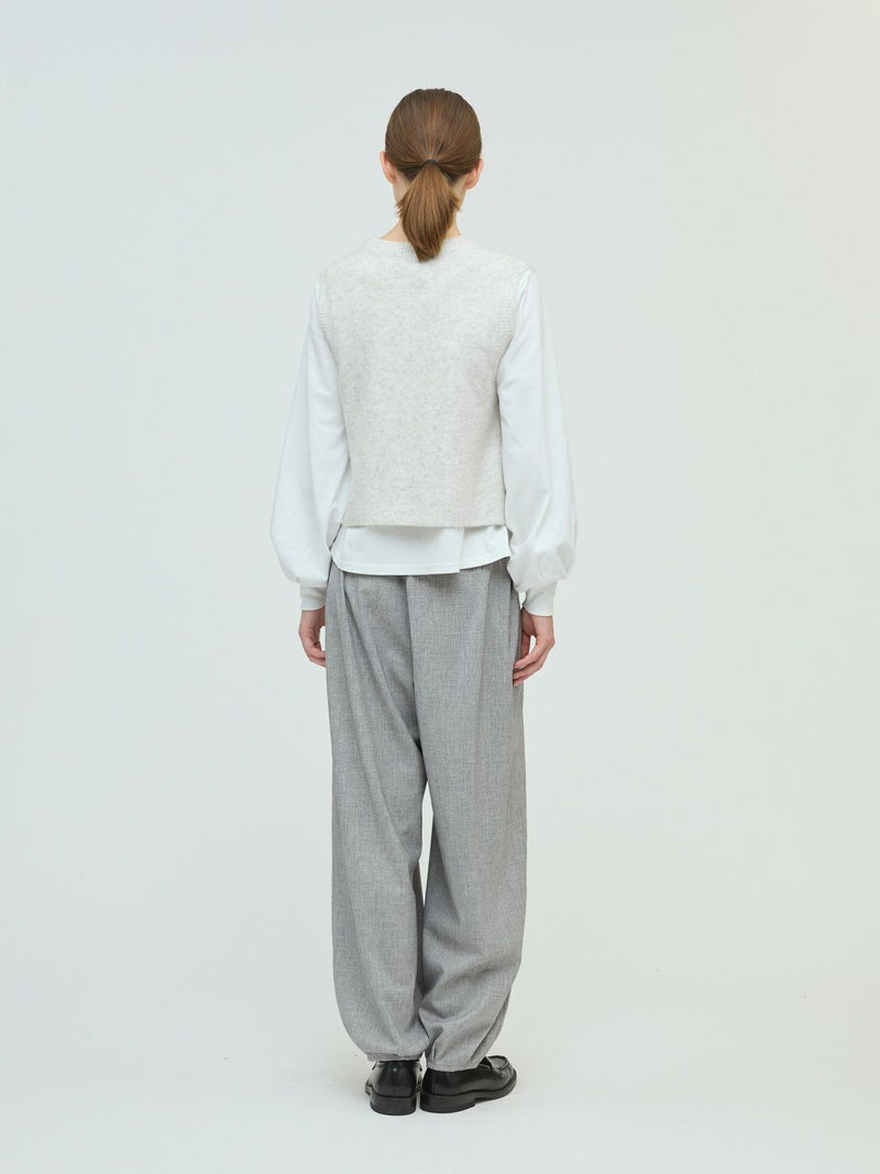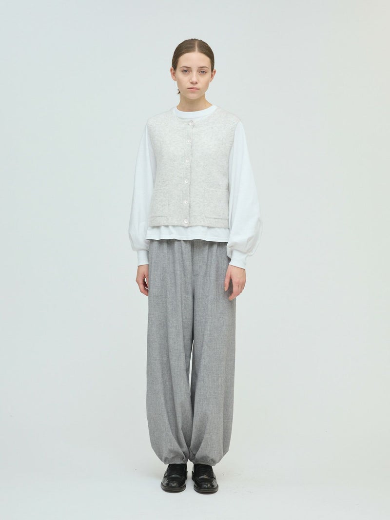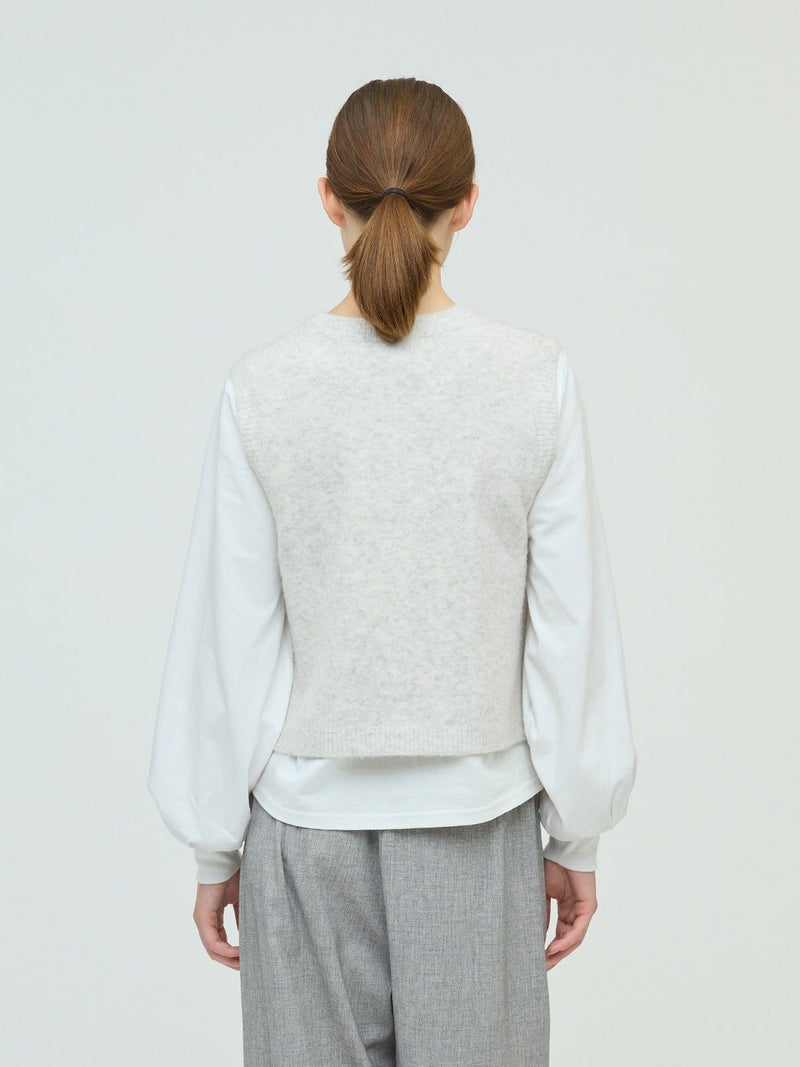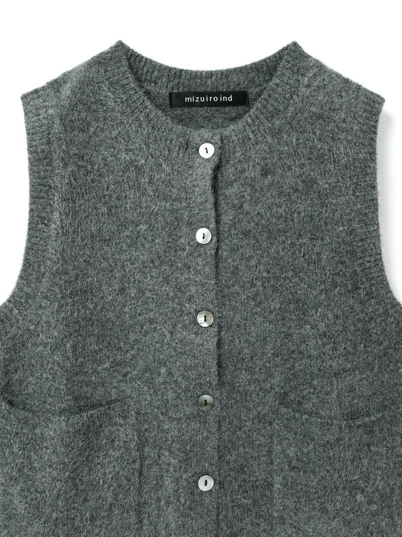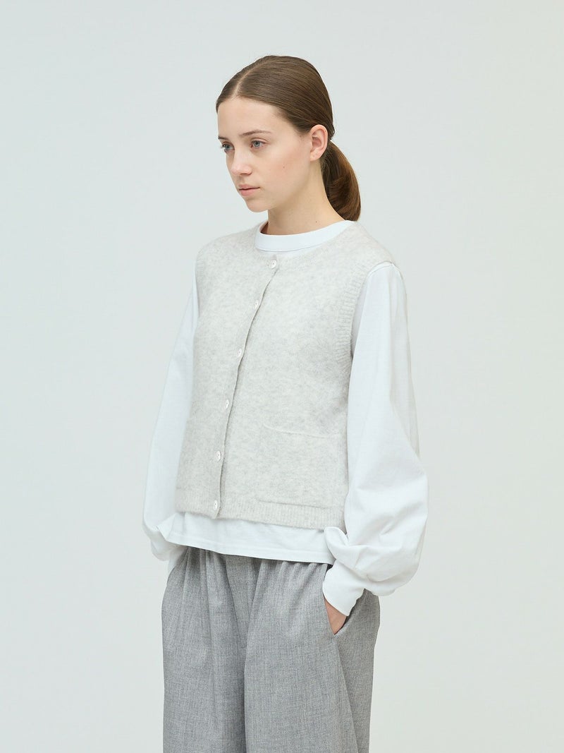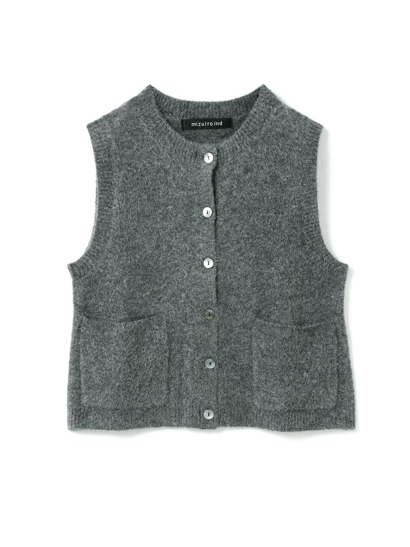 立体感のある独特な表情が魅力のブークレクルーネックベストです。ソフトな肌ざわりで着心地が良く、空気を含みやすく保温性に優れるアイテムで、寒さの増す秋冬ニットアイテムとしてお勧め。フロントボタンのベスト型のデザインは羽織ってもフロントを留めた二つの着こなしを楽しんでいただけます。合わせるアイテムによってコーディネートを変化していただけます。ポケット付。ウォッシャブル対応でシワになりにくく型崩れしにくいのでお洗濯がしやすいのもポイントです。同シリーズ3-220109/襟付きショートカーディガンも展開。
