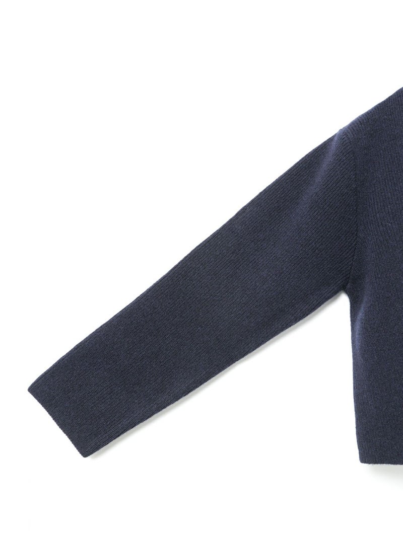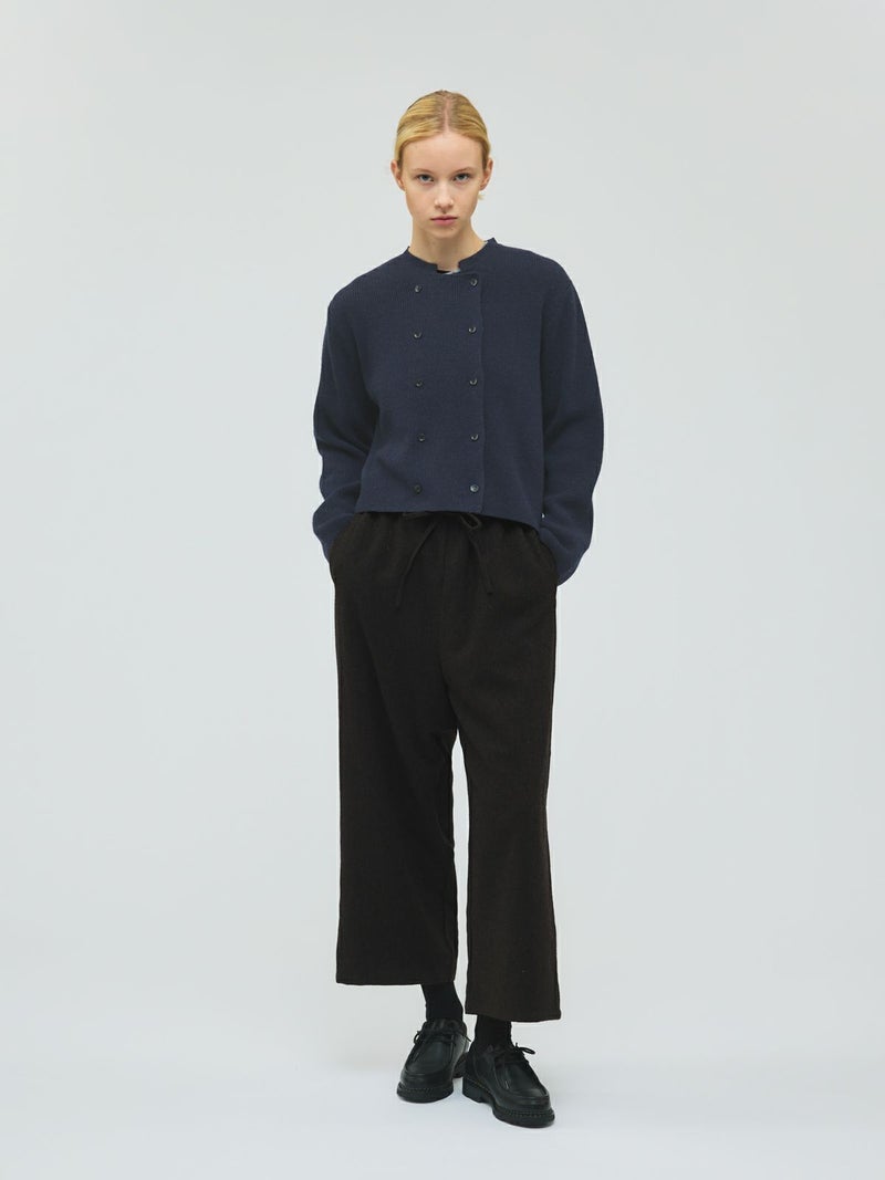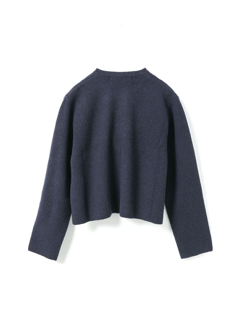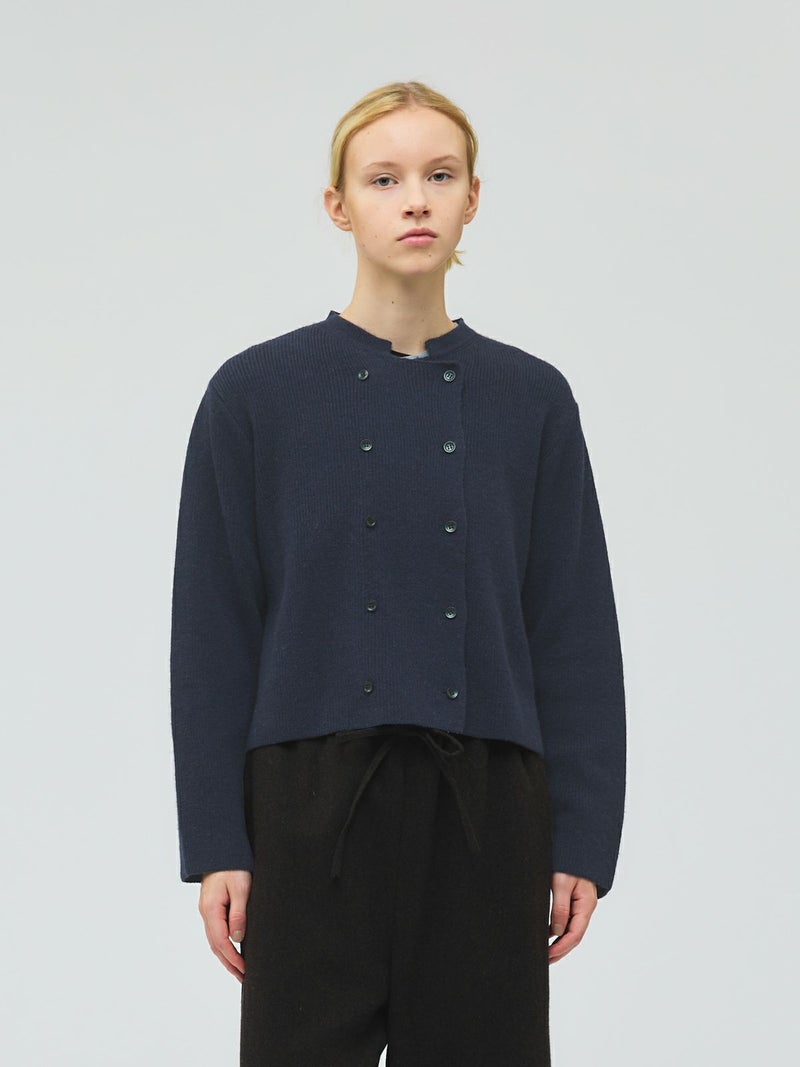シェットランドウールのような、ふっくらとした生地感が特徴のダブルブレストカーディガンです。ダブルブレストの重厚感があるデザインは、クラシックで清楚な雰囲気を印象付けています。ウール100%でウォーム感のある大変温かな1枚で、寒い時期に重宝できるアイテムです。ボタンを開けても閉めてもよく、並列に並んだボタンの配置が特徴。ヒップ上のすっきりとした身丈でボトムともバランスよく着こなすことができます。手洗い可能なニット生地の羽織りアイテムとなっています。