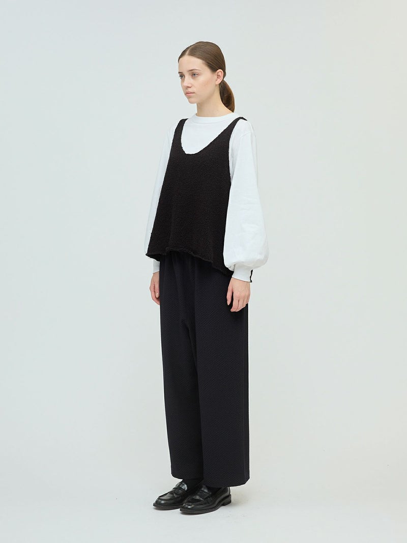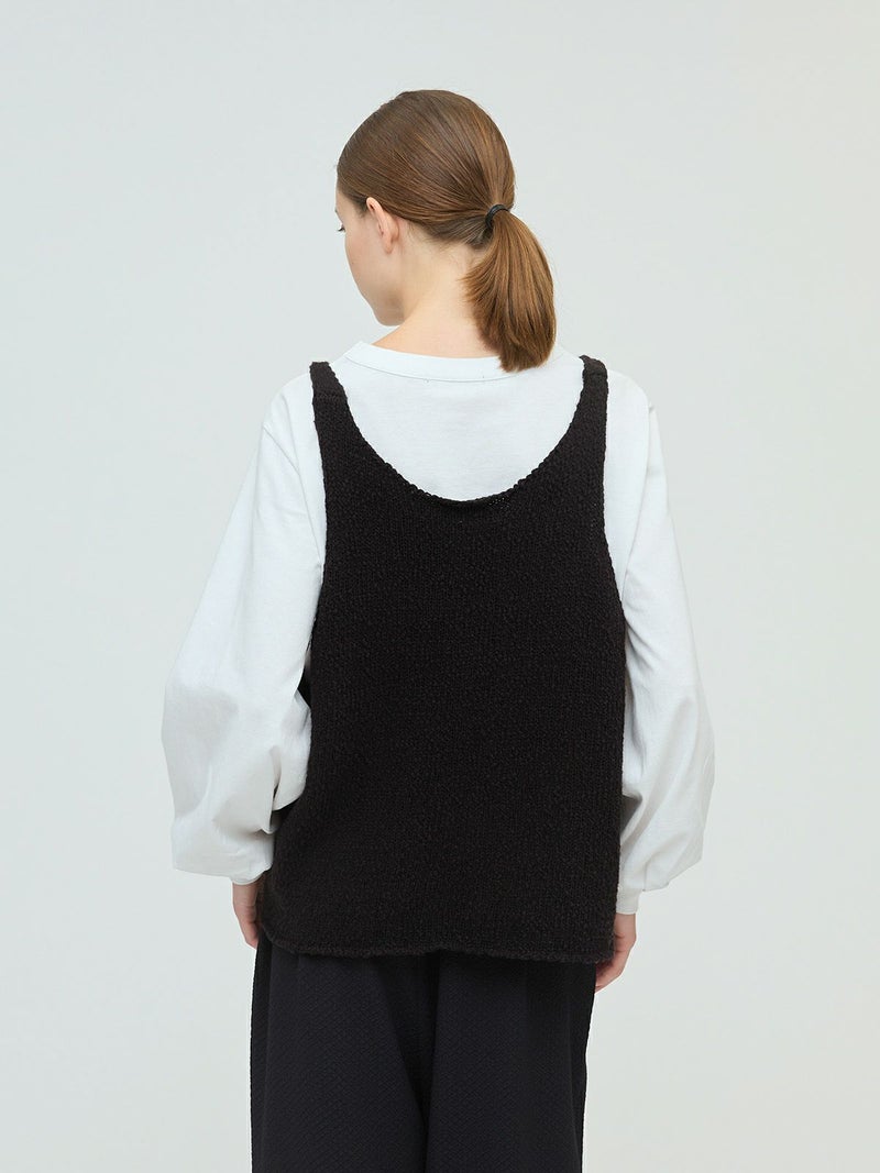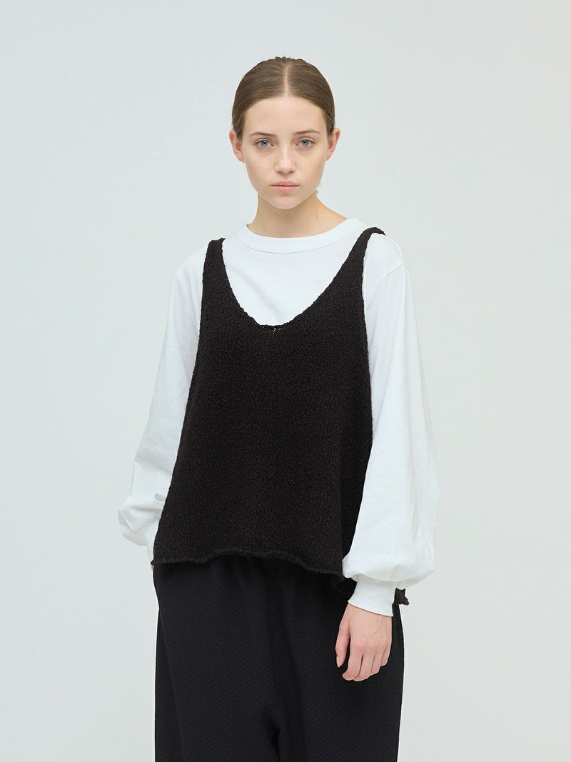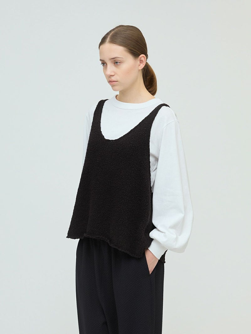 肉厚でスラブ感のあるキャミソール型をイメージしたリリーヤーンベストです。パイル調のスラブ糸の凸凹とした生地感が特徴。アームも広く肩幅の細いデザインなのですっきり感もありインナー見えのするベストになっています。重ね着がしやすく、色々なアイテムにレイヤードしていただけます。秋冬のニットシリーズとして同じスラブニットを使用した3-220116/リリーヤーンVネックカーディガンも展開。