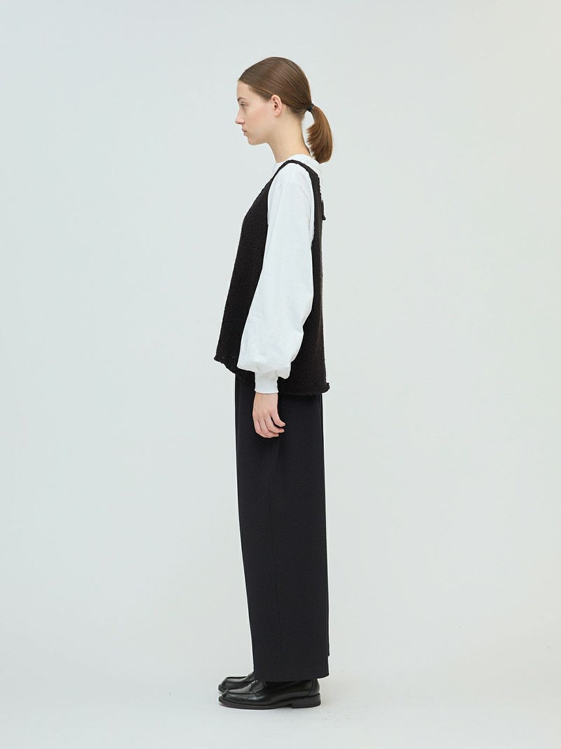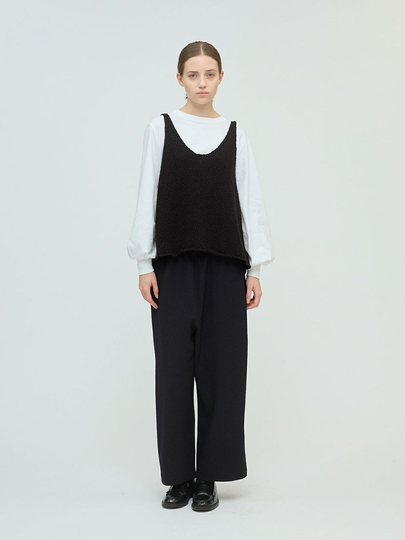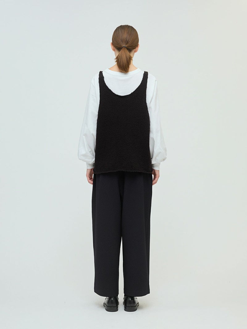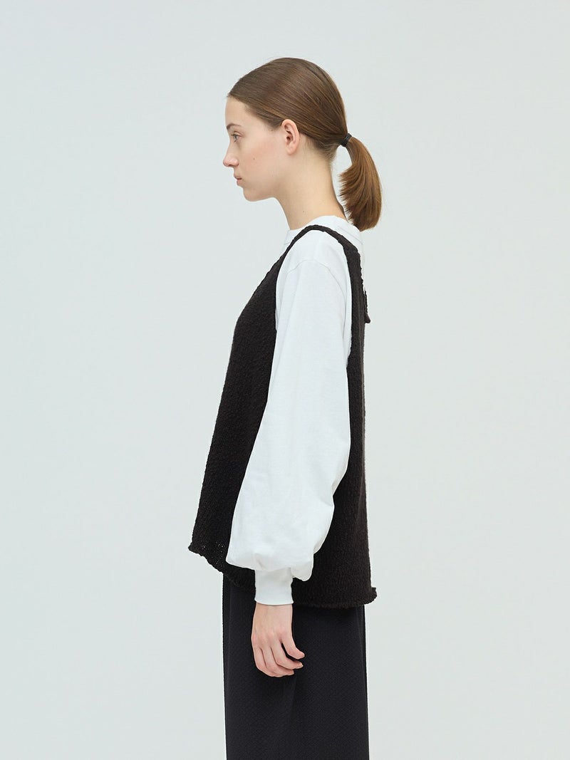 肉厚でスラブ感のあるキャミソール型をイメージしたリリーヤーンベストです。パイル調のスラブ糸の凸凹とした生地感が特徴。アームも広く肩幅の細いデザインなのですっきり感もありインナー見えのするベストになっています。重ね着がしやすく、色々なアイテムにレイヤードしていただけます。秋冬のニットシリーズとして同じスラブニットを使用した3-220116/リリーヤーンVネックカーディガンも展開。