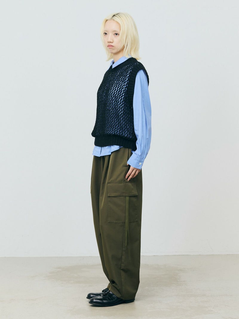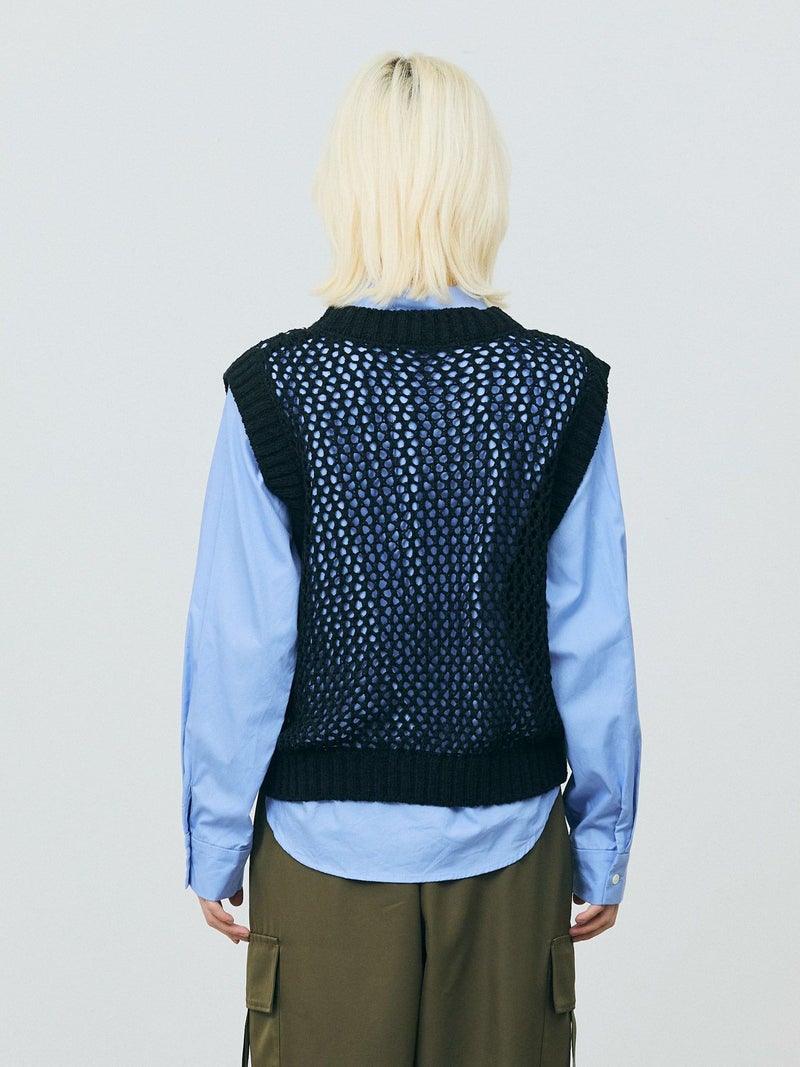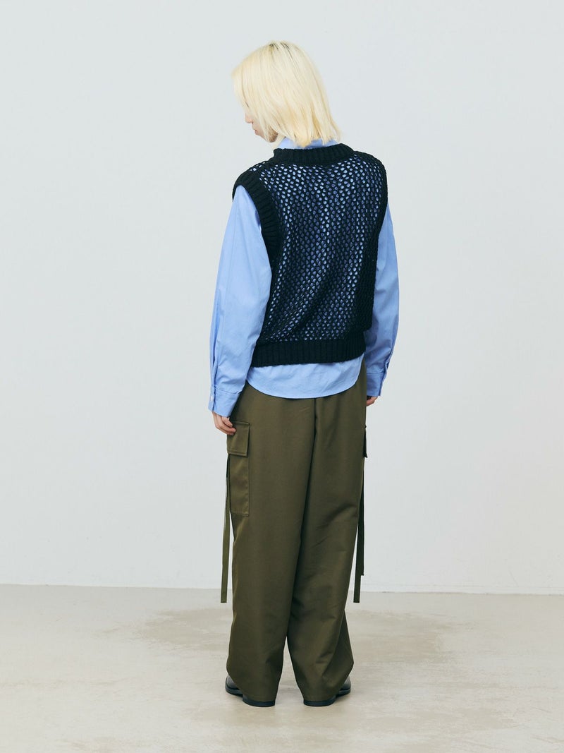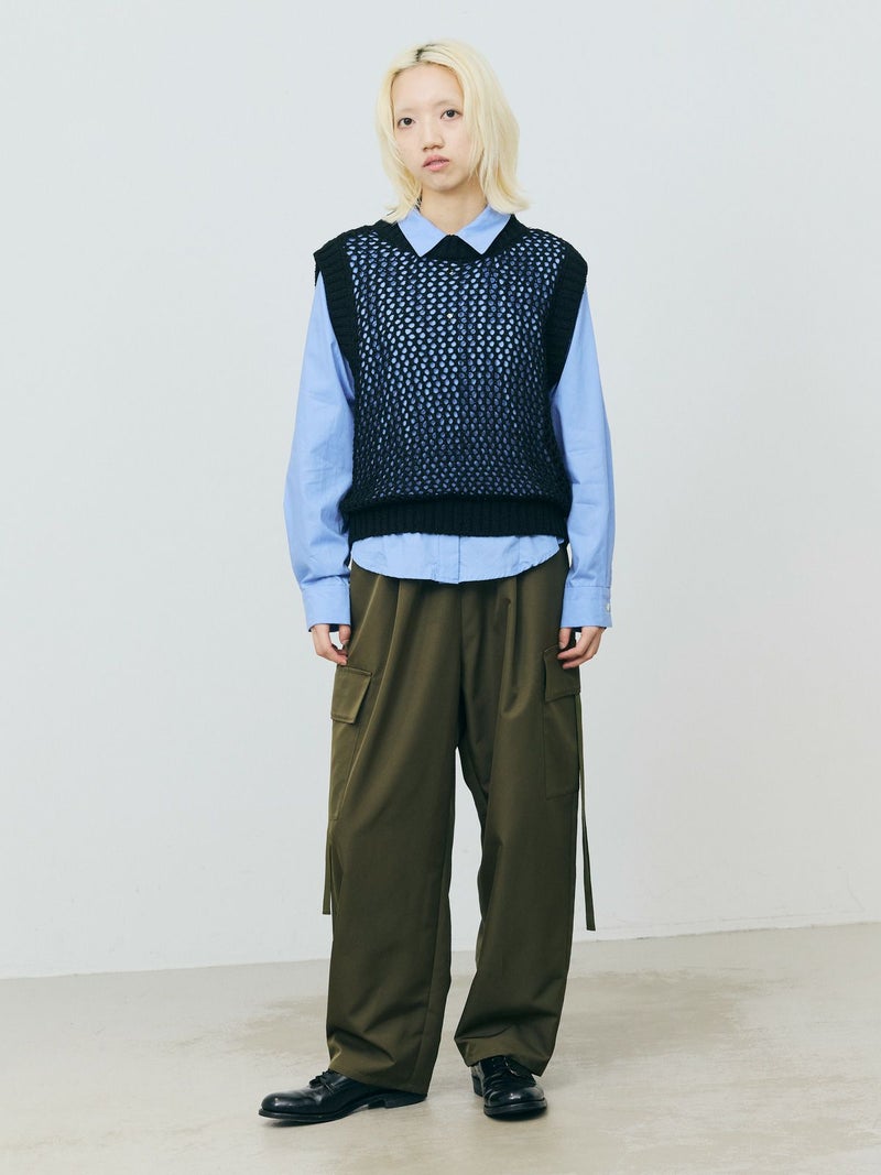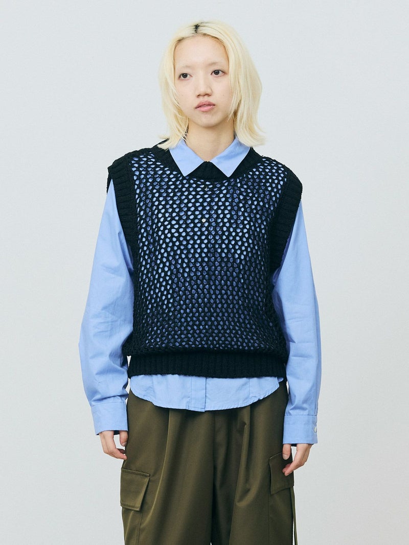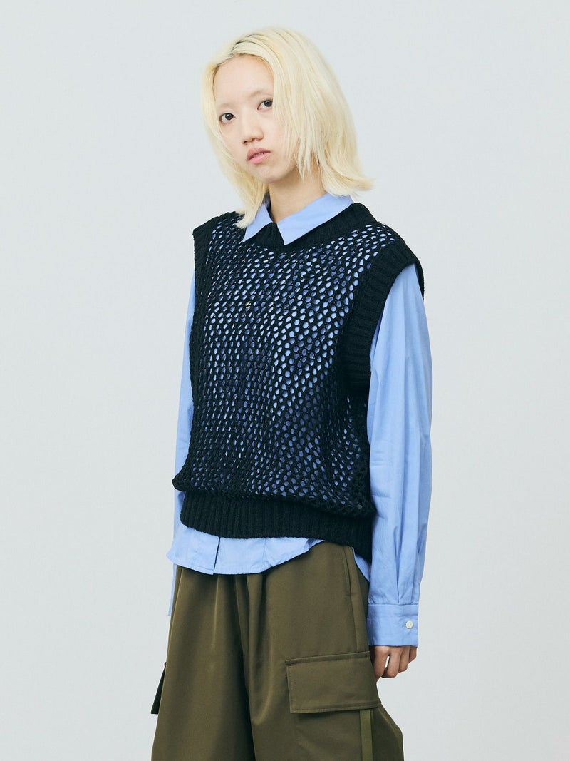 テープヤーン(意匠糸)を使用したテープヤーンメッシュベストです。ざっくりとしたメッシュ編みにすることで、清涼感があり1枚で存在感があるニットを表現しました。どのアイテムとコーディネートしても合わせやすいシンプルなデザインなので、季節の変わる時期のコーディネートにおすすめ。合わせるインナーによって長く着用していただけます。首元と袖口は太目のリブ仕上げ。柔らかくて軽さのあるニット地で着心地の良さも体感していただける1枚です。同シリーズ3-820047/テープヤーンメッシュプルオーバーも展開。