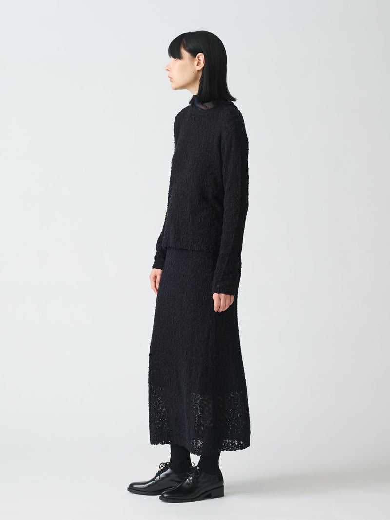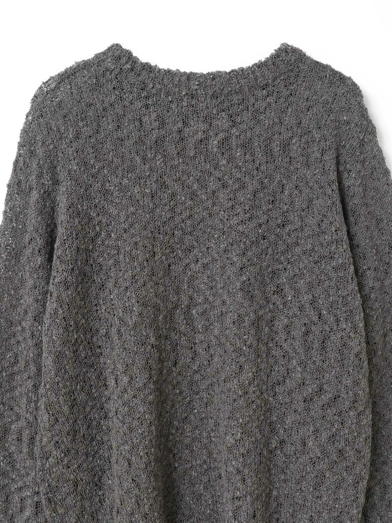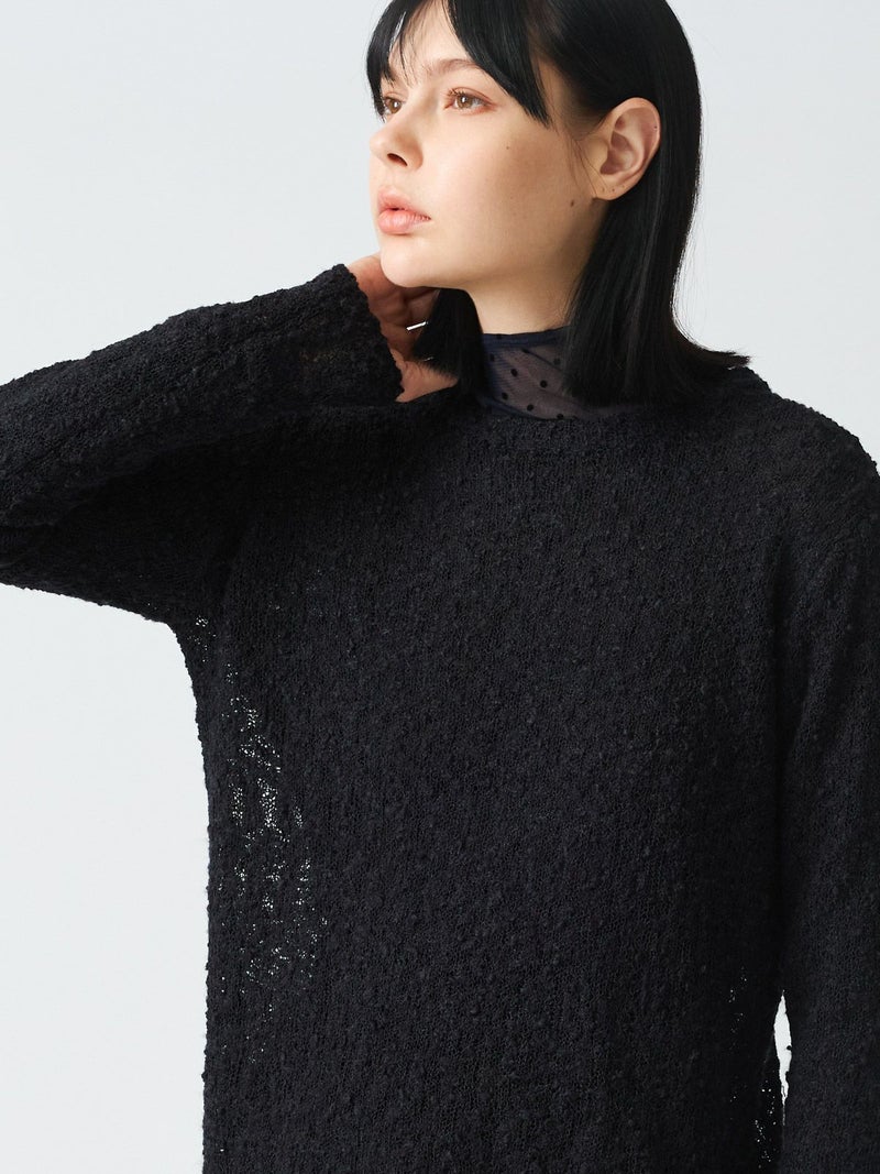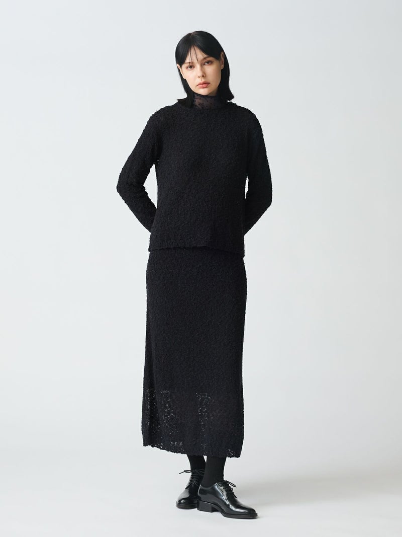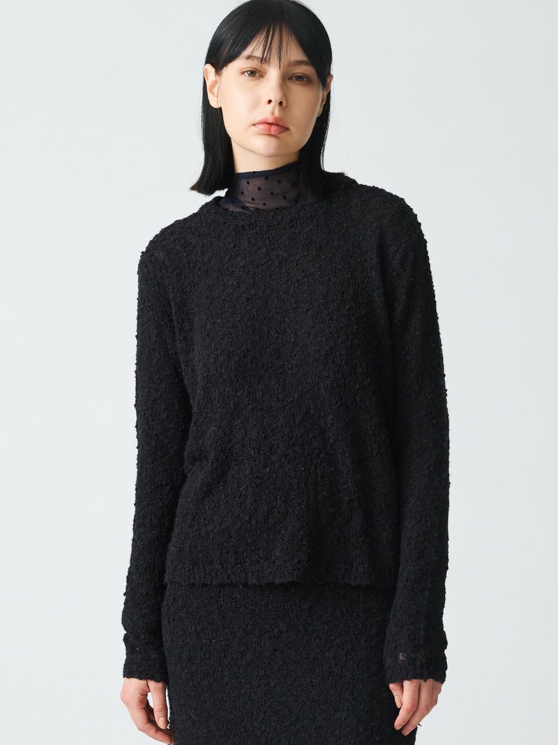 スラブ糸のヘアリー素材を使用したスラブヤーンクルーネックプルオーバーです。ぼこぼことした透け感のある編立てを施したニット地が特徴。程よくゆとりのあるサイズ感です。色・柄の透け感を楽しんでいただけるのでインナー使いに変化をつけた着こなしがお勧めです。同シリーズ4-260035/ロングスカートも展開。
