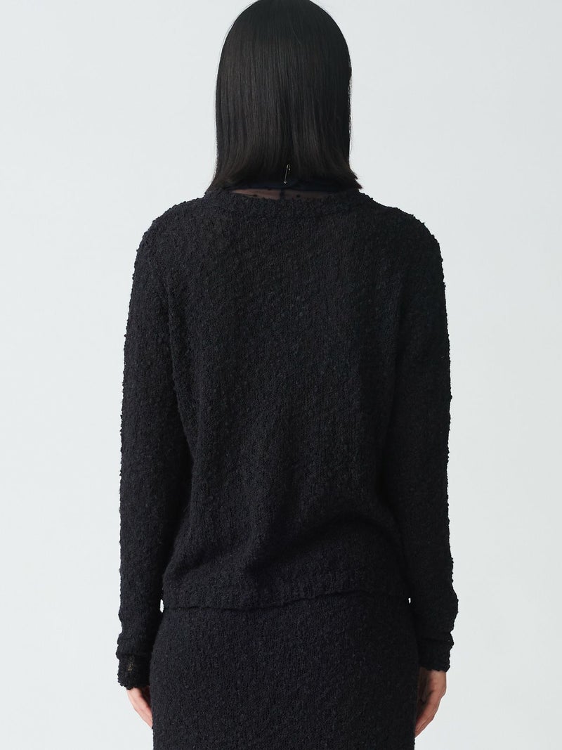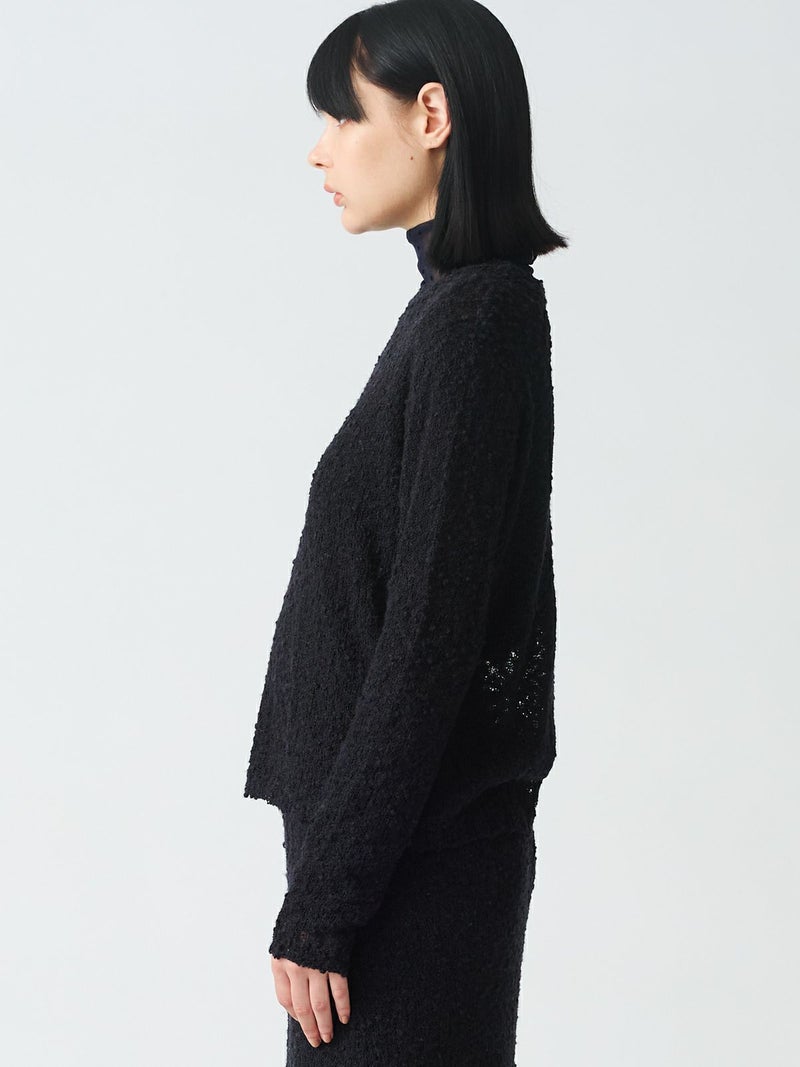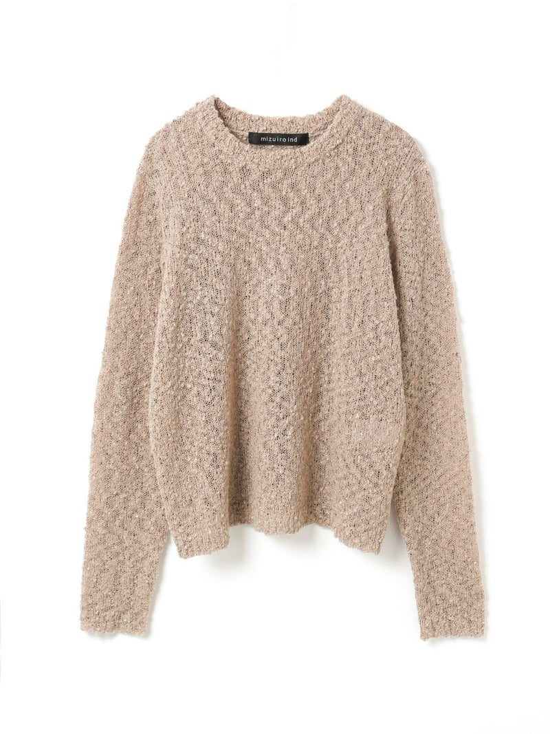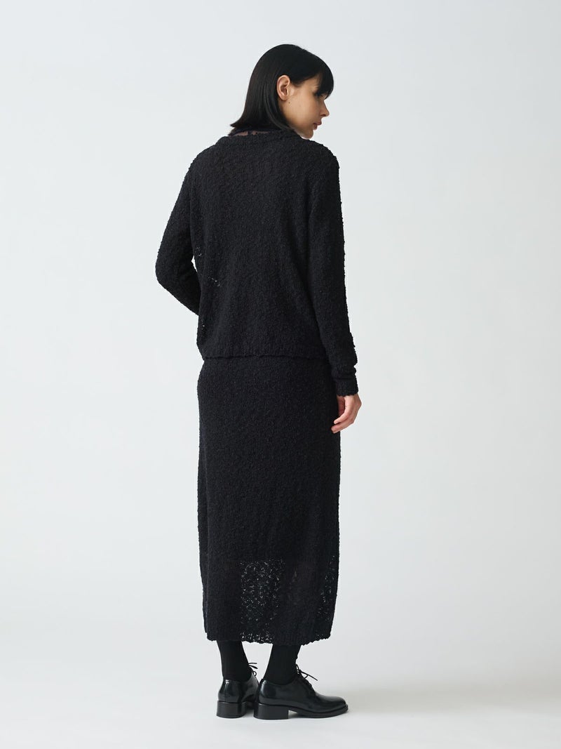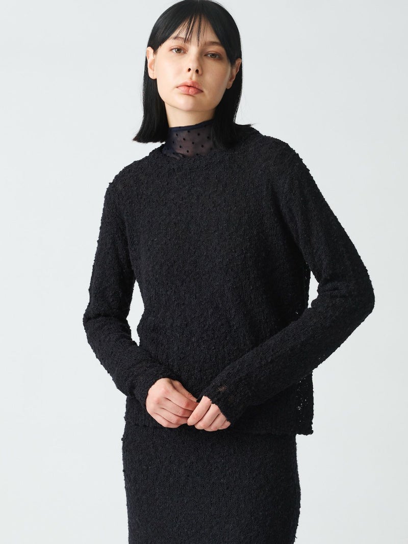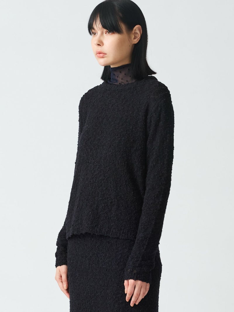 スラブ糸のヘアリー素材を使用したスラブヤーンクルーネックプルオーバーです。ぼこぼことした透け感のある編立てを施したニット地が特徴。程よくゆとりのあるサイズ感です。色・柄の透け感を楽しんでいただけるのでインナー使いに変化をつけた着こなしがお勧めです。同シリーズ4-260035/ロングスカートも展開。