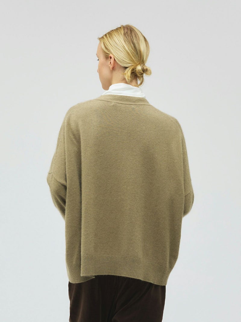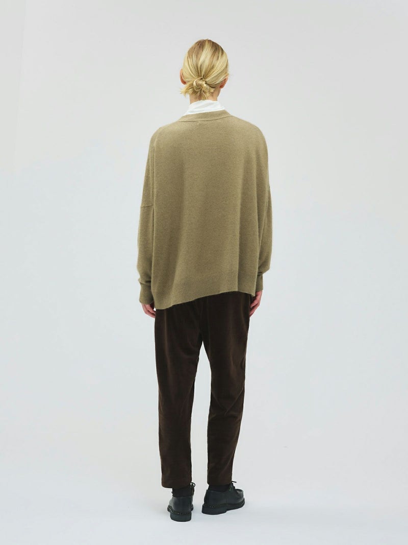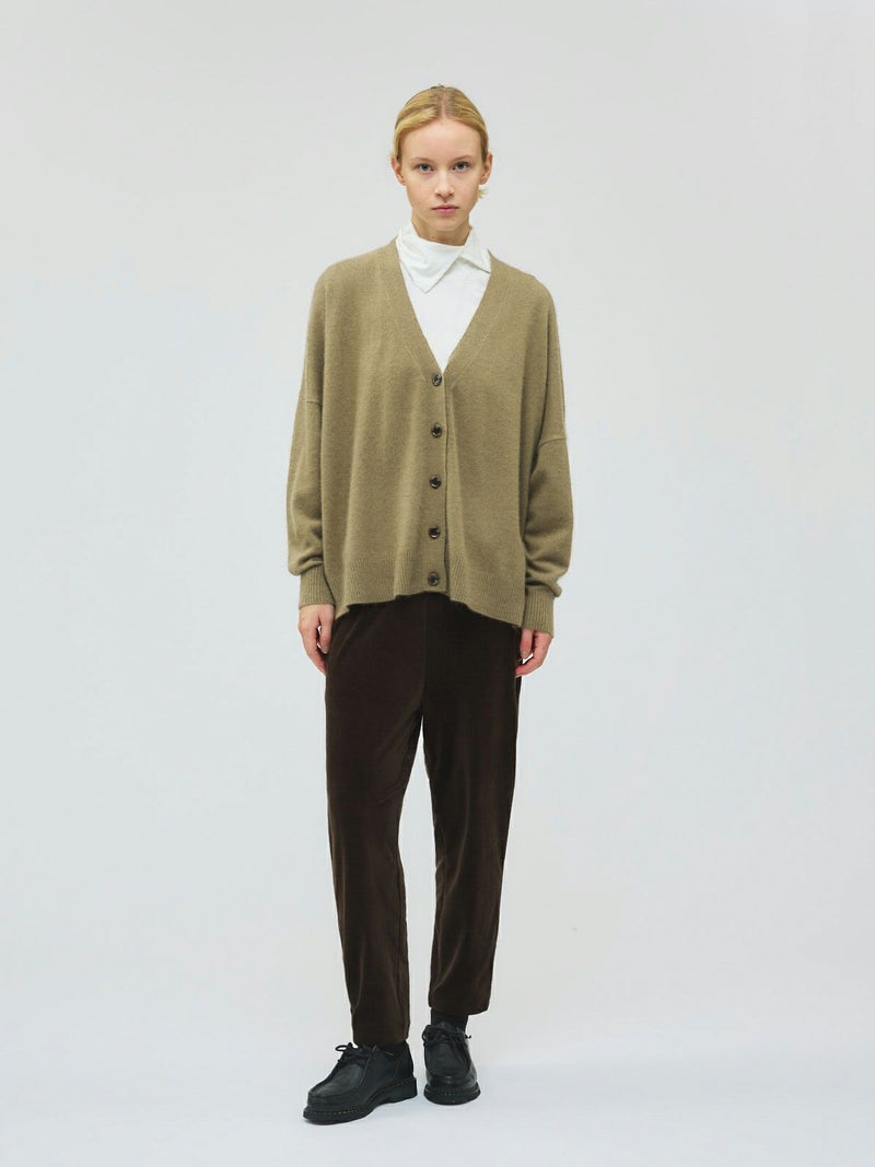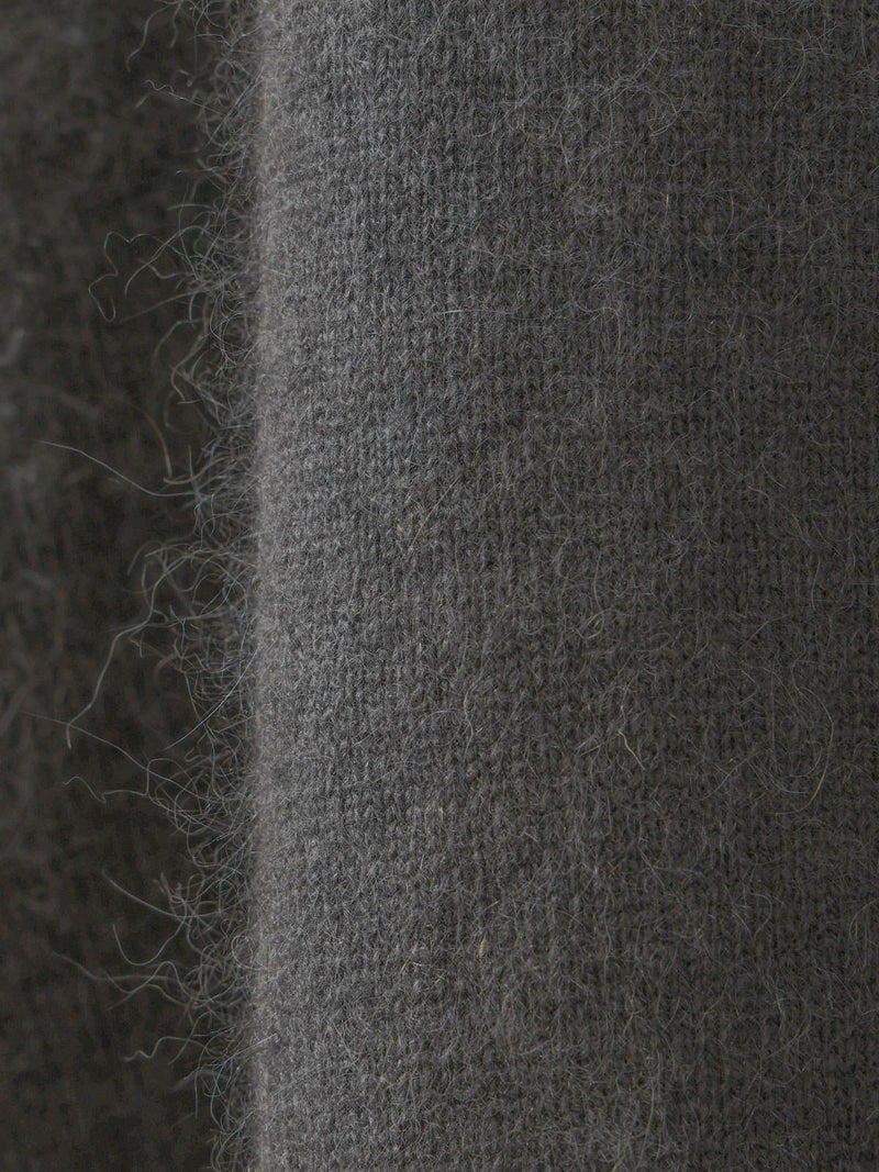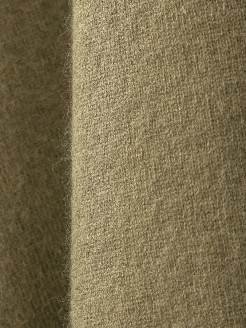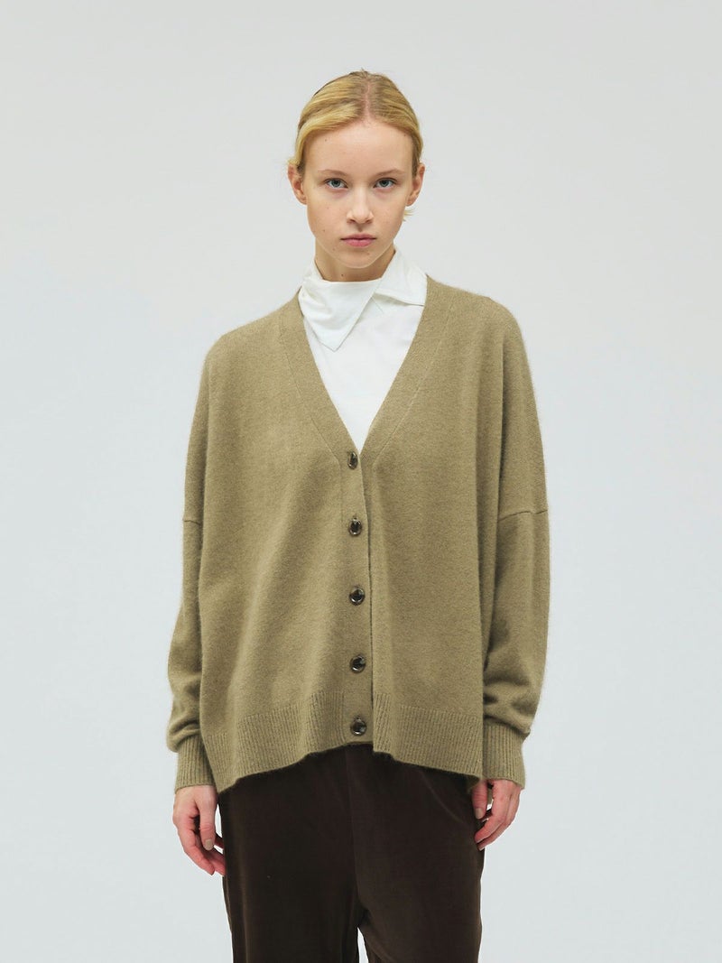 カシミアのような柔らかさのシャギーニット生地を使用したVネックカーディガンです。袖口はリブ使いになっておりフィット感のあるデザイン仕上げ。ヒップに掛かるくらいの丈感です。シンプルなVネックの羽織りアイテムなので、色々なアイテムとベーシックにコーディネートしていただける1枚です。同素材を使用した4-220099/ハイゲージ襟付きプルオーバーも展開。