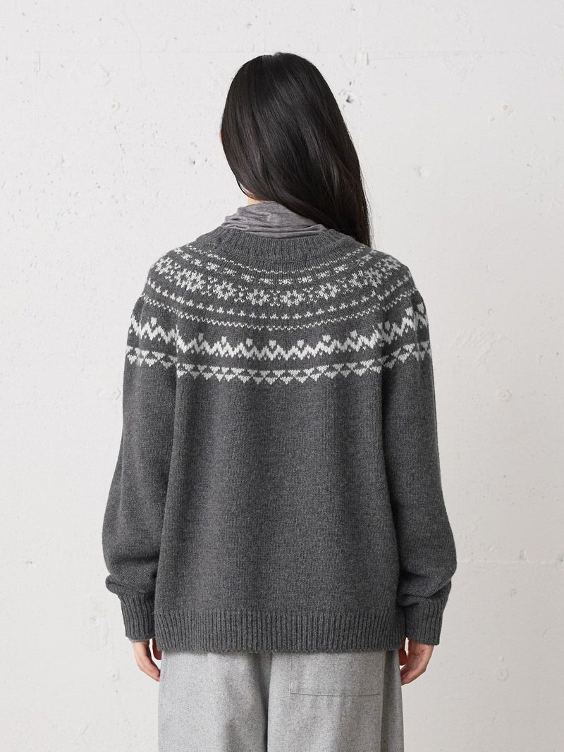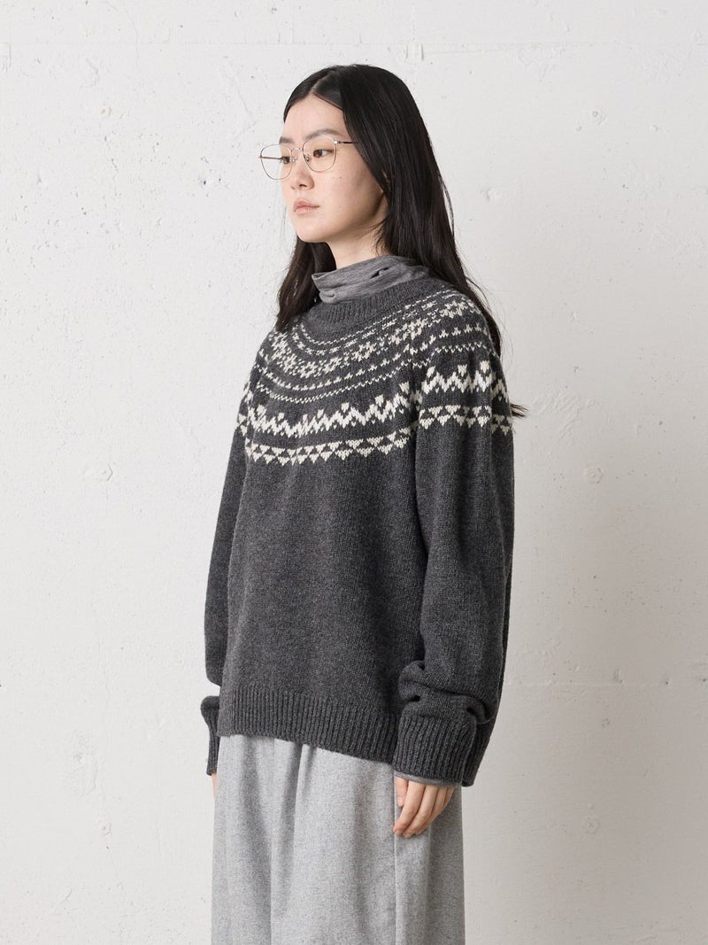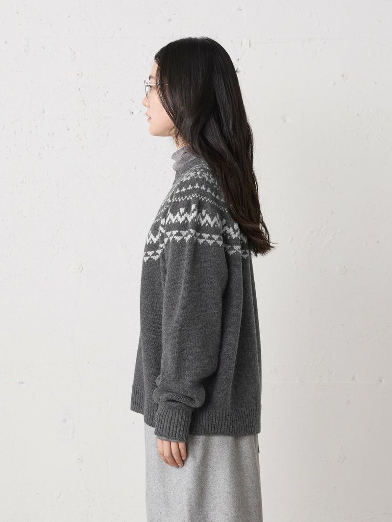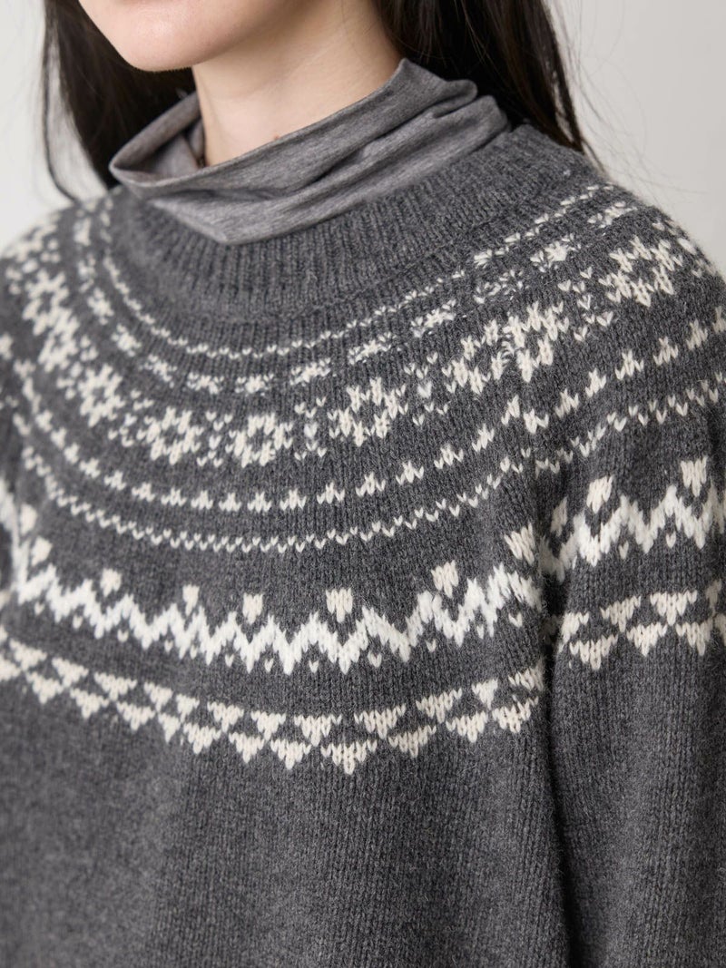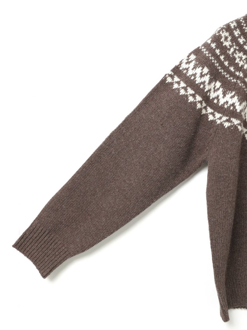 手編み風のざっくりとした風合いが魅力のノルディックニットプルオーバー。単色ながらも一部に特殊な糸を使用することで、立体感と奥行きのある表情に仕上げました。冬の定番・ローゲージのノルディック柄が印象的で、白の柄が映えるチャコールグレーとブラウンの2色展開です。ほどよくジャストなサイジングで、シャツをインしたレイヤードスタイルもおすすめ。デニムからスカートまで幅広いボトムに合わせやすく、寒い季節をあたたかく包み込む一枚です。同シリーズ4-729980/ノルディックニットカーディガンも展開中。