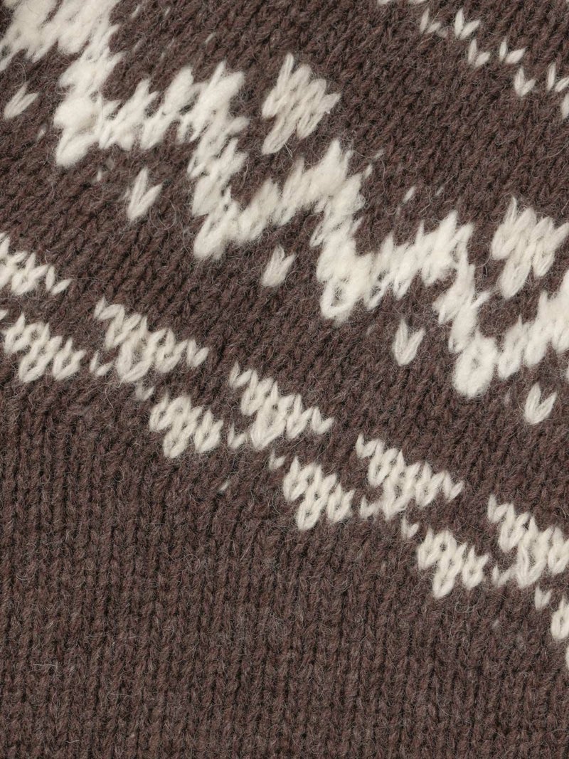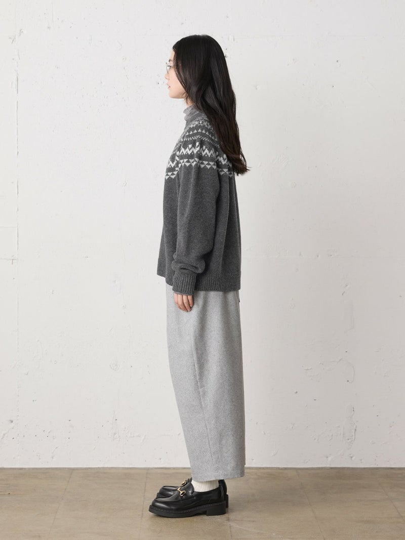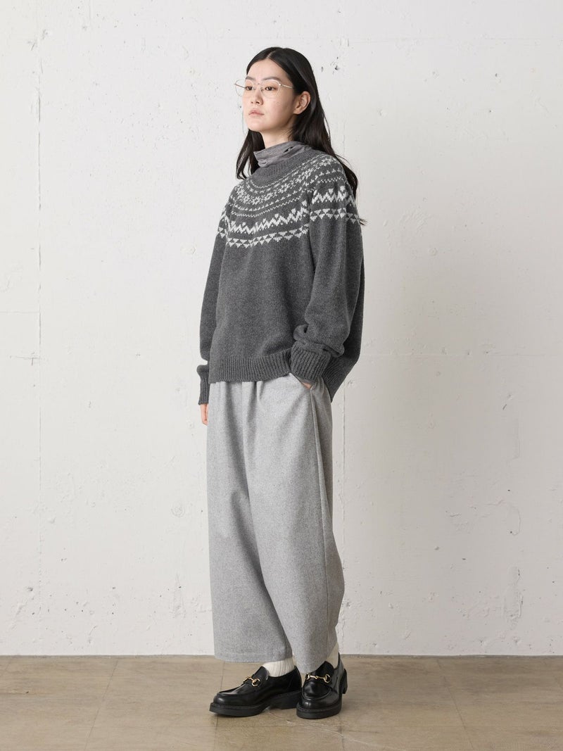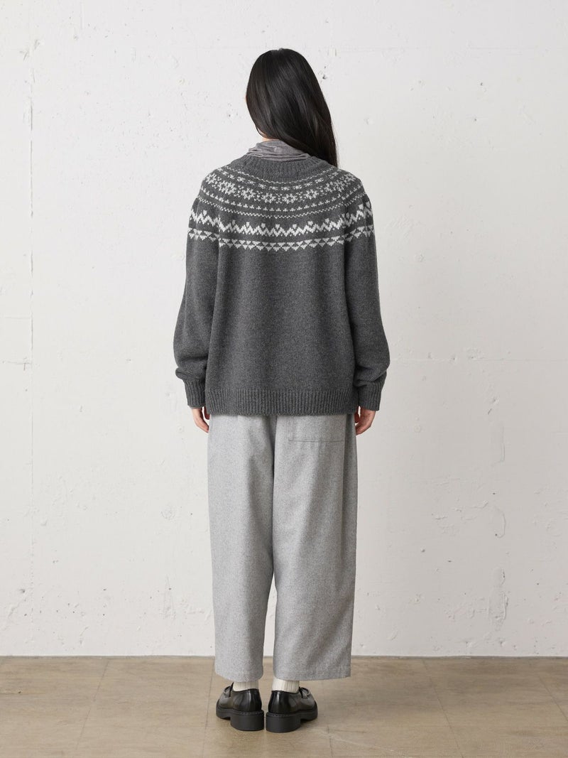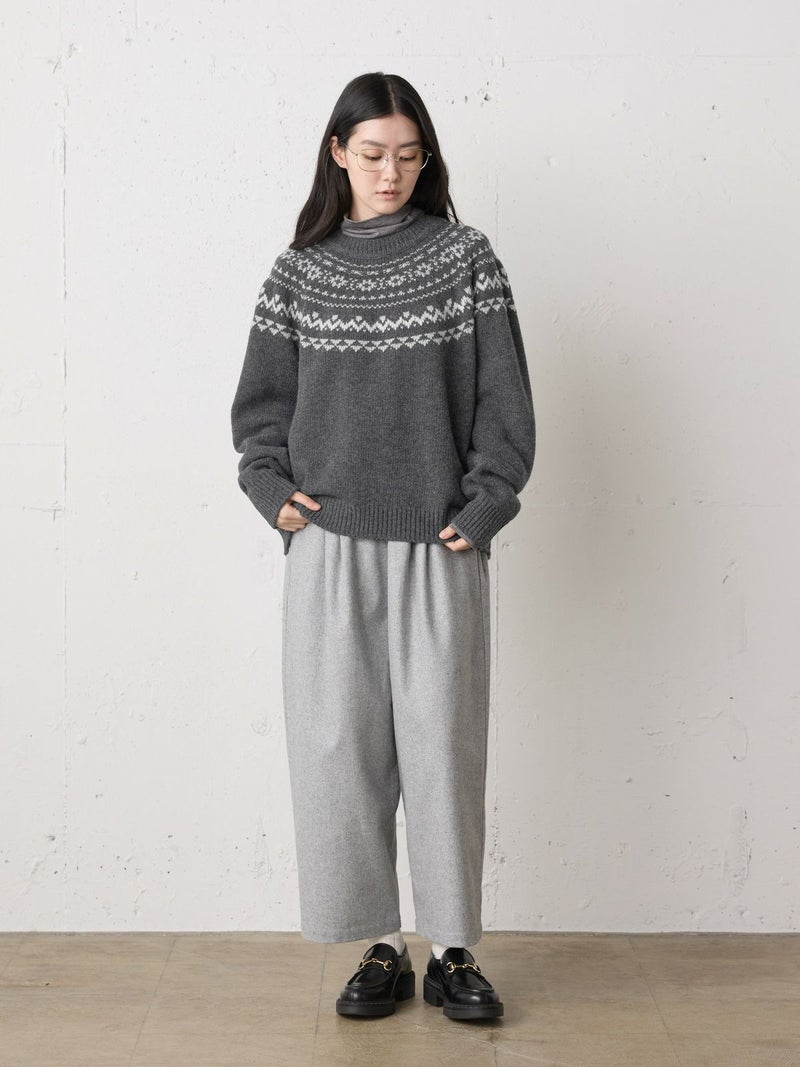 手編み風のざっくりとした風合いが魅力のノルディックニットプルオーバー。単色ながらも一部に特殊な糸を使用することで、立体感と奥行きのある表情に仕上げました。冬の定番・ローゲージのノルディック柄が印象的で、白の柄が映えるチャコールグレーとブラウンの2色展開です。ほどよくジャストなサイジングで、シャツをインしたレイヤードスタイルもおすすめ。デニムからスカートまで幅広いボトムに合わせやすく、寒い季節をあたたかく包み込む一枚です。同シリーズ4-729980/ノルディックニットカーディガンも展開中。
