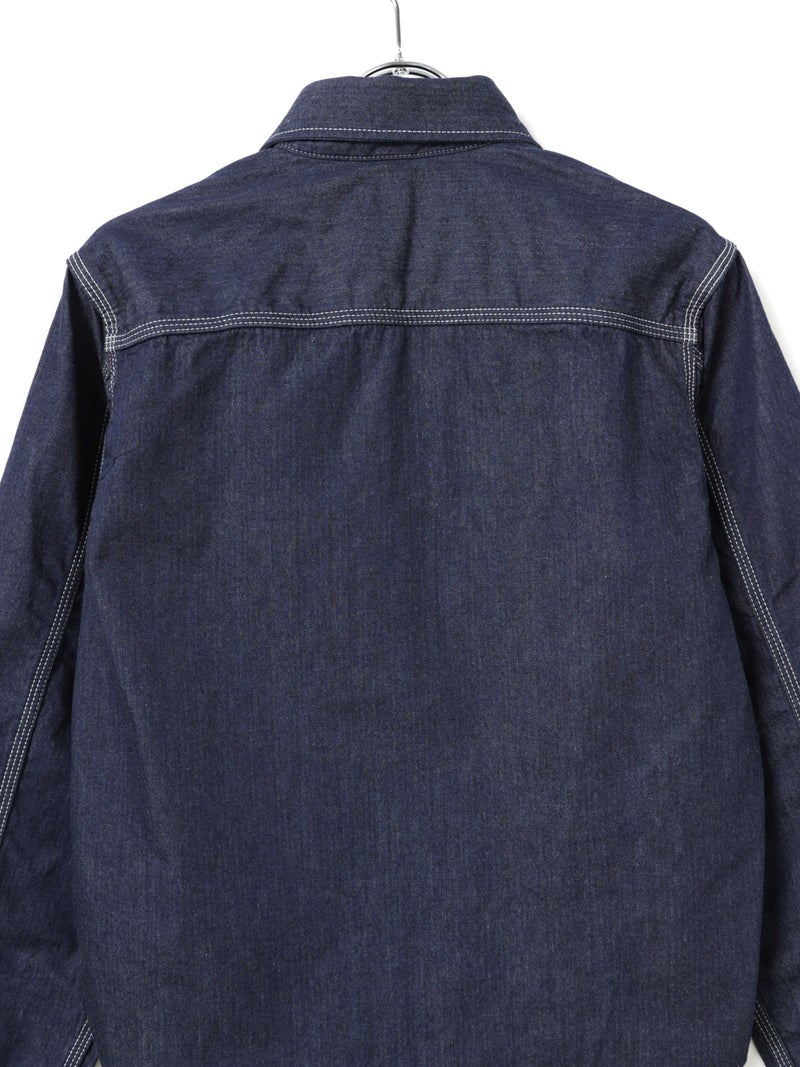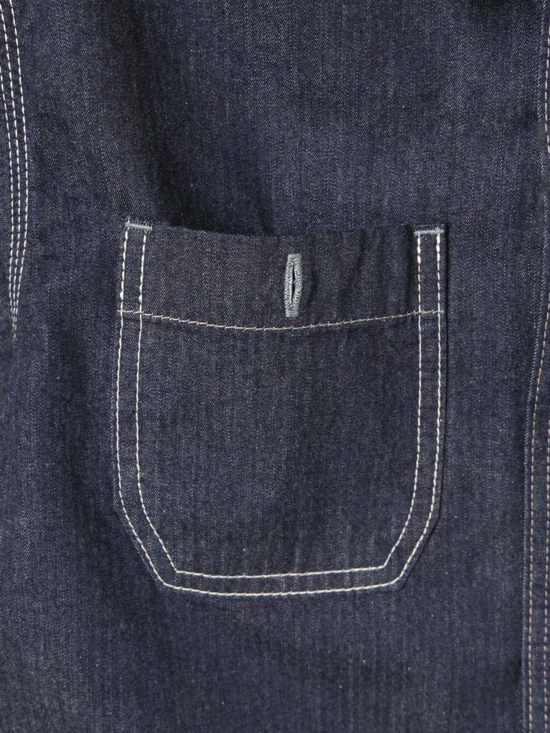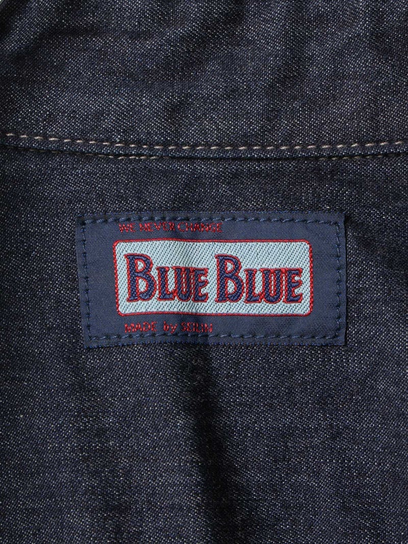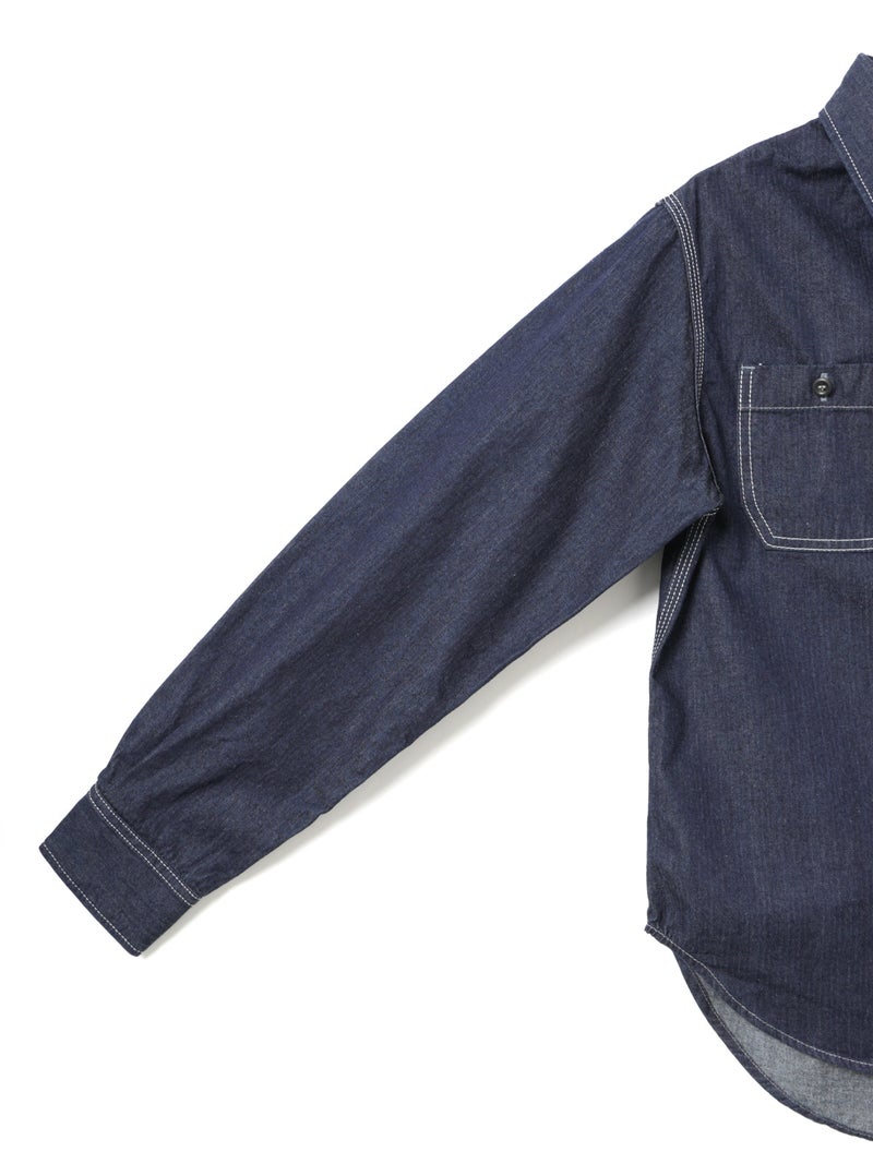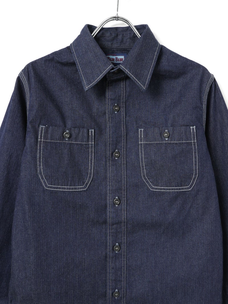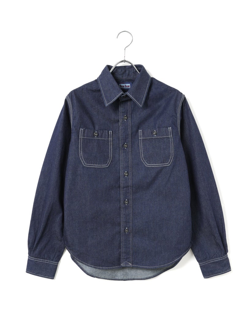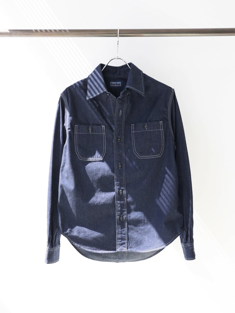 BLUE BLUEオリジナルデニムを使用した、ベーシックなワークシャツ。7ozのライトデニムは、糸の打ち込み本数を増やすことでハリとコシを持たせつつ、軽やかな着心地に仕上げたタフな素材感が魅力。長く着込むほどに風合いの変化も楽しめます。トリプルステッチでワーク感を高めながら、程よくゆとりのあるシルエットと上品なデニムの表情で、カジュアルになり過ぎないバランスに。着込んだような色合いと自然なシワ感もポイント。身長160cm前後で、すっきりとした細身のシルエットMサイズ程度の着用感です。