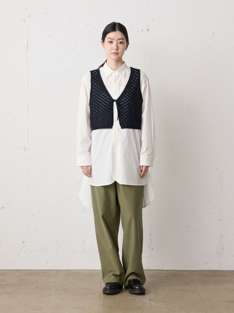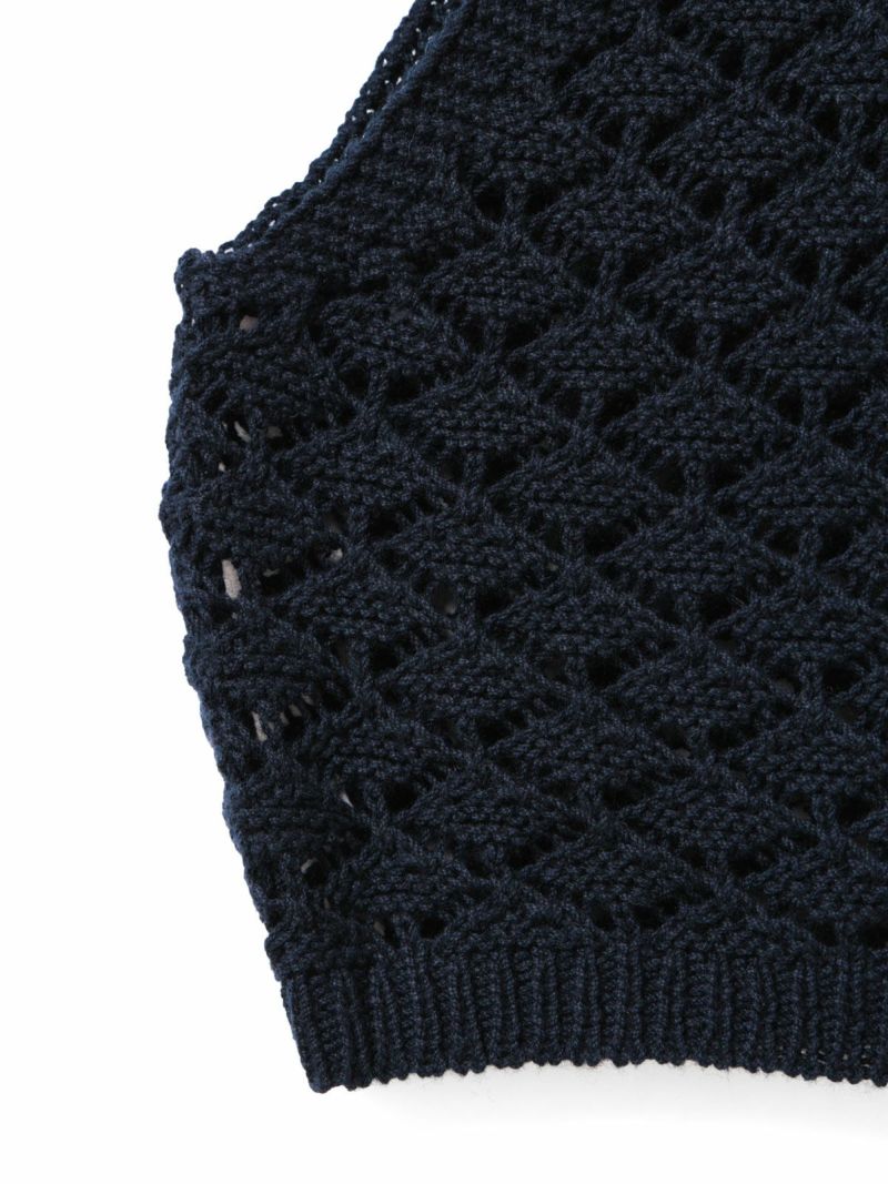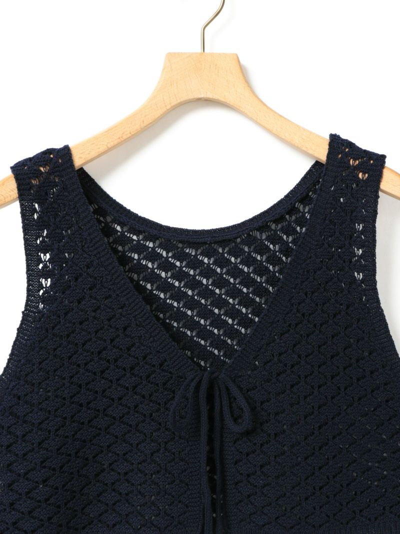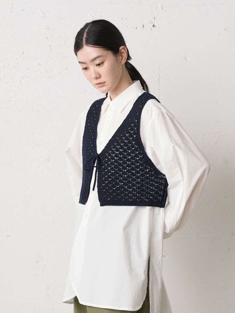 少しシャリ感のあるコットン糸を使用した2WAYショートニットベストです。前後で着用いただけるニットベストで、リボンの可愛さとベーシックなデザインを合わせ持った魅力的なベストです。着こなしによってベストの前後をどちらにするかで雰囲気の変化を楽しんでいただけます。鍵編みの透け感はインナー見えしてくれるので色・柄によって素敵な重ね着を演出してくれます。コンパクトなサイズ感に仕上げており、アクセントとして色々なアイテムにコーディネート可能。通年通して着用いただける素材です。