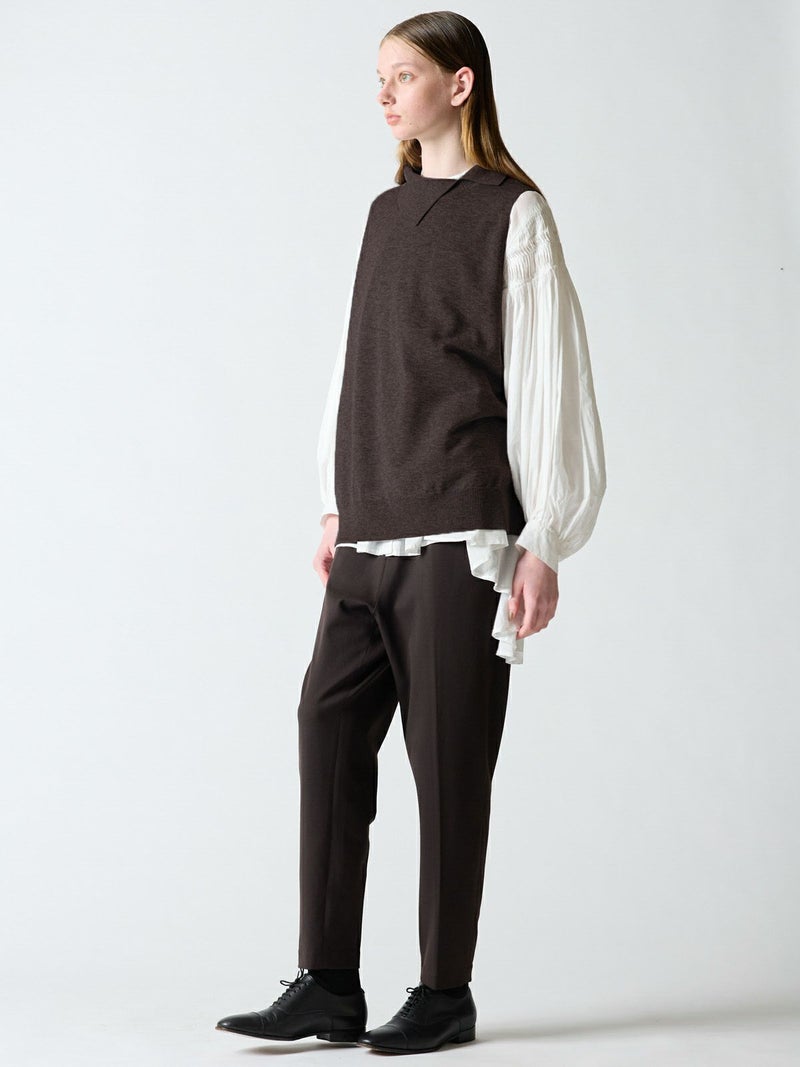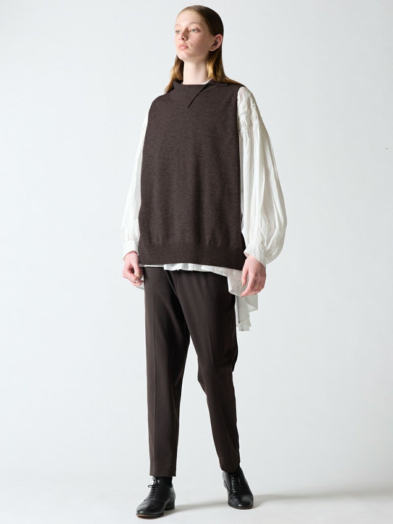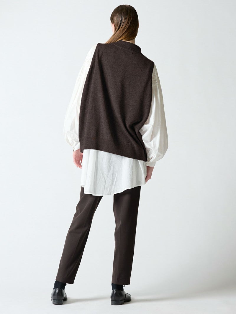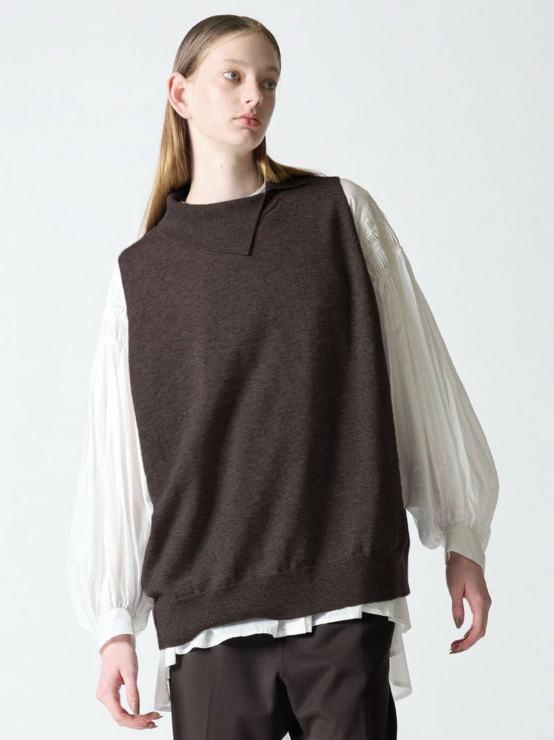 mizuiro indの人気のベストアイテムでアシンメトリーの襟元がポイントのアシンメトリーカラーワイドベストです。ヒップの隠れる少し長めの丈感でワンピースやシャツなど、レイヤードを楽しんでいただける1枚です。袖を通しやすい広めのアームが特徴。ゆとりのある身幅でゆったりと着用可能。秋の装いを演出できる魅力のベストです。
