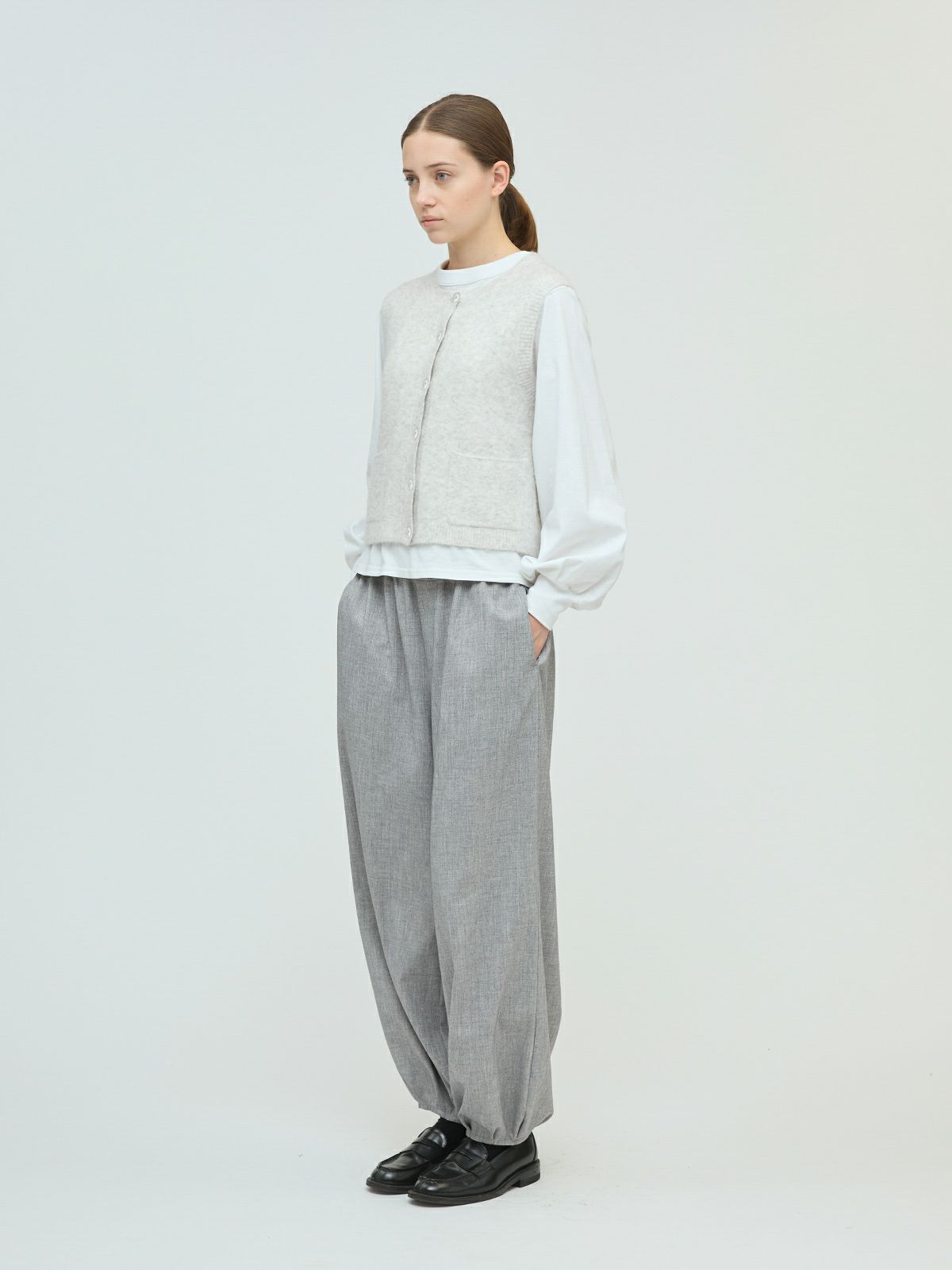 立体感のある独特な表情が魅力のブークレクルーネックベストです。ソフトな肌ざわりで着心地が良く、空気を含みやすく保温性に優れるアイテムで、寒さの増す秋冬ニットアイテムとしてお勧め。フロントボタンのベスト型のデザインは羽織ってもフロントを留めた二つの着こなしを楽しんでいただけます。合わせるアイテムによってコーディネートを変化していただけます。ポケット付。ウォッシャブル対応でシワになりにくく型崩れしにくいのでお洗濯がしやすいのもポイントです。同シリーズ3-220109/襟付きショートカーディガンも展開。