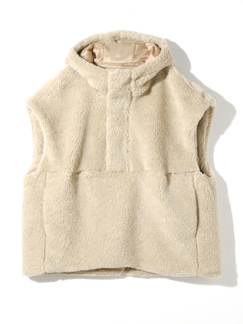 秋の立ち上がりにデザインした3-172052(フード付きベスト)を冬の生地にデザイン変更したボアベストです。モコモコとした温か味のあるボア生地が印象的。ゆとりのあるサイズ感なのでシャツやワンピースも重ねやすさを感じていただけます。落ち着きのある色合いなのでカジュアル感を控えたコーディネートを演出します。首元のボタンは広く開き、アームも広めなのでレイヤードしやすいのもポイント。両サイドから手がすっぽりと入ります。冬のレイヤードを楽しんでいただける暖かなベストアイテムです。