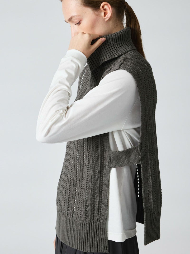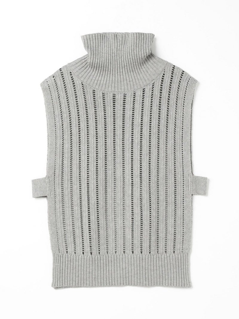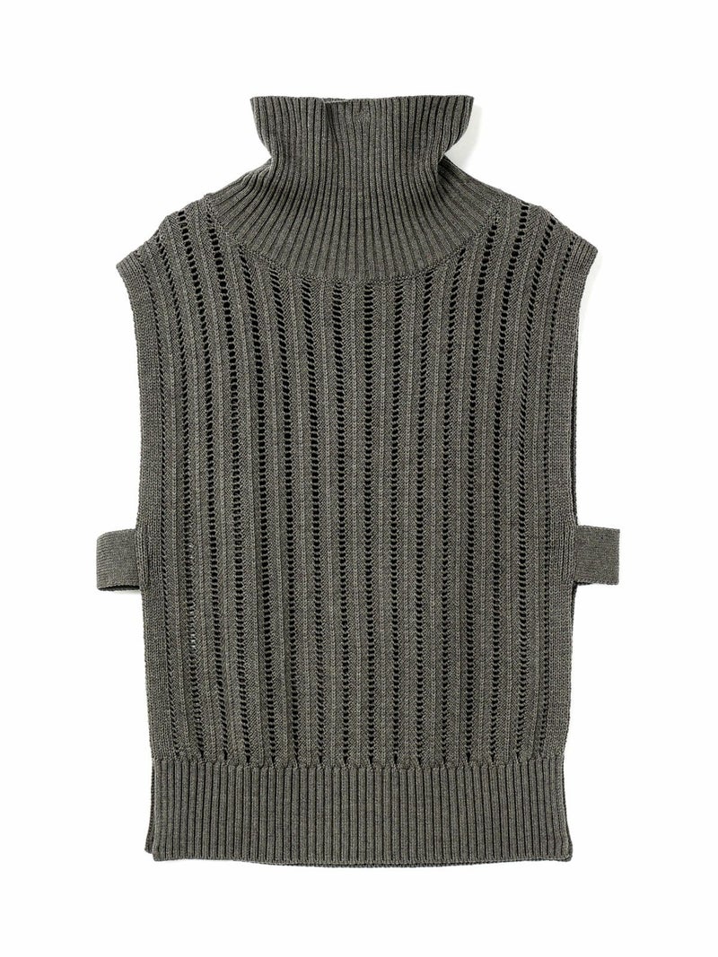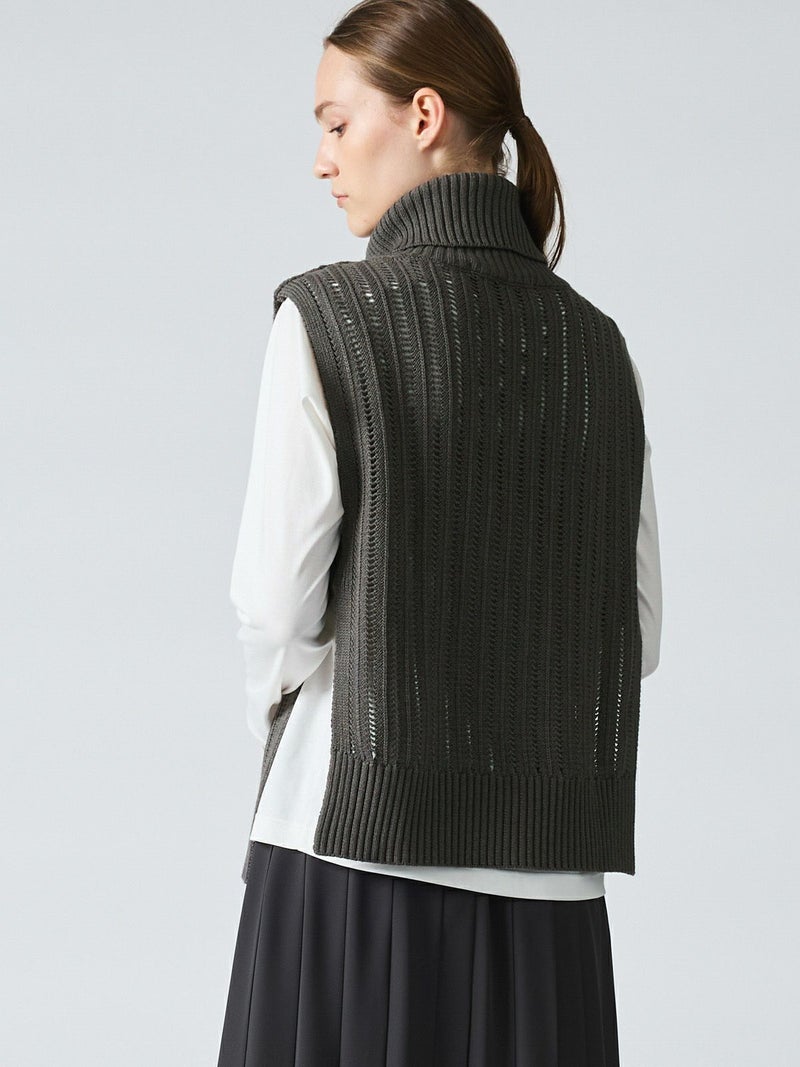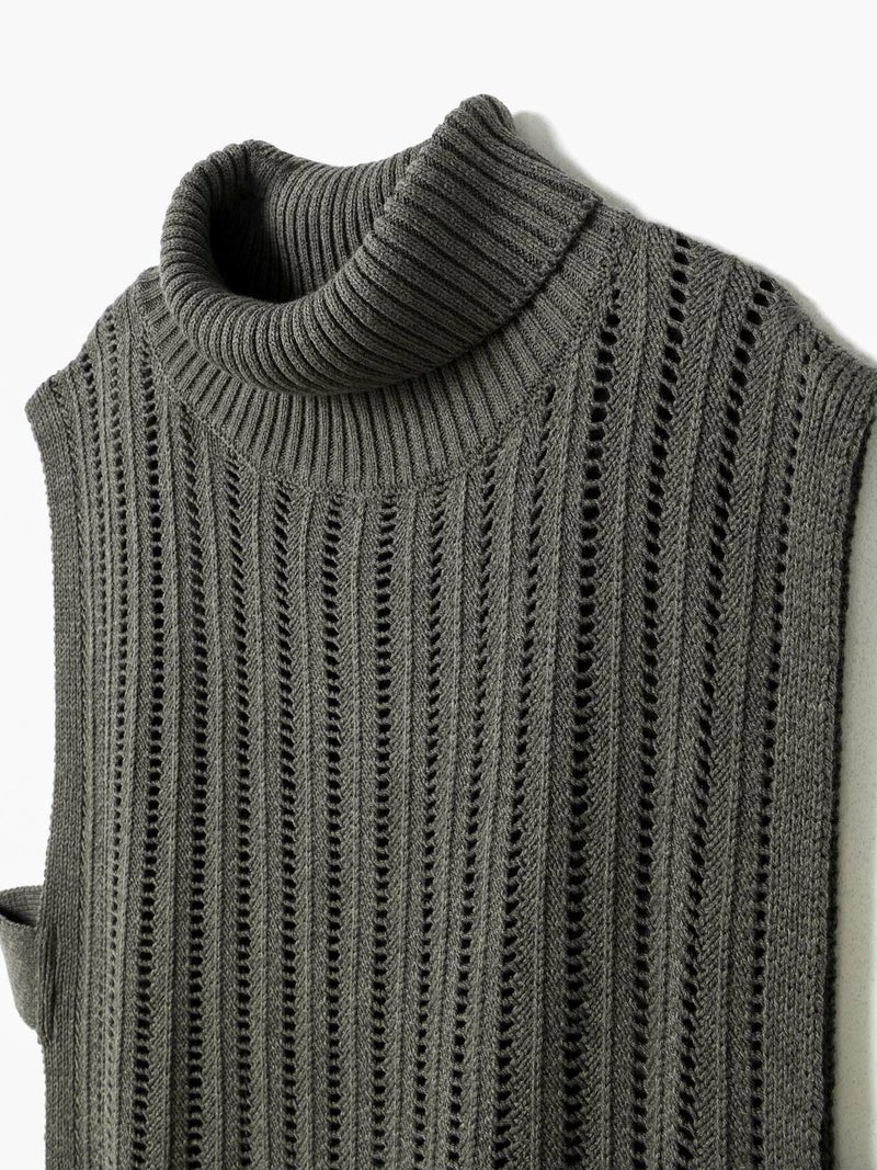 ストライプイメージの柄編みニットを使用したハイネックベストです。透け感でレイヤードを楽しめるデザイン。ニットベスト2型提案した4-220041/ワイドケーププルオーバーも展開中。首を包んでくれる暖かなハイネックでサイドベルト付き。スッキリと短めの丈感が特徴的。インナーが良く見えるのでレイヤードを楽しんでいただけます。 手洗いOKです。