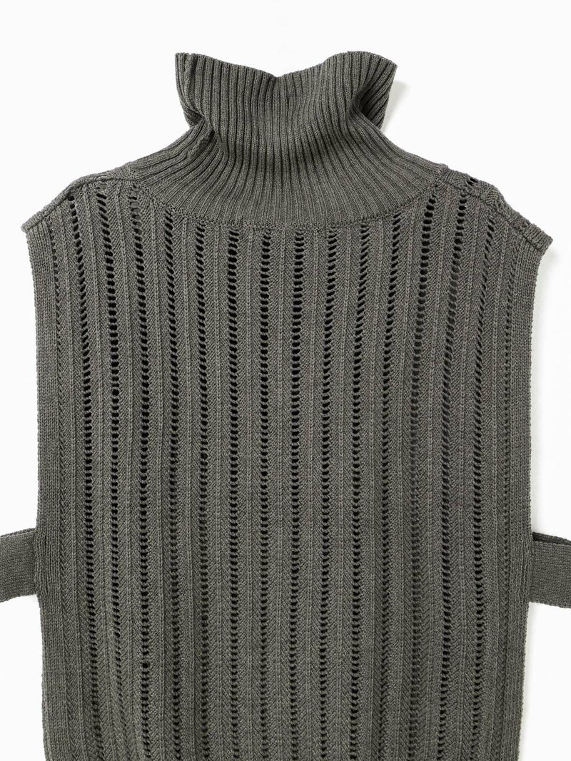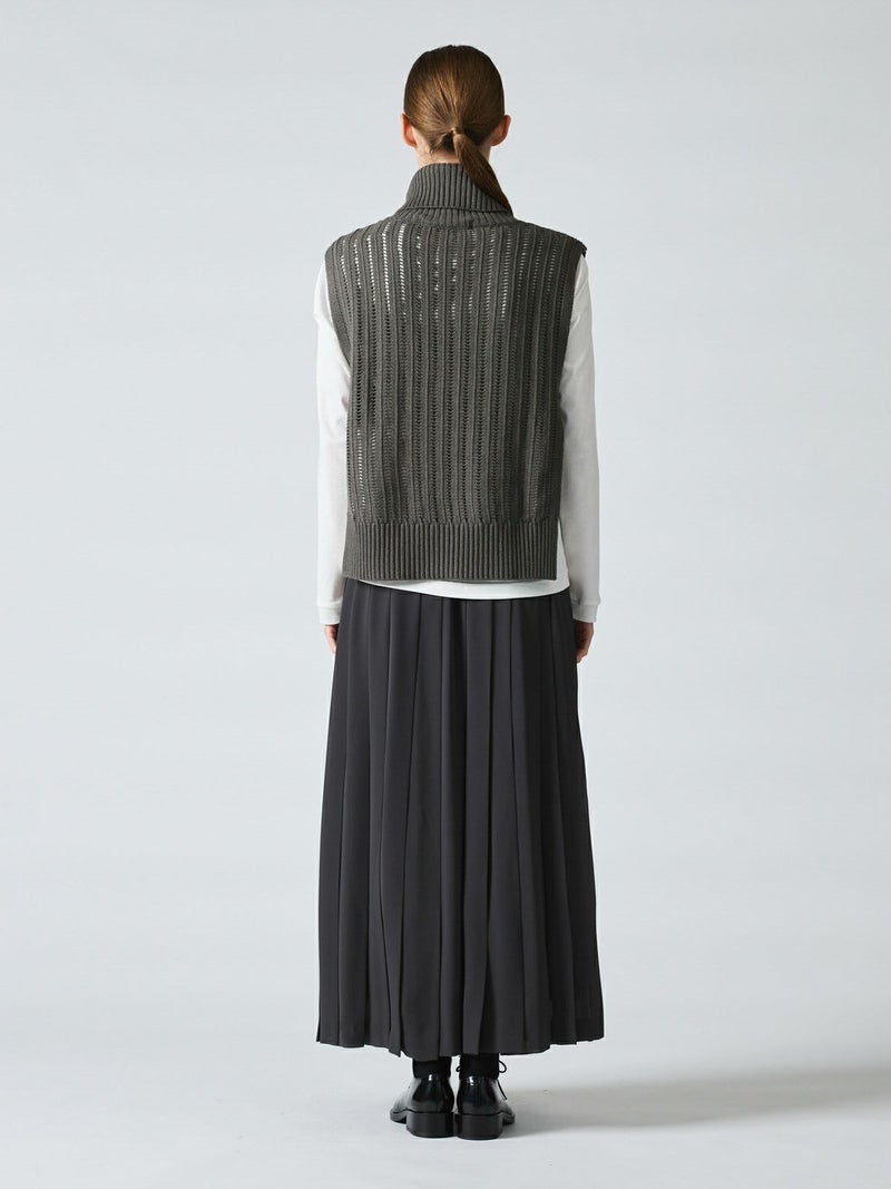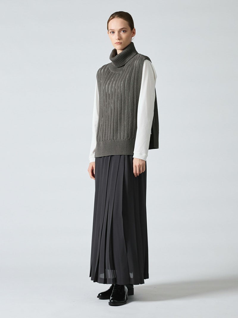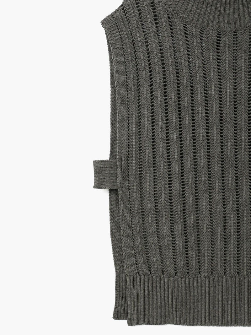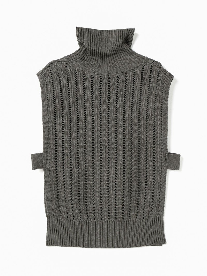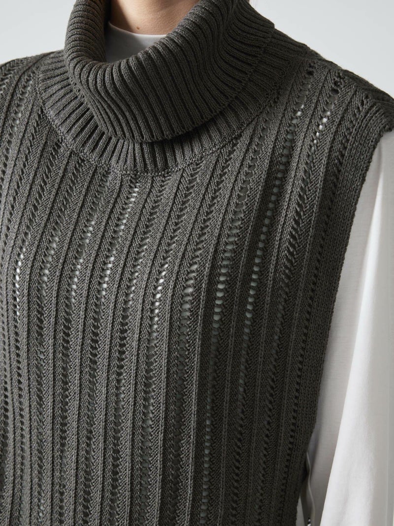 ストライプイメージの柄編みニットを使用したハイネックベストです。透け感でレイヤードを楽しめるデザイン。ニットベスト2型提案した4-220041/ワイドケーププルオーバーも展開中。首を包んでくれる暖かなハイネックでサイドベルト付き。スッキリと短めの丈感が特徴的。インナーが良く見えるのでレイヤードを楽しんでいただけます。 手洗いOKです。