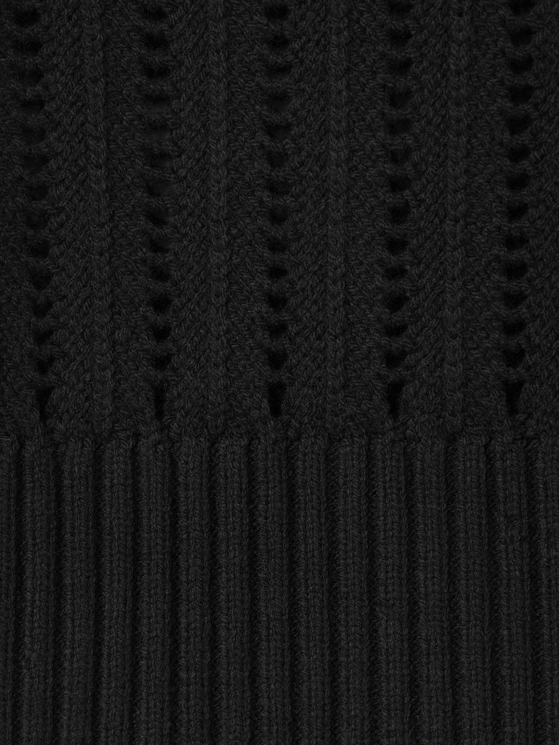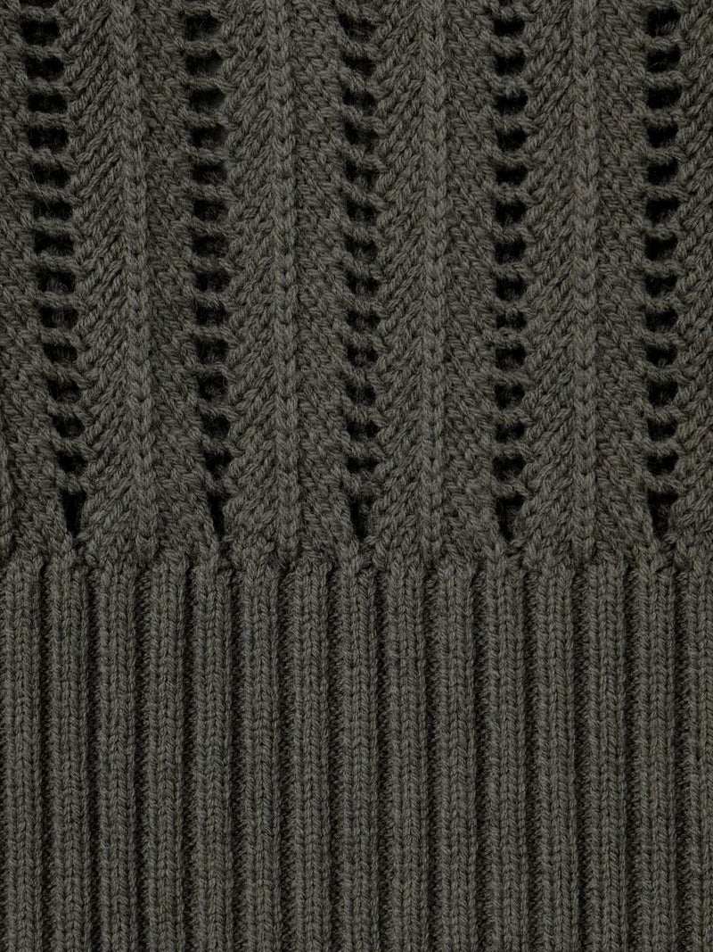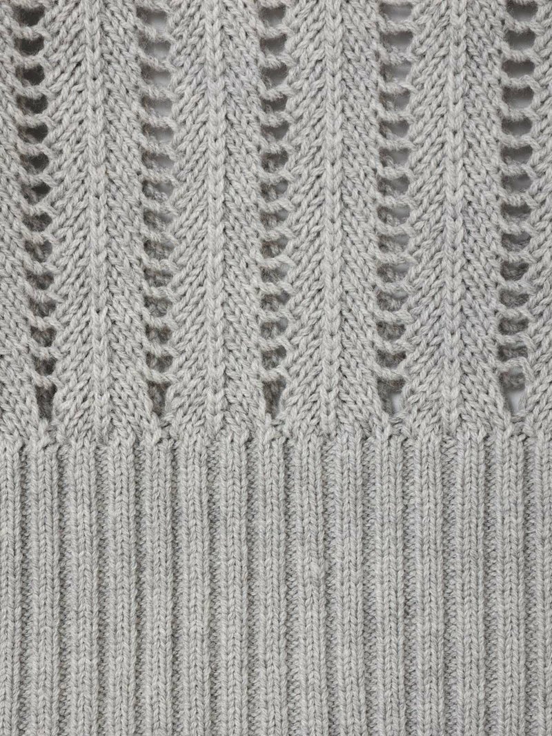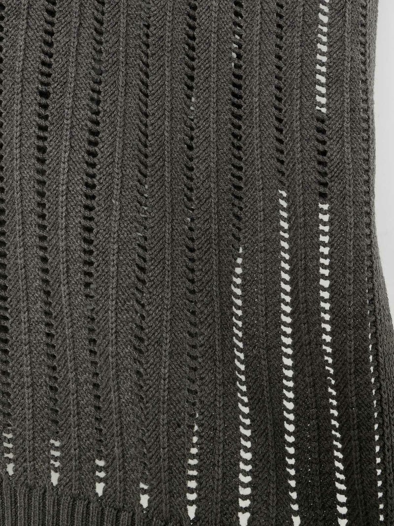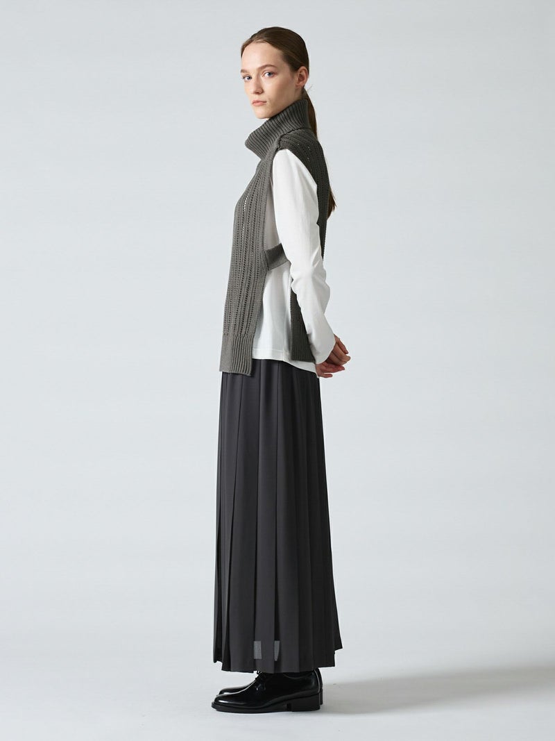 ストライプイメージの柄編みニットを使用したハイネックベストです。透け感でレイヤードを楽しめるデザイン。ニットベスト2型提案した4-220041/ワイドケーププルオーバーも展開中。首を包んでくれる暖かなハイネックでサイドベルト付き。スッキリと短めの丈感が特徴的。インナーが良く見えるのでレイヤードを楽しんでいただけます。 手洗いOKです。