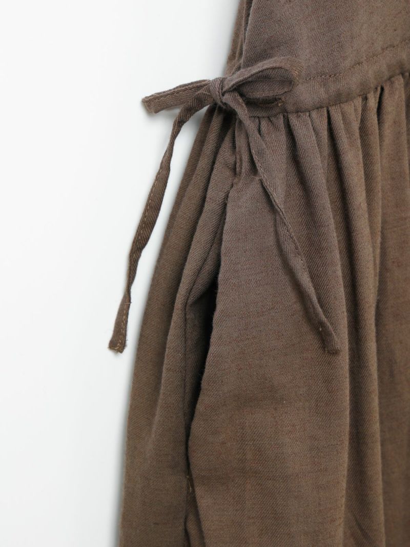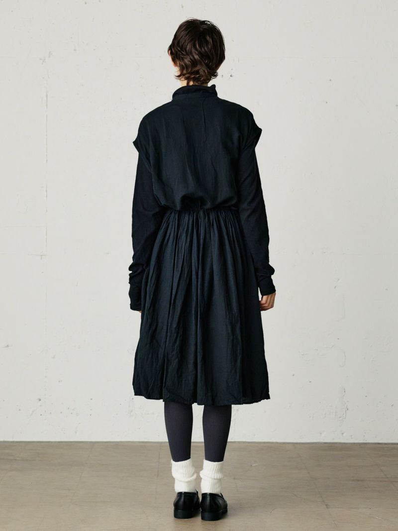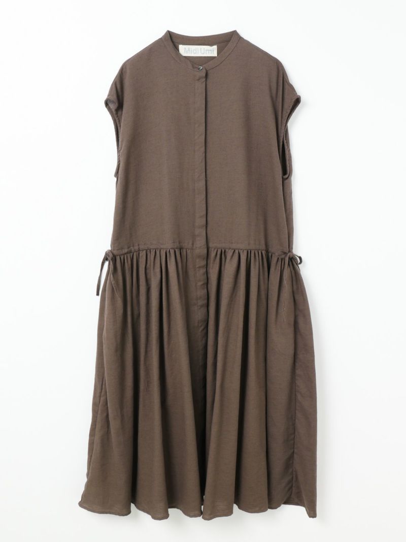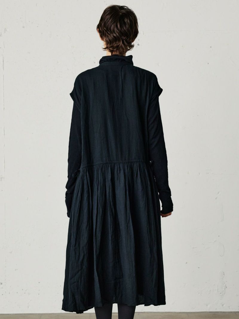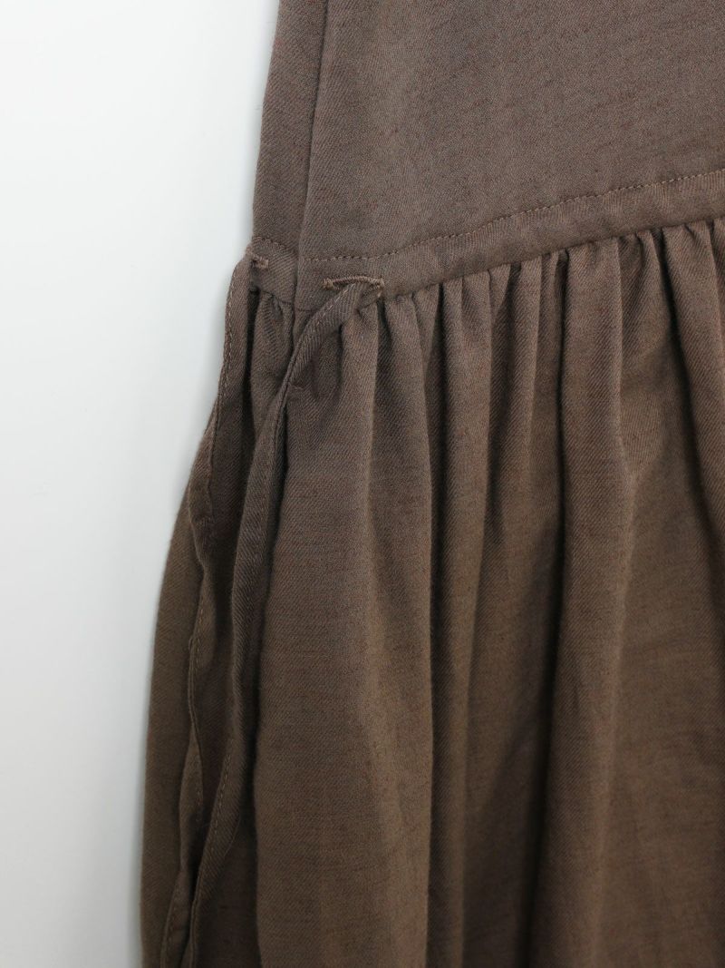 ビンテージライクな風合いが特徴のウエストギャザーワンピースです。コットンウール素材のビエラを使用した4-739391/4-769392と同シリーズで展開。ウエストはドロストをデザインしており、紐を絞ることで着こなしに変化を付けても素敵。生地にウールを含んでいるので冬の寒い時期にも気軽にコーディネートに取り入れやすいワンピースです。ロングベストとして着用していただけるワンピースなので、重ねるアイテムによっては雰囲気が異なり色々なおしゃれを楽しんでいただけます。