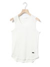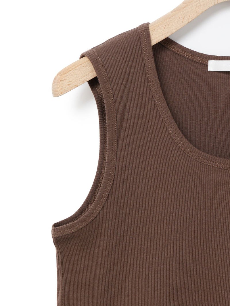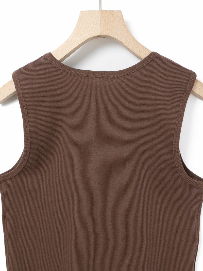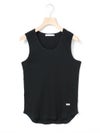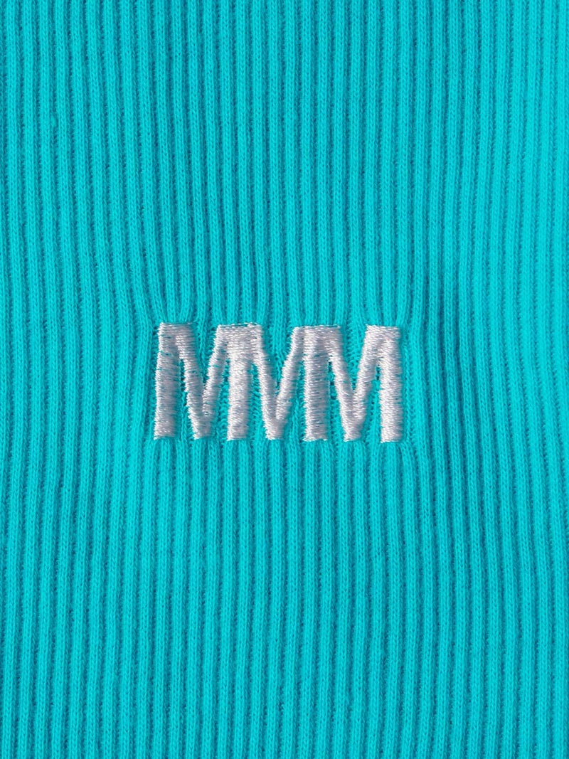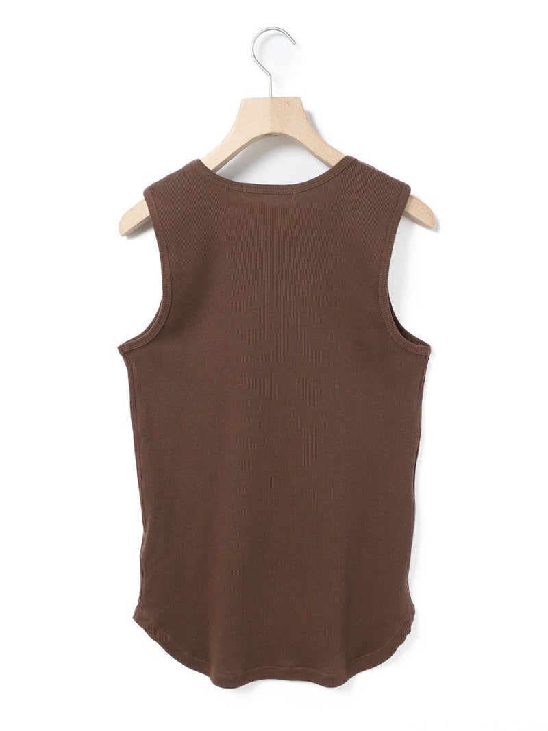 肩線の幅などを少し太目に設定し1枚着でも着れるくらいの下着感のないアイテムに仕上げたベーシックタンクトップです。ダブルのジャケットの下にインナーとして着てもらっても良いですし、勿論1枚でスラックスやワイドなイージーパンツに合わせて恰好良く着ていただくのもおすすめ。左前裾に施された”MMM”の配色刺繍もポイント。生地はしっかりとしたテレコリブを使用。