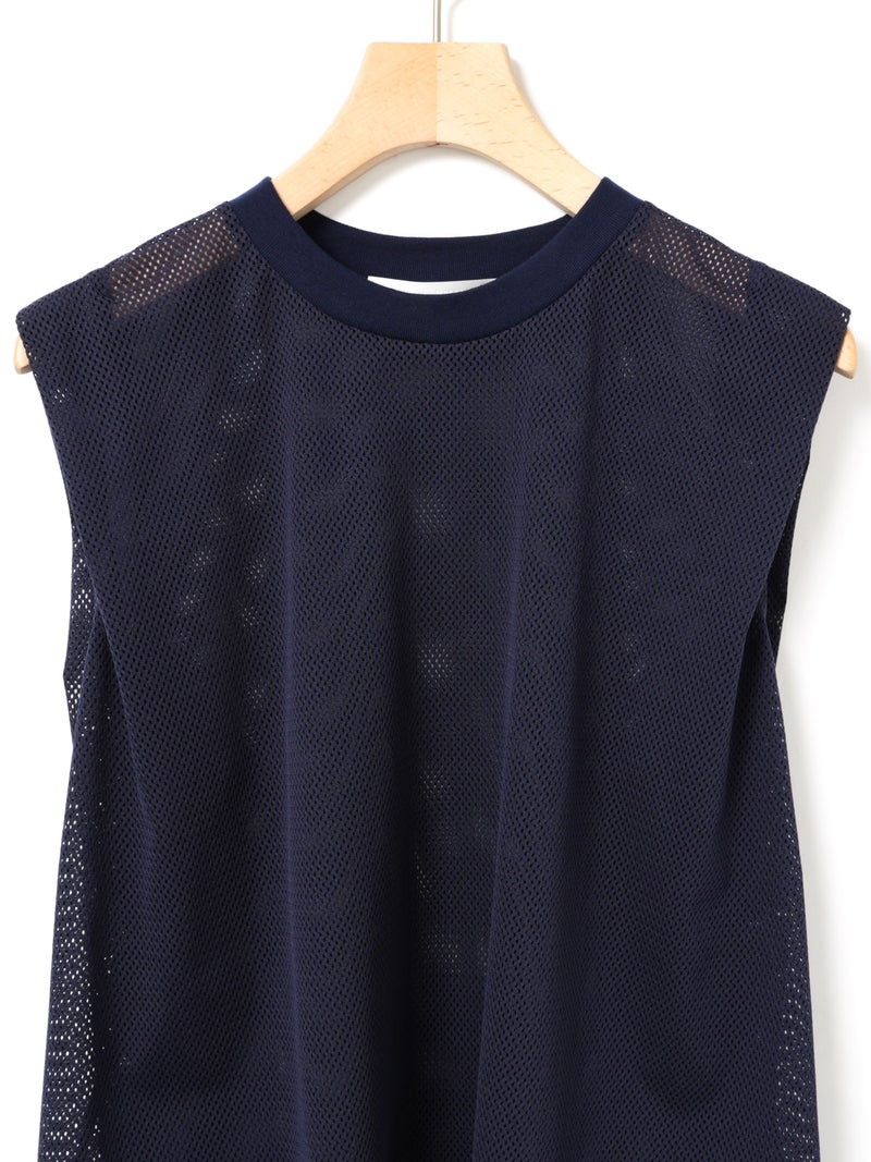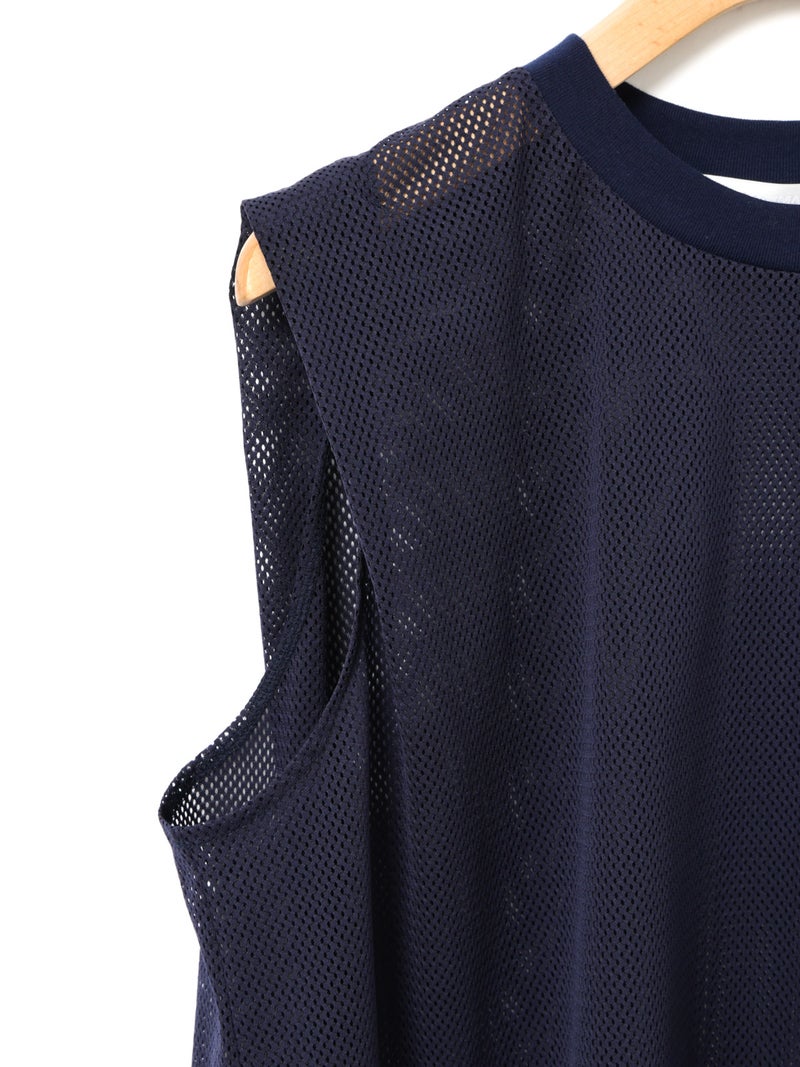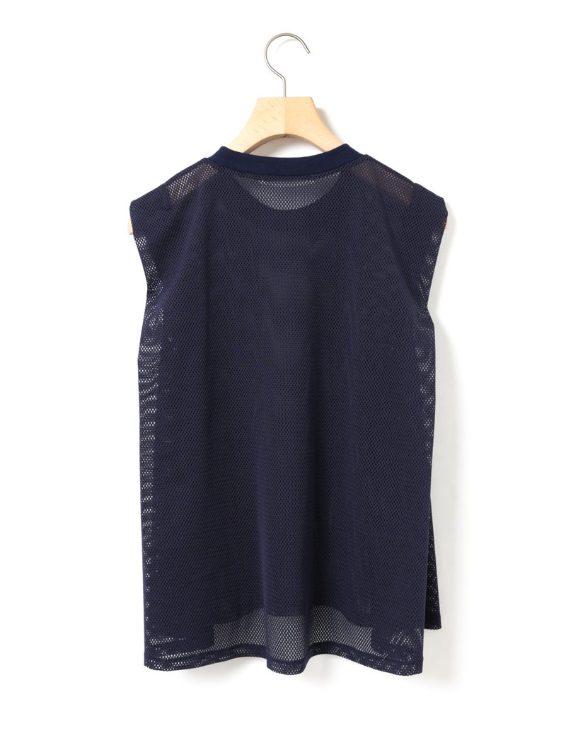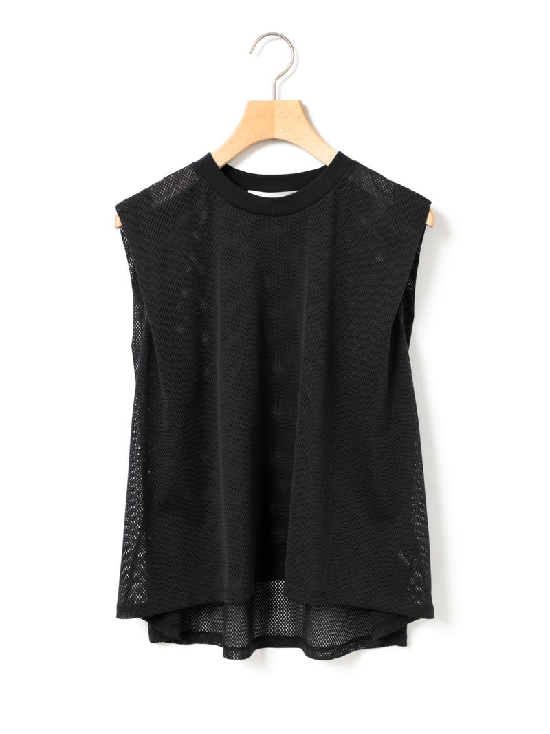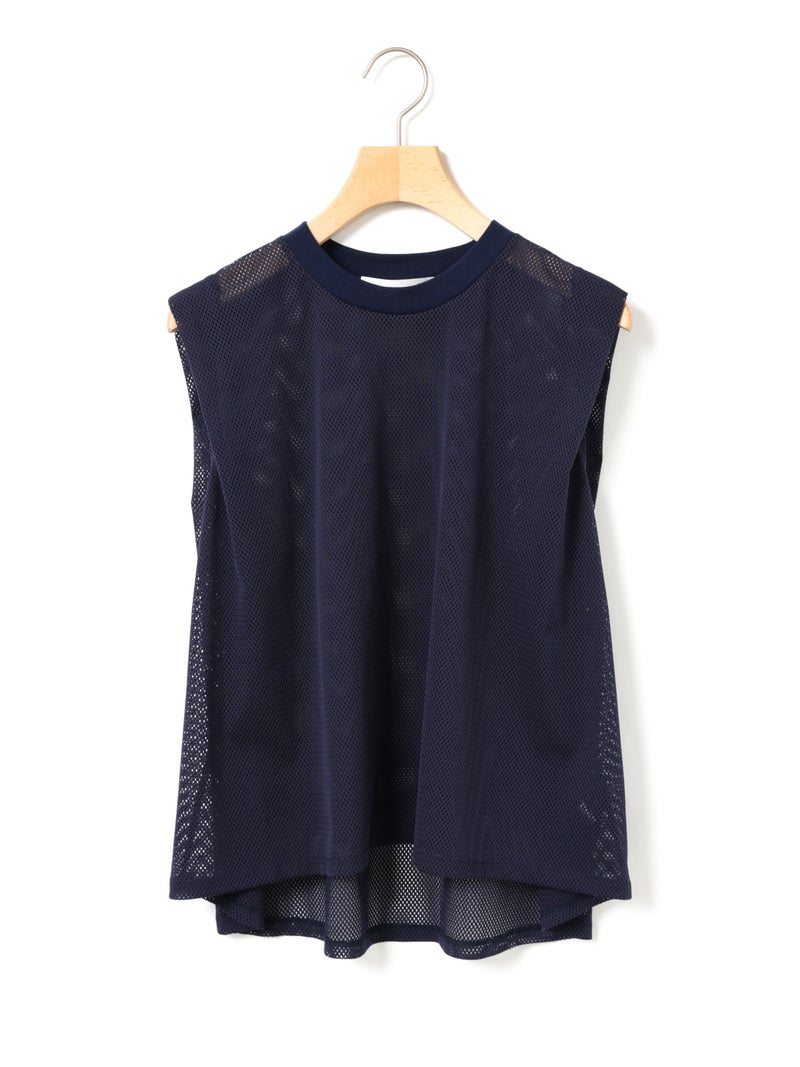 脇下を内側に折り込みフレア感をだしたメッシュノースリーブTシャツです。軽さのあるメッシュ素材のため透け感ありますが通気性がよく暑い季節は特に快適な着こなしを演出します。肩がガッツリと出ないデザインなのでスポーティさはなくノースリーブを着用しているような着こなしを表現。インナーが良く見えるので重ね着を楽しんでいただけます。身頃も程よくゆとりのある女性らしいデザインが特徴です。