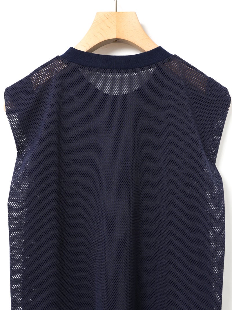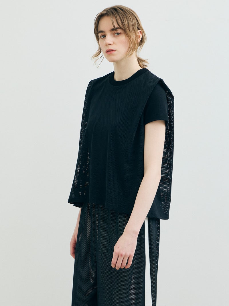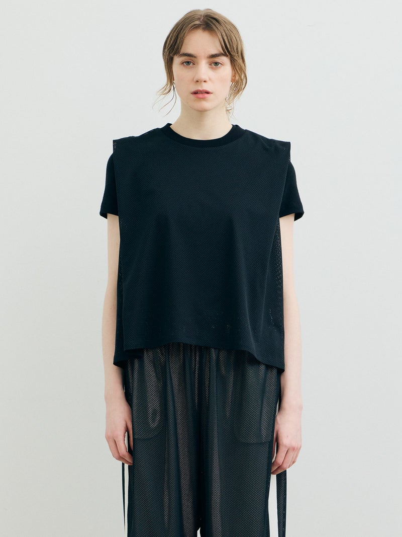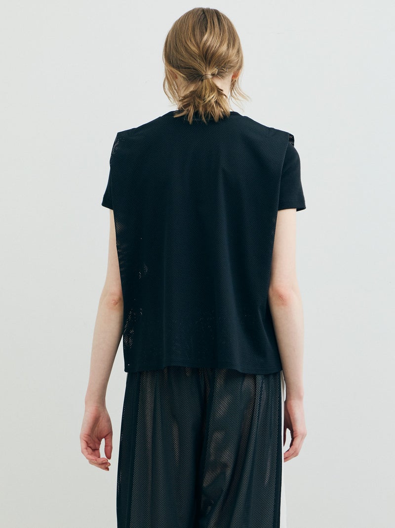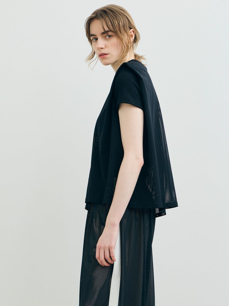脇下を内側に折り込みフレア感をだしたメッシュノースリーブTシャツです。軽さのあるメッシュ素材のため透け感ありますが通気性がよく暑い季節は特に快適な着こなしを演出します。肩がガッツリと出ないデザインなのでスポーティさはなくノースリーブを着用しているような着こなしを表現。インナーが良く見えるので重ね着を楽しんでいただけます。身頃も程よくゆとりのある女性らしいデザインが特徴です。