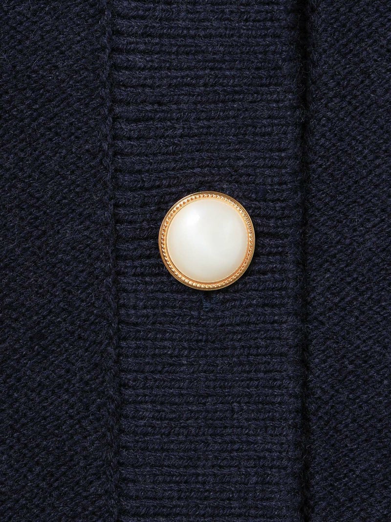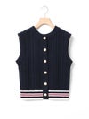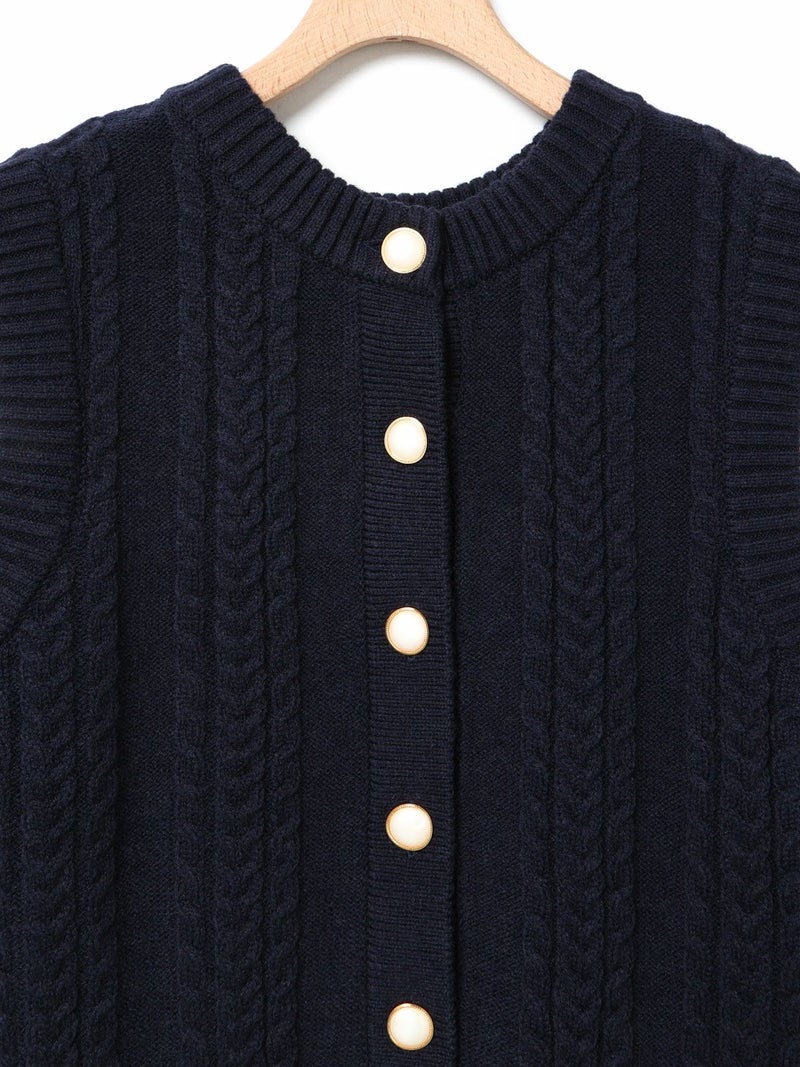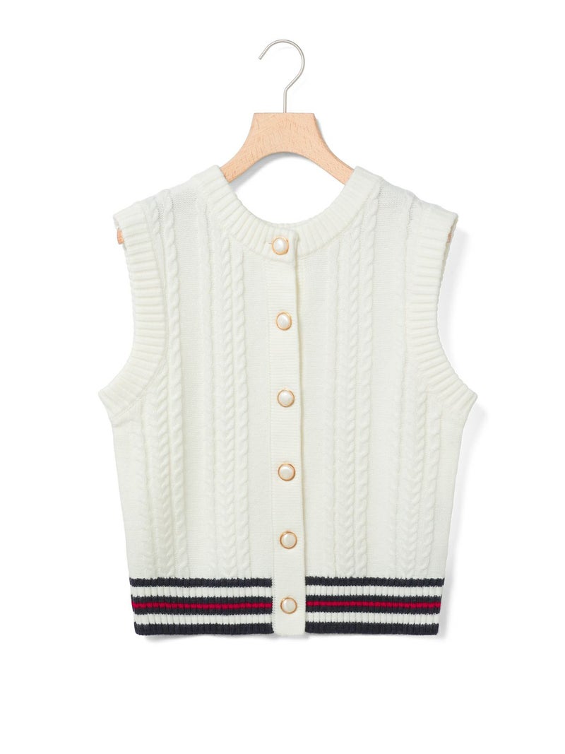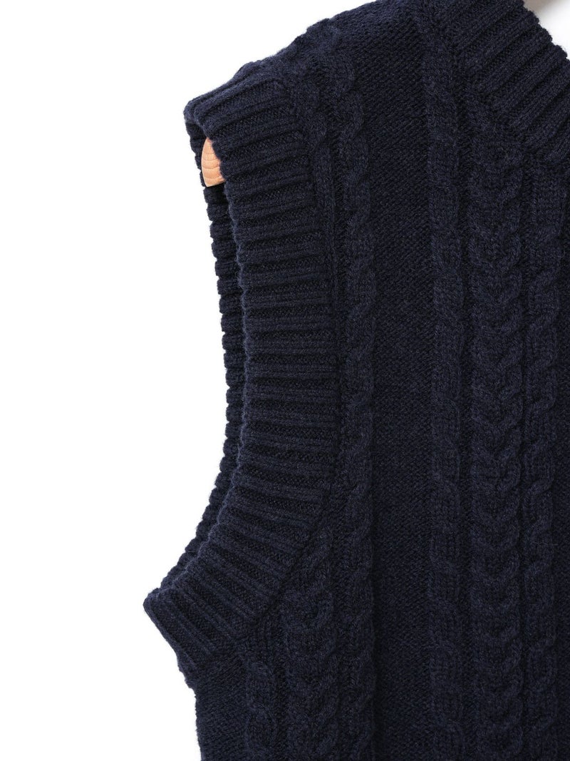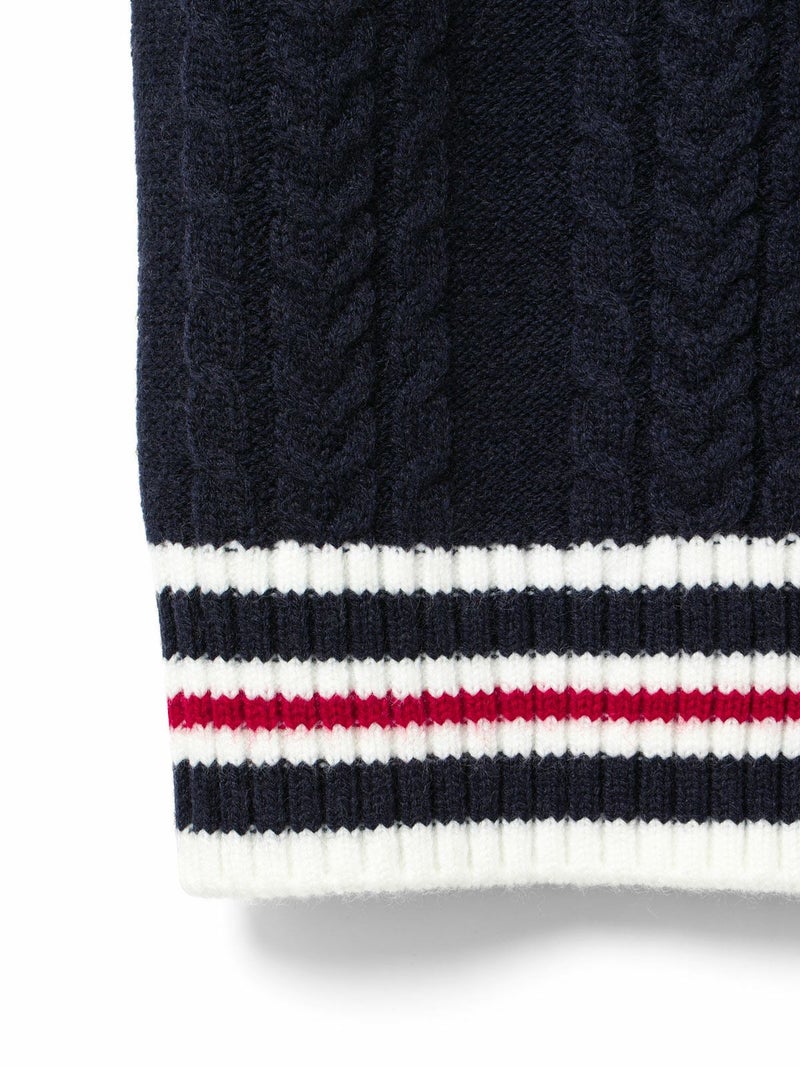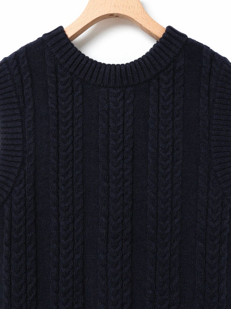このニットベストはクラシックテニスのコーディネートで欠かせない、ケーブル編みのニットアイテムをイメージして作っています。ネックの使用を前後同じにすることによって、どちら側を前にしても着用できるフロンタブル仕様にしています。釦はポロ同様にパールボタンを使用、トラッドに少しのガーリー感を加えています。釦側を前にする時はMARMARMARのメンズライクなパンツを合わせて。釦側を後にする時は下にシャツを着て、スカートやスラックスなどを合わせて、よりトラッドな見え方に挑戦するのもおすすめです。また釦が後ろ側の時に下の釦を外し、スリット的な見え方にするなど様々な着こなしをお楽しみいただけます。