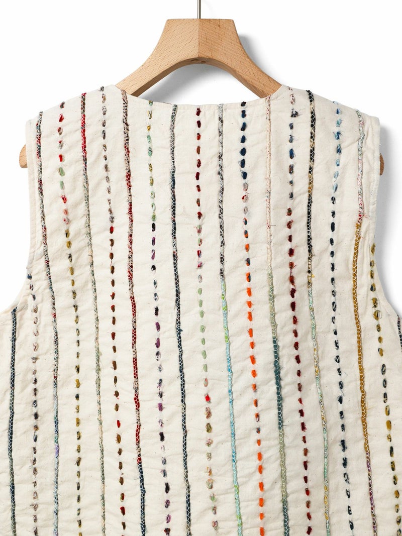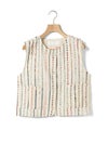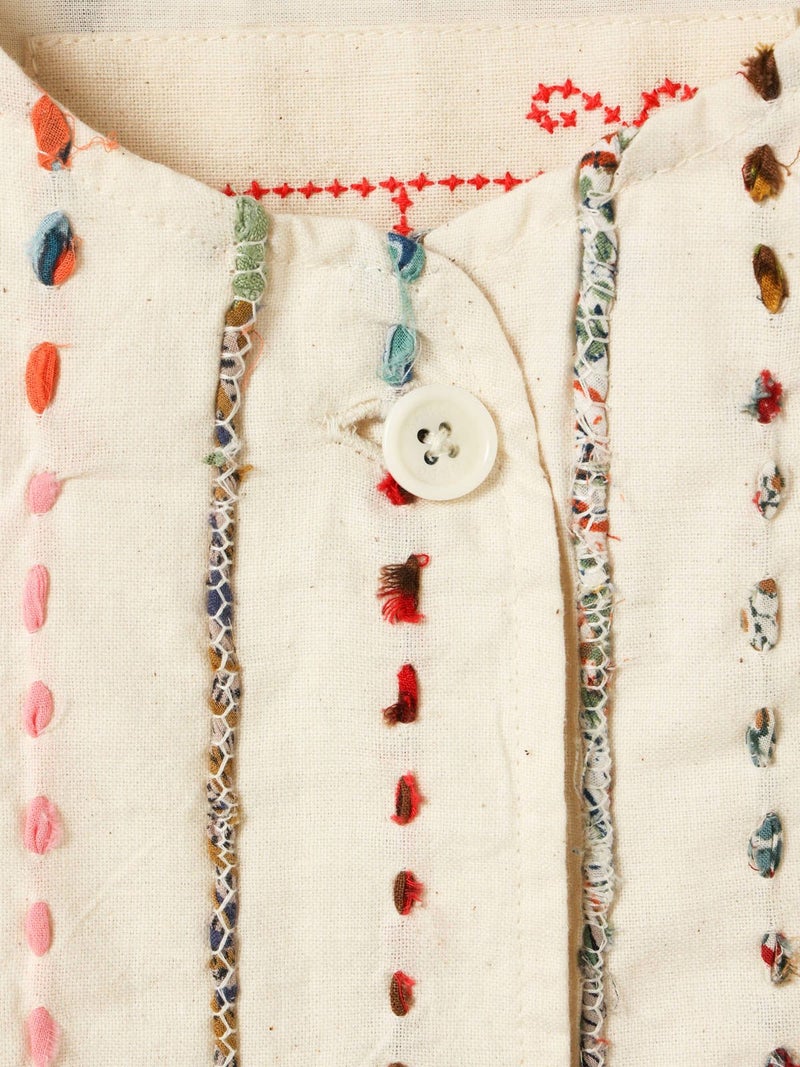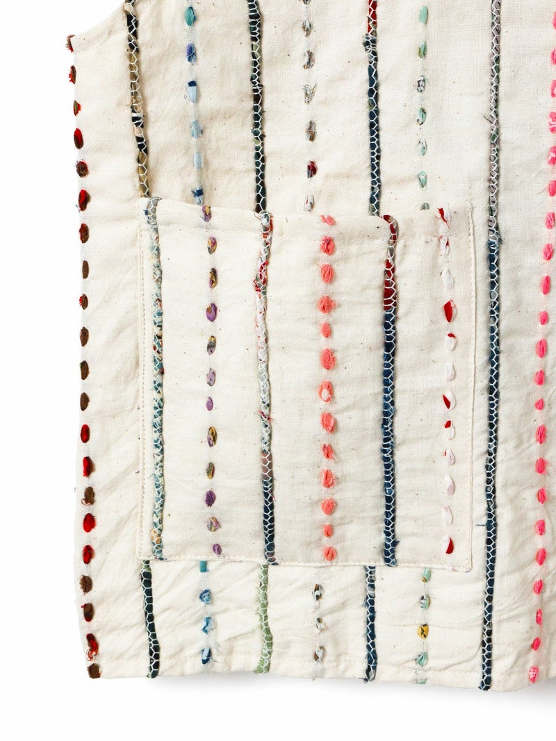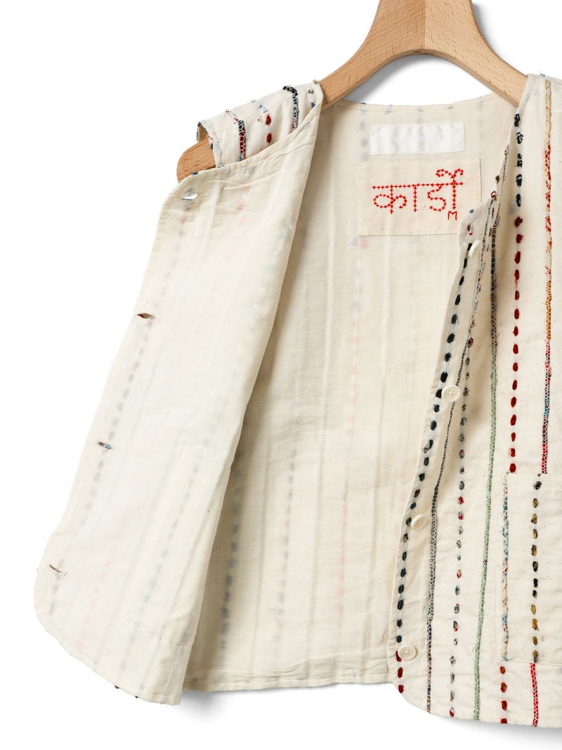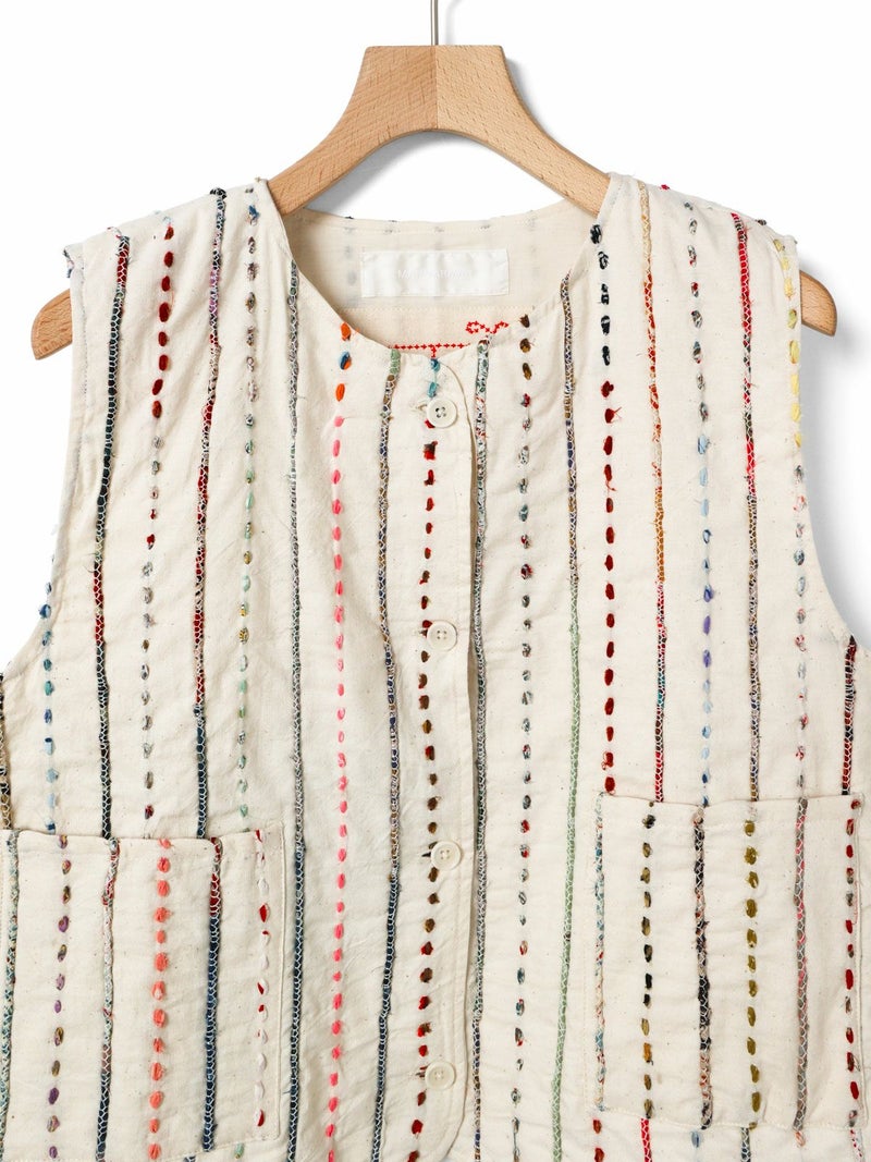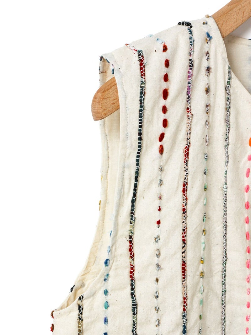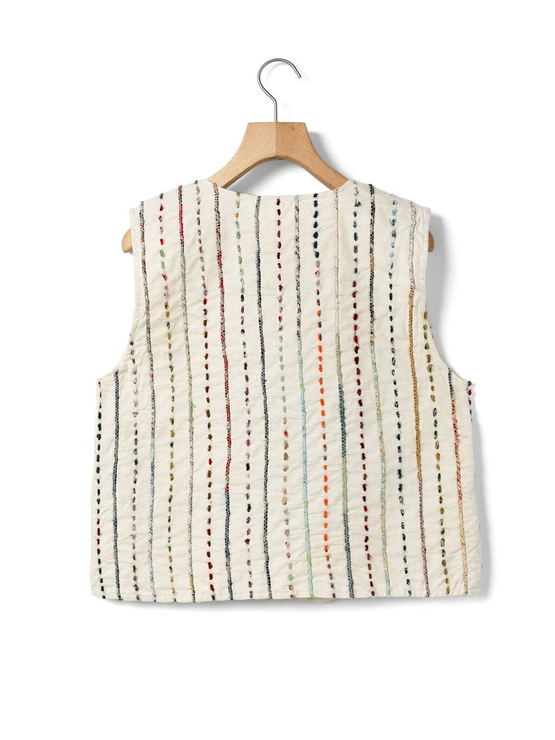 インド生産ならではの素材やテクニックを活かした刺繍ショートベストです。ハンドクラフトのカラフルな刺繍ステッチが目を引きます。1枚で存在感があるのでTシャツやシャツにプラスしていただくだけでコーディネートの主役になるアイテムです。コンパクトなサイズ感にしているのでワンピースに合わせるのもオススメ。インポート好きには手をとめるアイテムになっています。