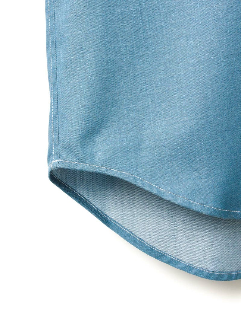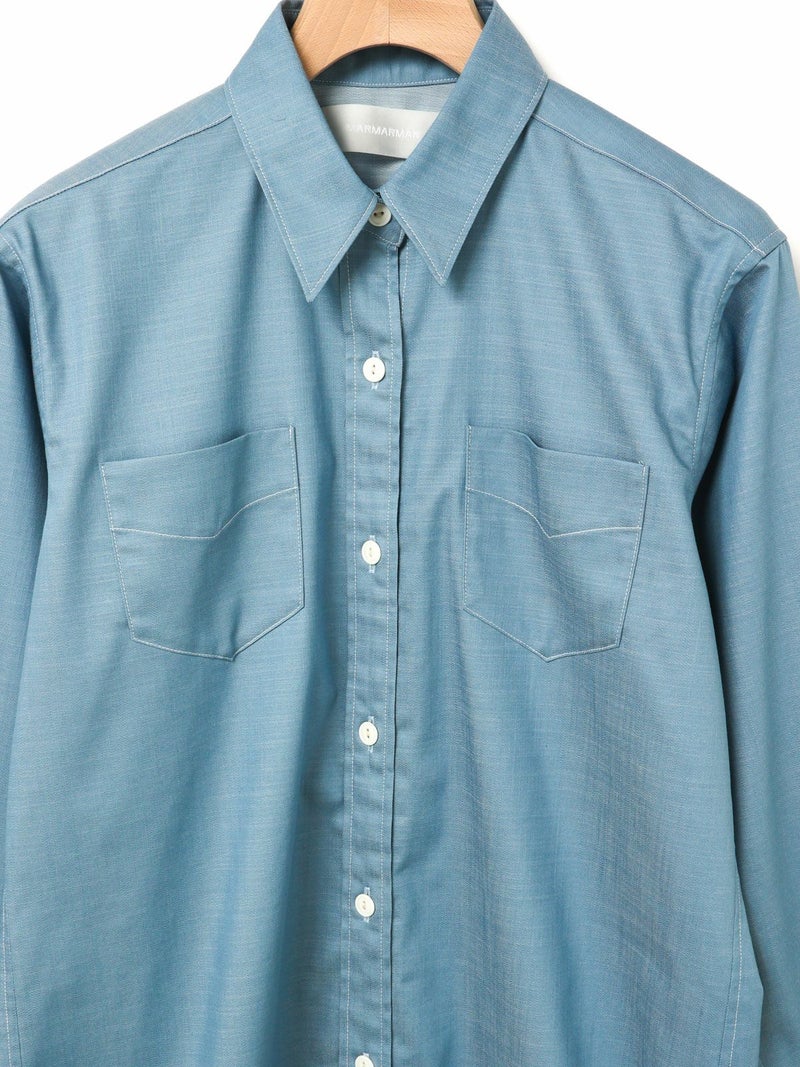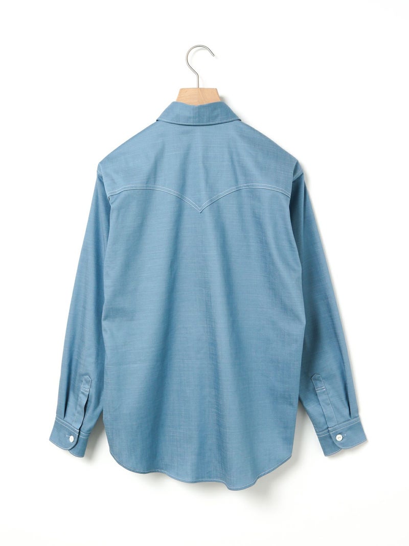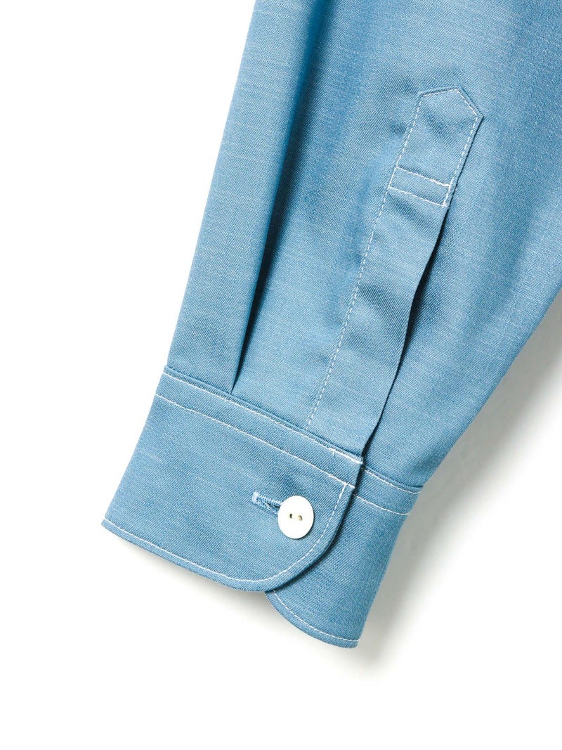 古着屋に売っているオーセンティックなシャツをイメージして作ったシャンブレーシャツ。コンパクトなサイズ感が特徴。シンプルなデザインの中にMARMARMARらしいM型ヨークやパッチポケットのM字ステッチがアクセントになっています。モデルとなったシャツを忠実に再現し釦は白のプラボタンで作成しています。シャツとしても羽織としても着用いただけます。本格的なデニムの見た目でありながらキレイで軽いのがポイント。通常のデニムと異なり色落ちしないので安心して着用いただけます。軽さのあるシャンブレーと1-830072A/ブロードの2素材で展開。