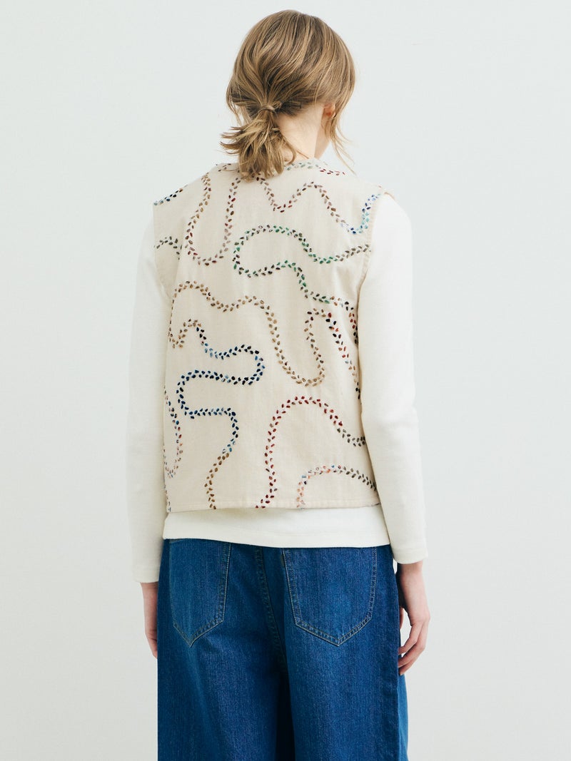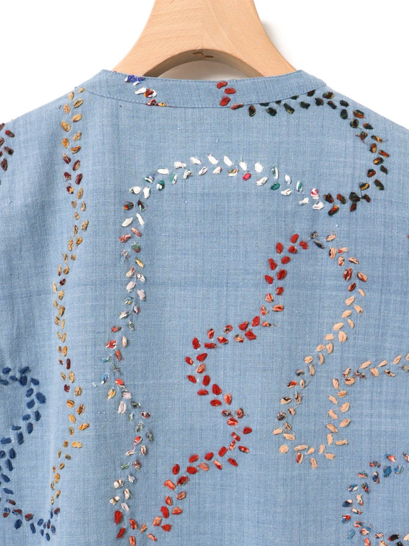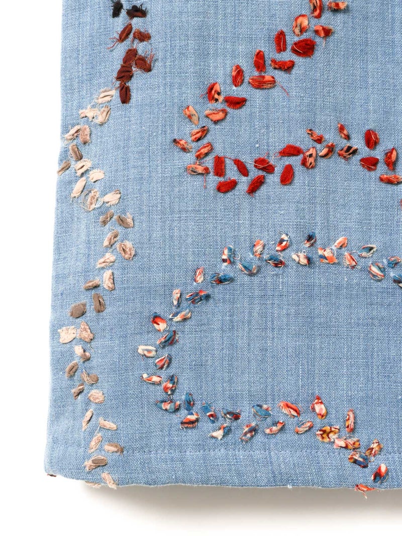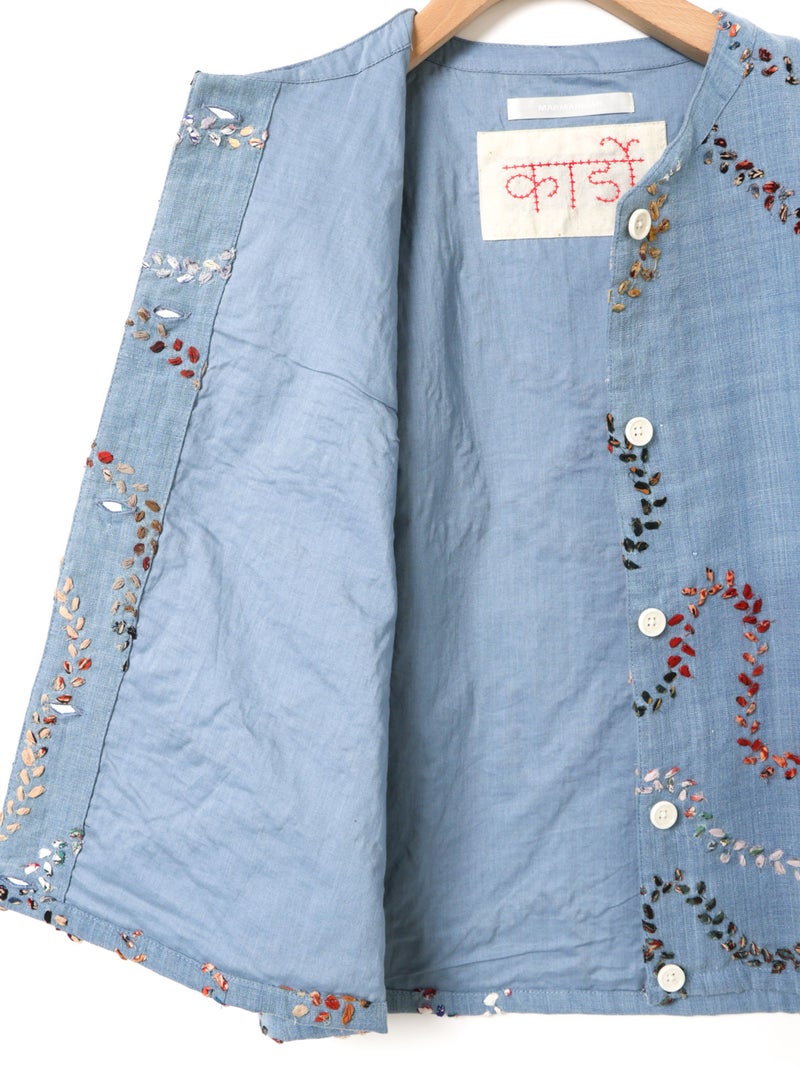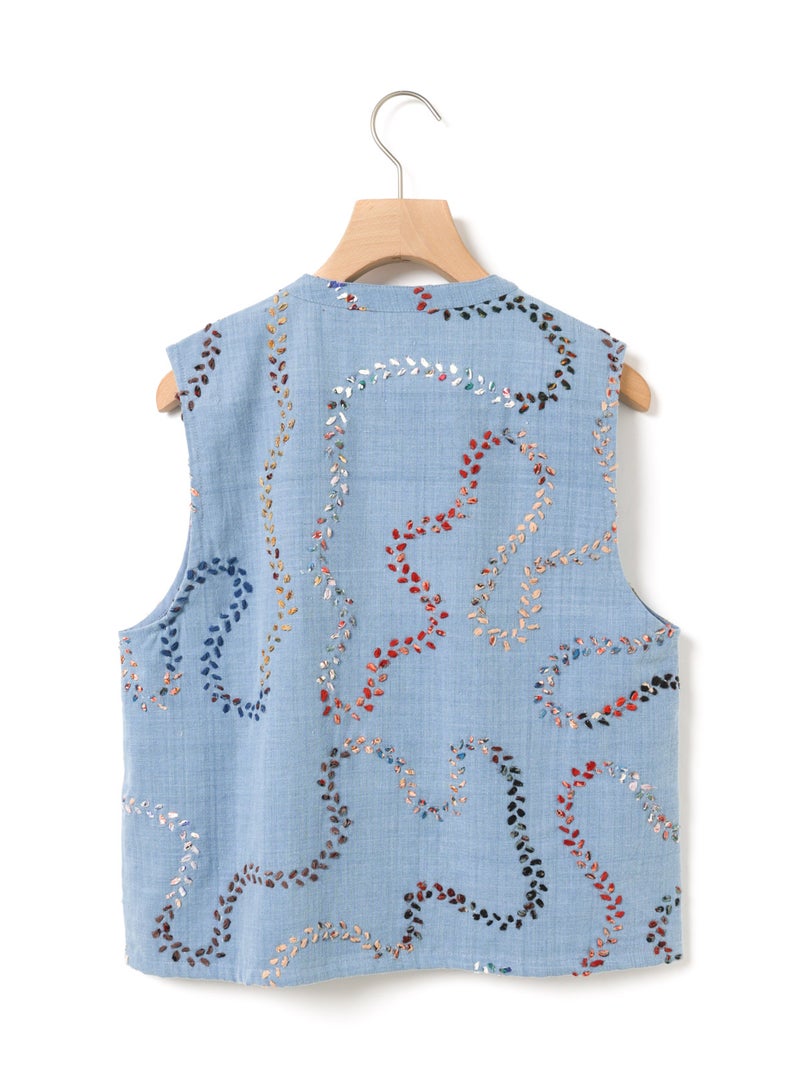 メンズブランド”カルド”×MARMARMARとのWネームでデザインしたハンド刺繍ベストです。大量生産やファストファッションをアンチテーゼに、2013年にインドで創業した「KARDO/カルド」。トラディショナルなワークウェアやテイラーリングを製作の基礎に、微細なひねりをシルエットやディテールに加え製作されています。インドでの昔ながらの織物・プリント・染色技術を製作に用い、素材には天然素材にて染色された手機織物・ブロックプリント・IKAT・ナチュラルインディゴ染色・手刺繍等々様々な手仕事による素材を使用。環境への影響をできるだけ減らし、伝統技術が廃れてしまわない様サポートし協業し続けています。また、全てのコレクションは1点毎に手断ちにて製作され、縫製の工程は1人のテーラーにより製作されています。メンズブランドですが、レディースに落とし込むことで特別感を別注。過去の残布を細かく糸状にし、図案にハンドステッチを施したインドならではの技法とデザインが魅力の1枚です。