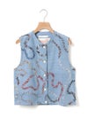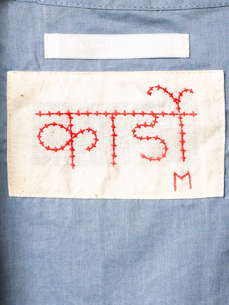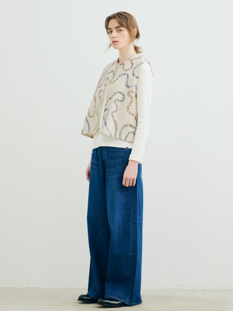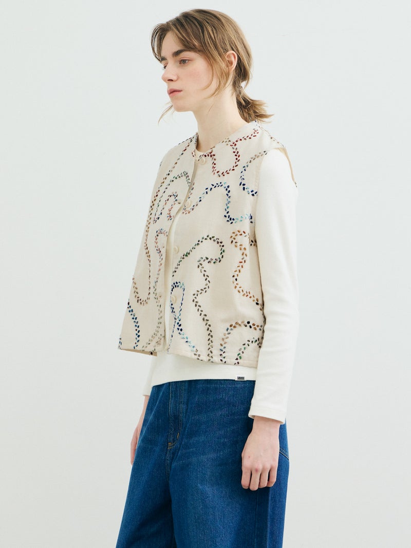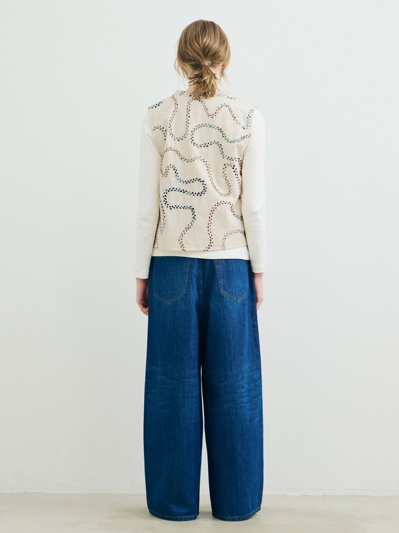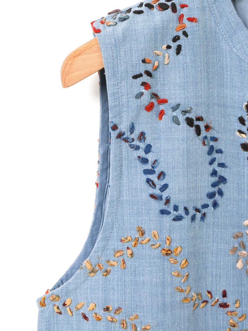 メンズブランド”カルド”×MARMARMARとのWネームでデザインしたハンド刺繍ベストです。大量生産やファストファッションをアンチテーゼに、2013年にインドで創業した「KARDO/カルド」。トラディショナルなワークウェアやテイラーリングを製作の基礎に、微細なひねりをシルエットやディテールに加え製作されています。インドでの昔ながらの織物・プリント・染色技術を製作に用い、素材には天然素材にて染色された手機織物・ブロックプリント・IKAT・ナチュラルインディゴ染色・手刺繍等々様々な手仕事による素材を使用。環境への影響をできるだけ減らし、伝統技術が廃れてしまわない様サポートし協業し続けています。また、全てのコレクションは1点毎に手断ちにて製作され、縫製の工程は1人のテーラーにより製作されています。メンズブランドですが、レディースに落とし込むことで特別感を別注。過去の残布を細かく糸状にし、図案にハンドステッチを施したインドならではの技法とデザインが魅力の1枚です。