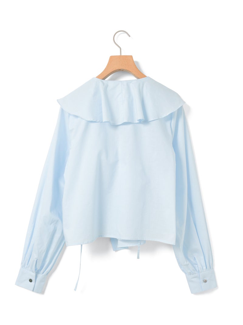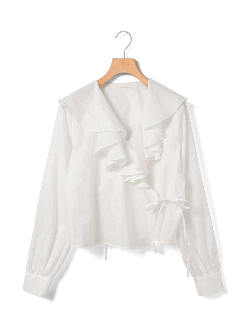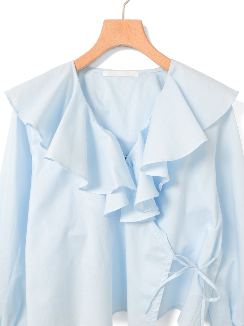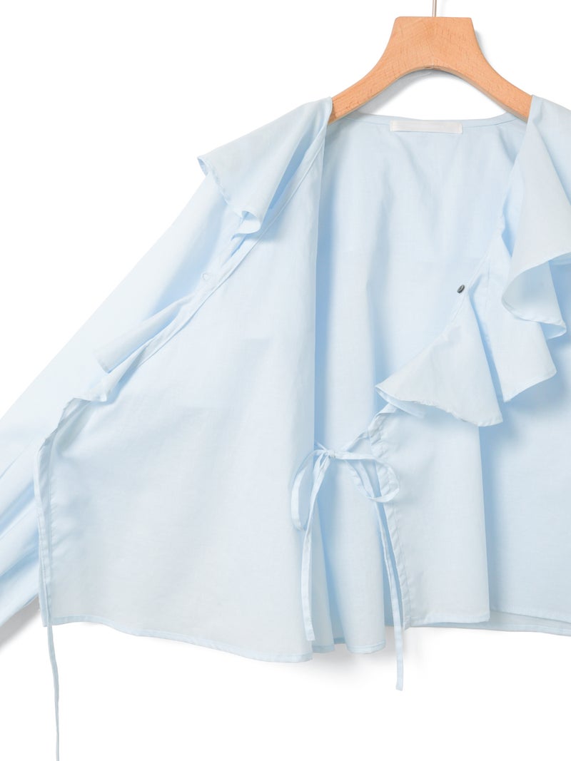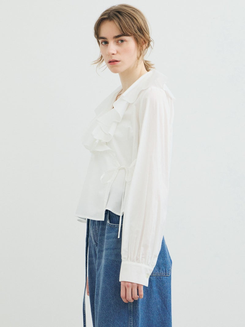 透け感のある軽い素材にラッセルフリルをデザインした印象的なラッフルフリルカシュクールブラウス。フリルが綺麗に出るようパターンされており、はだけないよう胸元に1つボタンが付いています。内側にも紐が付いています。カシュクールデザインのためフロントを開けて羽織としても着るのも可能。ビンテージのフランスの古着をイメージしており華やかな雰囲気も演出。カジュアルなパンツ、デニムにも合う1枚でワークで合わせるとトレンド感が出て素敵です。
