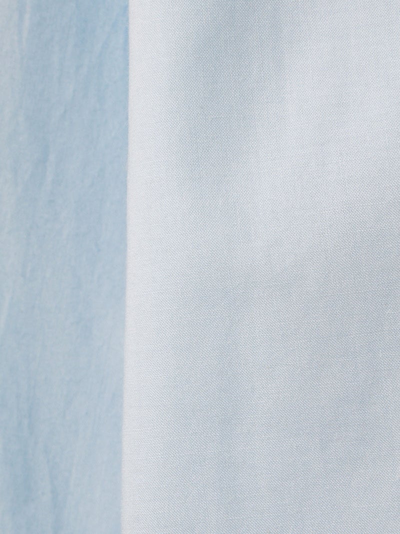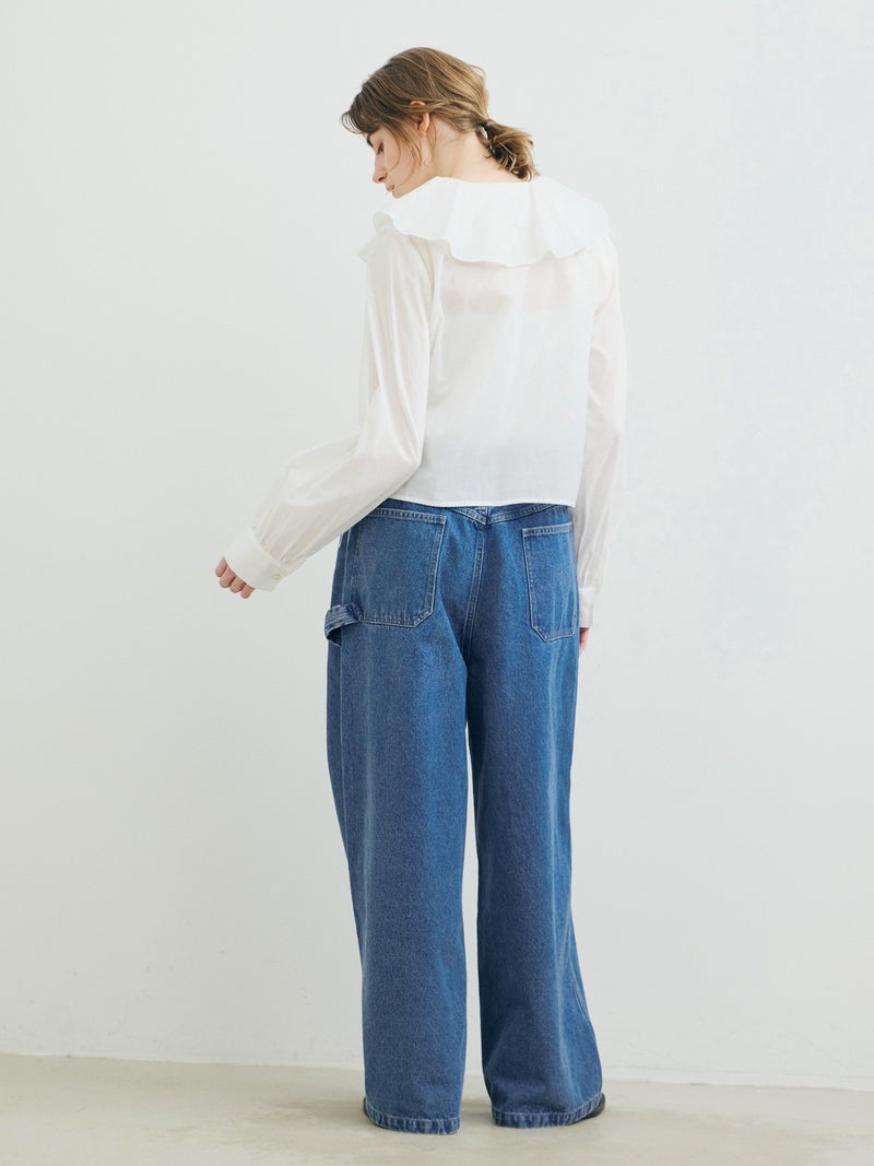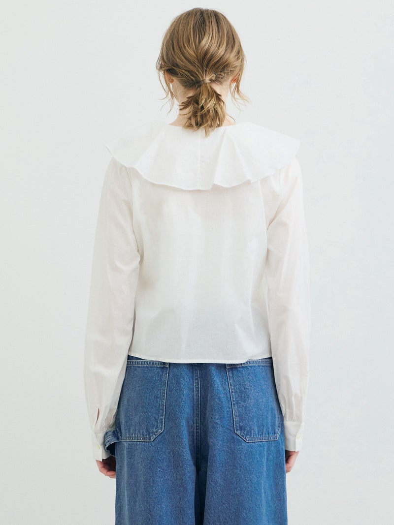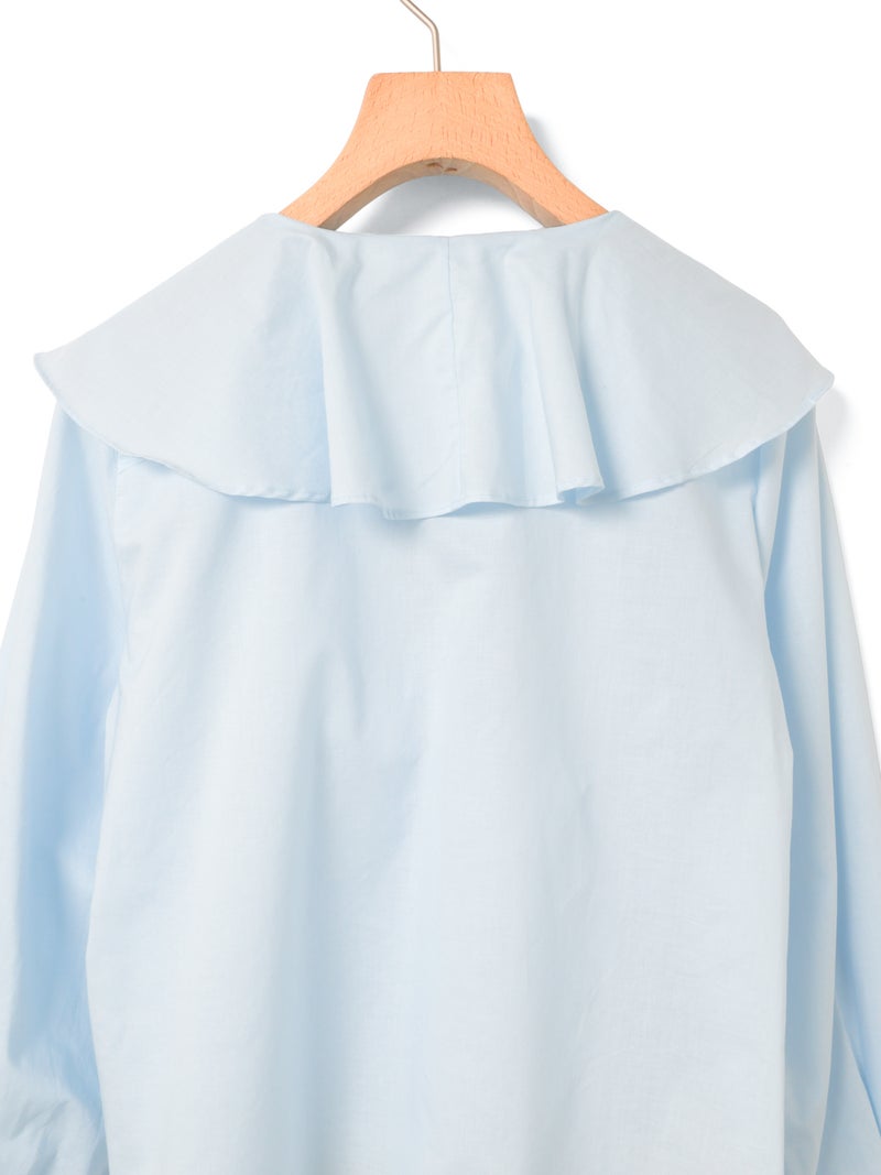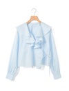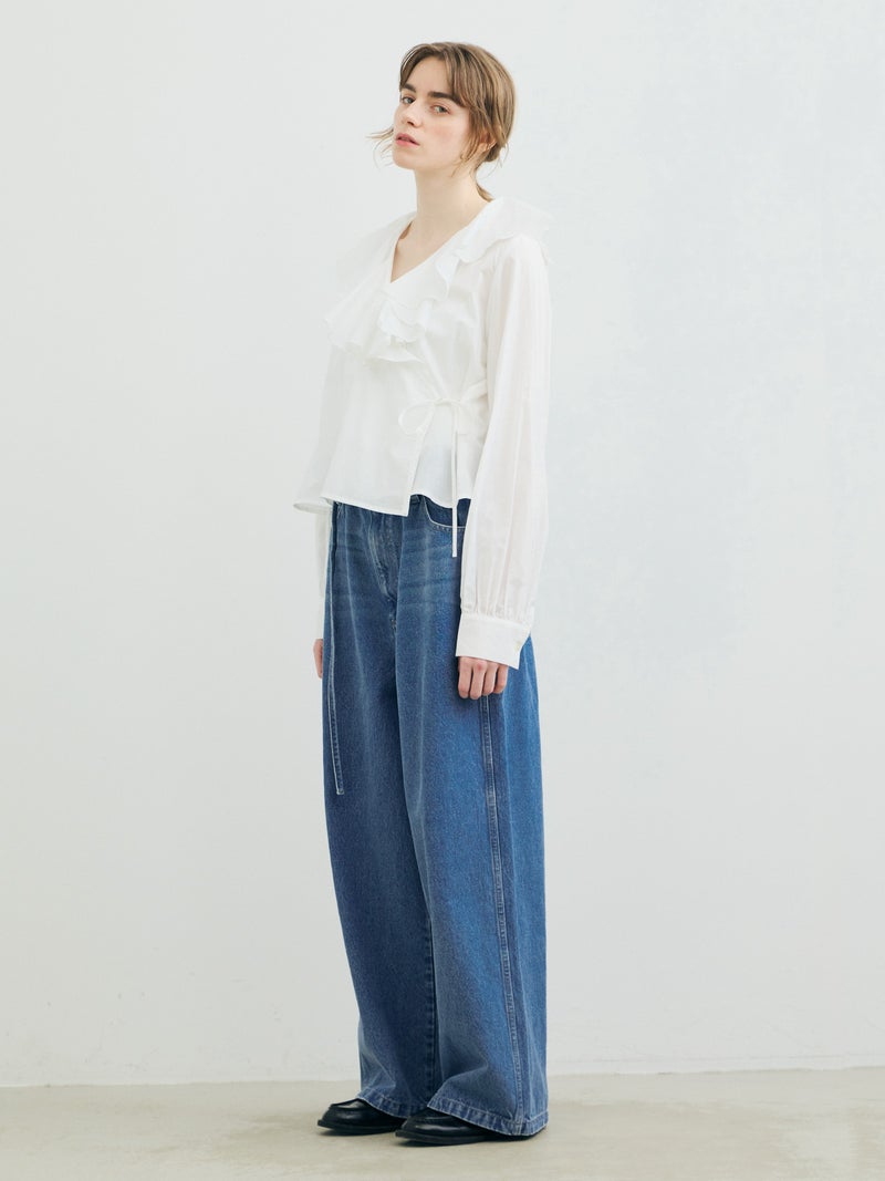 透け感のある軽い素材にラッセルフリルをデザインした印象的なラッフルフリルカシュクールブラウス。フリルが綺麗に出るようパターンされており、はだけないよう胸元に1つボタンが付いています。内側にも紐が付いています。カシュクールデザインのためフロントを開けて羽織としても着るのも可能。ビンテージのフランスの古着をイメージしており華やかな雰囲気も演出。カジュアルなパンツ、デニムにも合う1枚でワークで合わせるとトレンド感が出て素敵です。