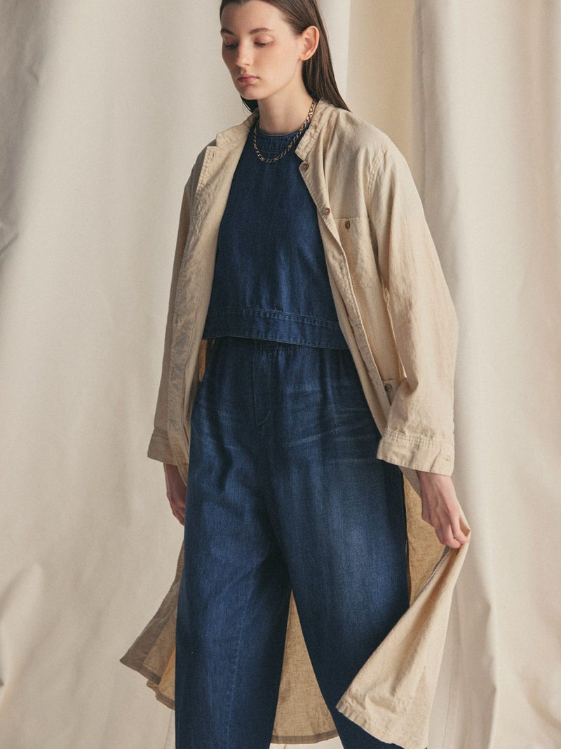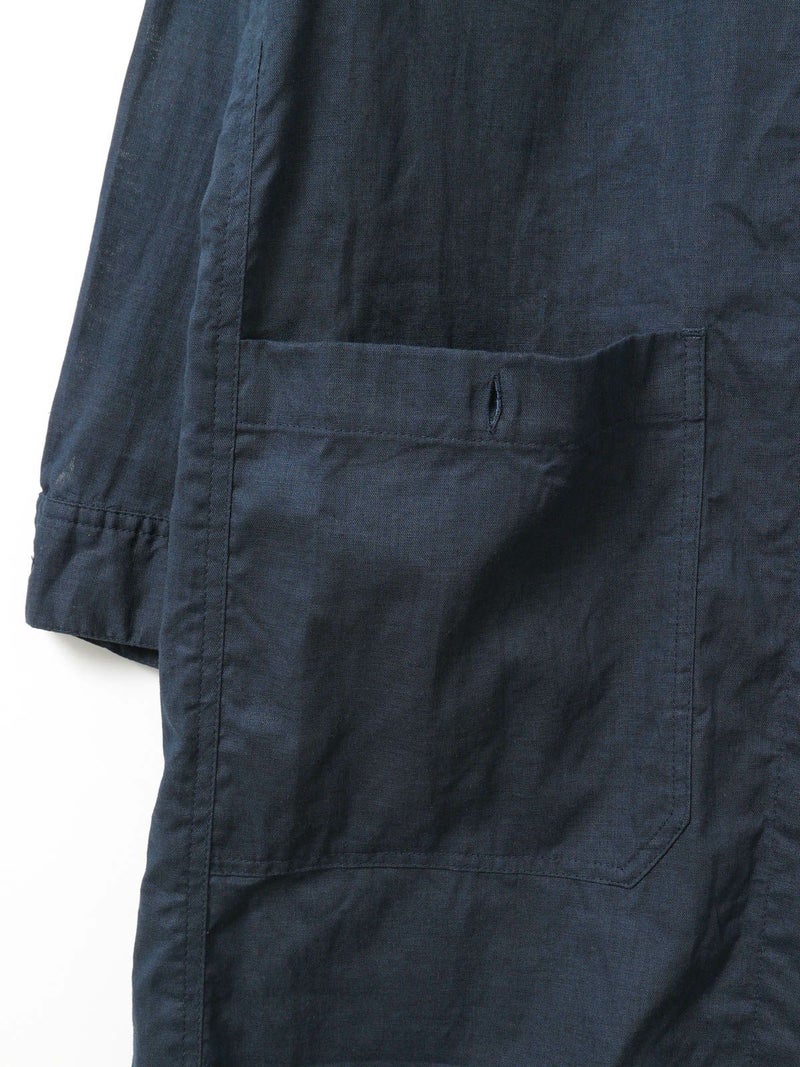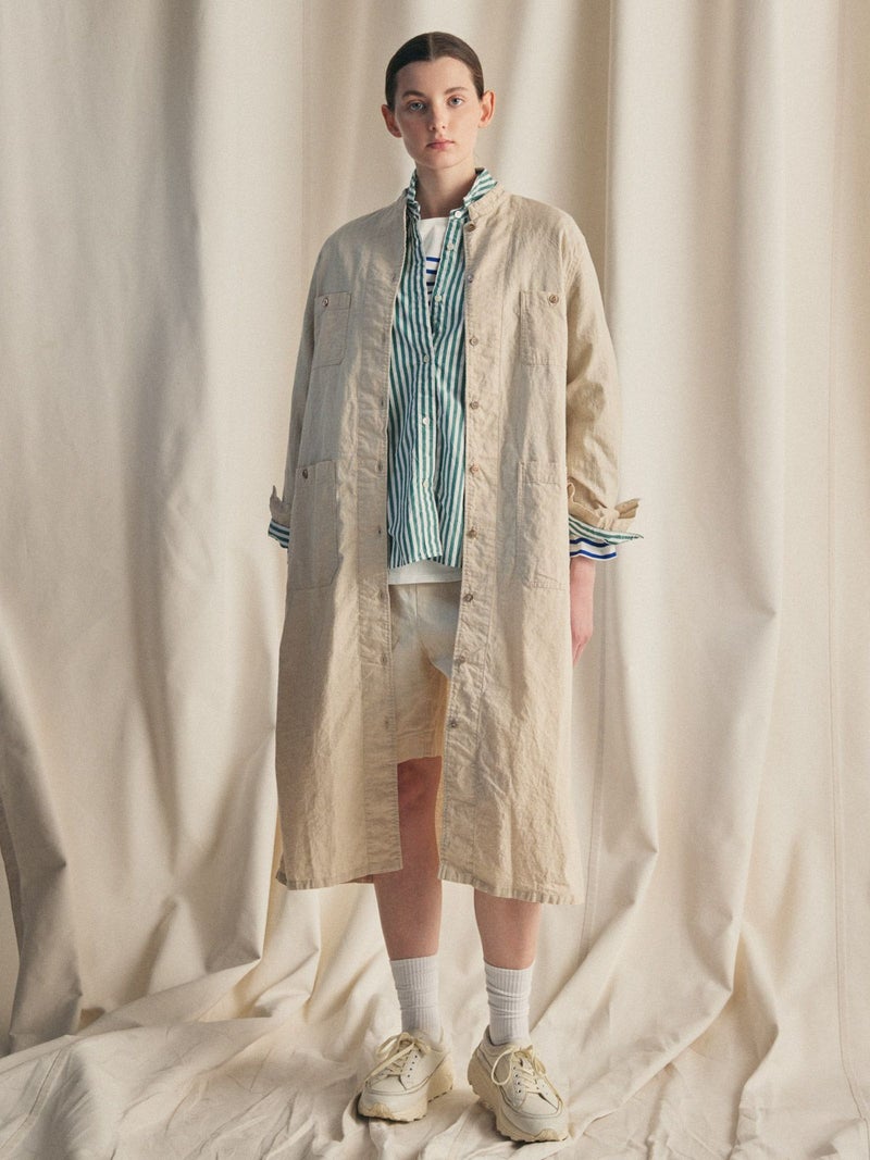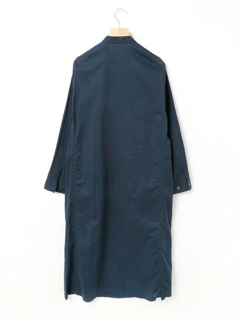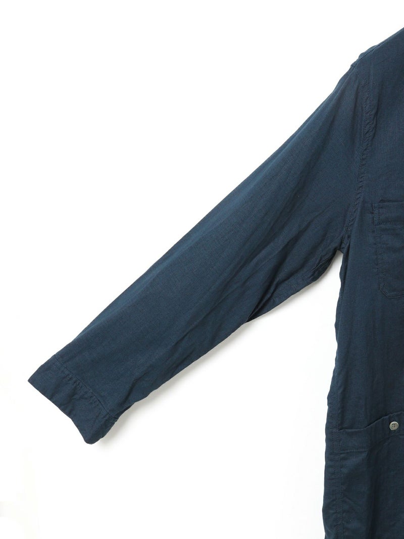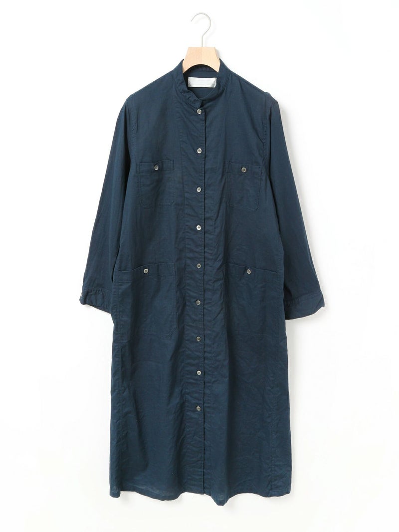 複数のポケットやスタンドの襟元など、ワークテイストでコートライクに羽織れるワンピースです。軽くてシャリ感のある綿麻素材が涼し気な雰囲気を演出します。洗い&タンブラーでクッタリとさせ、シワ感を残した風合いに仕上げているので気軽に着脱可能。ポケット口が垂れてだらしなく見えないように施された釦はデザインポイントにも。軽く見えるよう袖口はカフス仕様のシャツディティールに。第2~第3釦まで外して着用しても襟元が自然に折り返るようなパターン。様々な着こなしが楽しめるアイテムです。