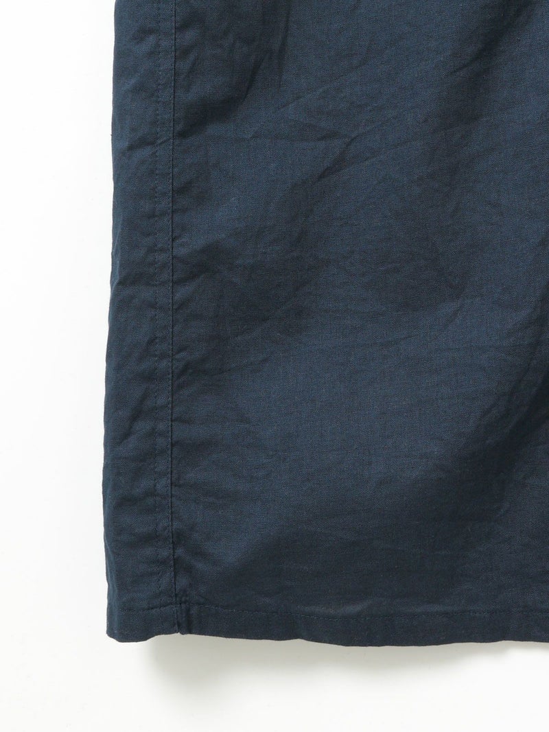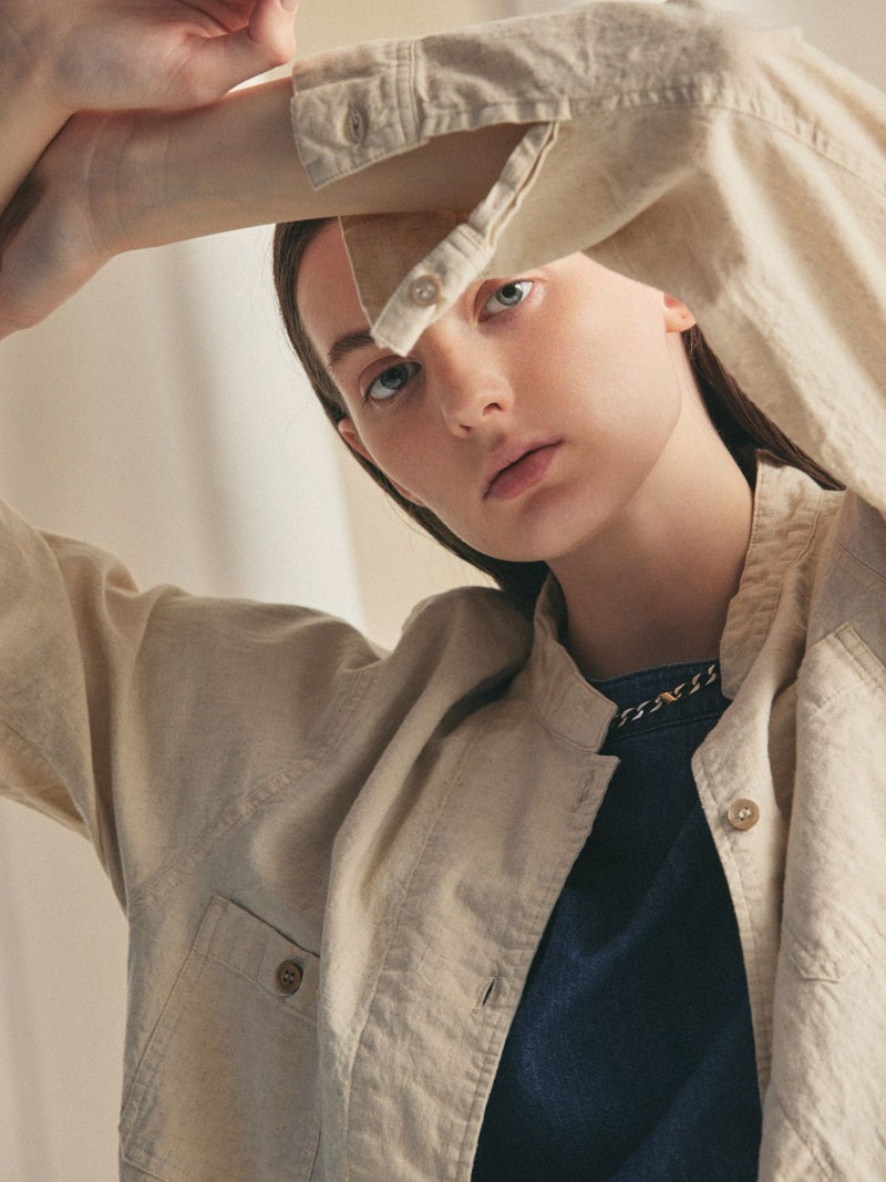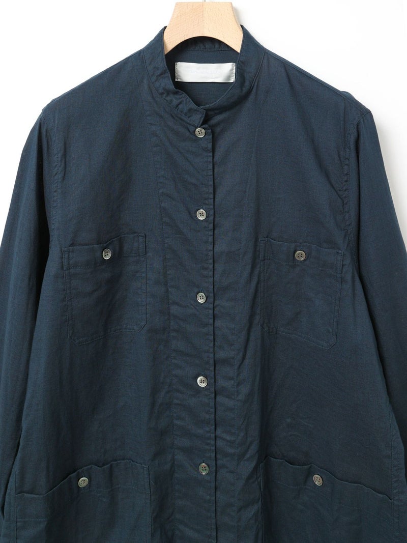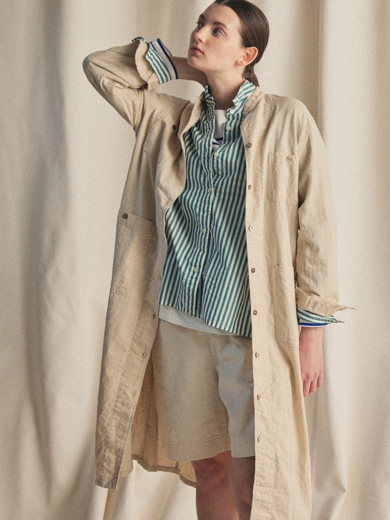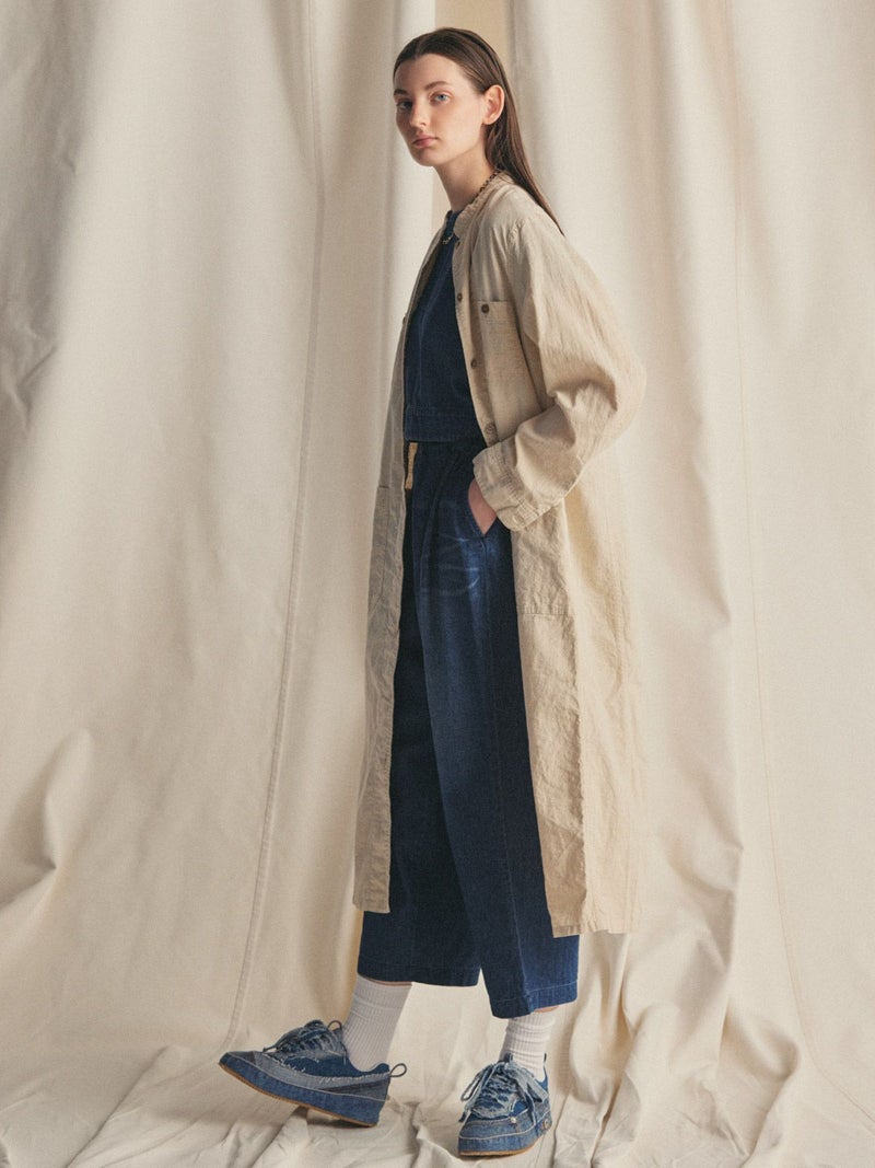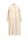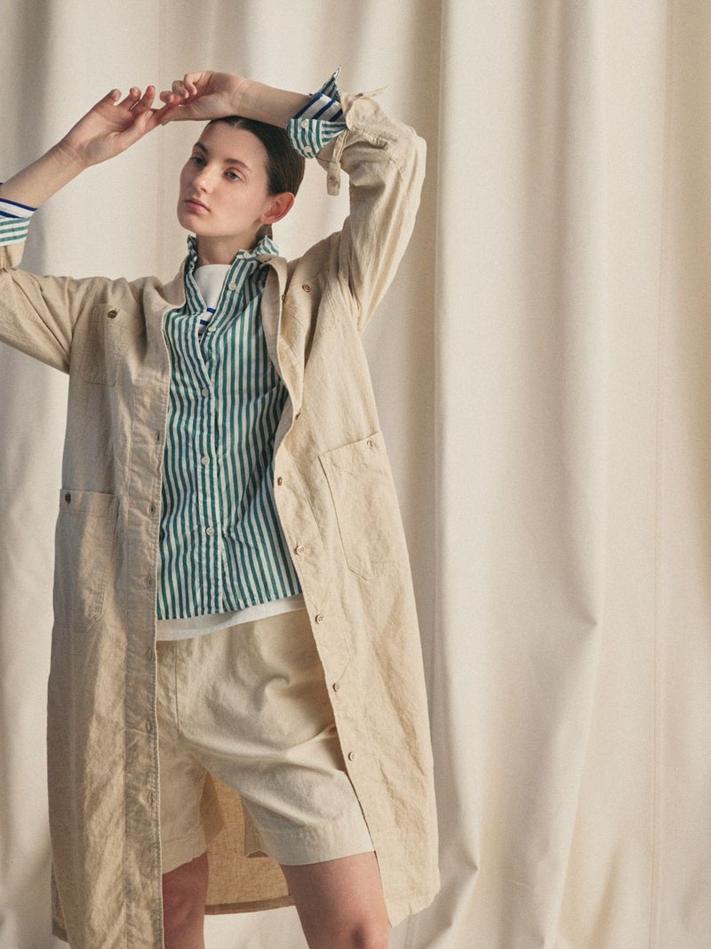 複数のポケットやスタンドの襟元など、ワークテイストでコートライクに羽織れるワンピースです。軽くてシャリ感のある綿麻素材が涼し気な雰囲気を演出します。洗い&タンブラーでクッタリとさせ、シワ感を残した風合いに仕上げているので気軽に着脱可能。ポケット口が垂れてだらしなく見えないように施された釦はデザインポイントにも。軽く見えるよう袖口はカフス仕様のシャツディティールに。第2~第3釦まで外して着用しても襟元が自然に折り返るようなパターン。様々な着こなしが楽しめるアイテムです。