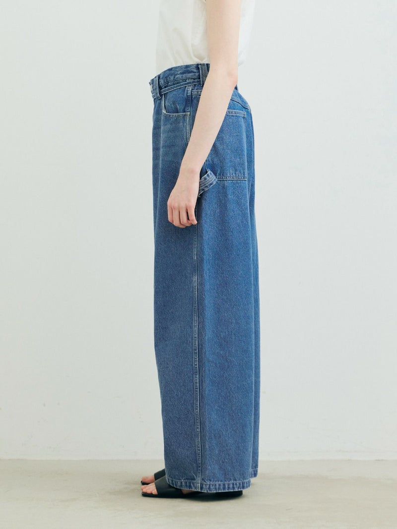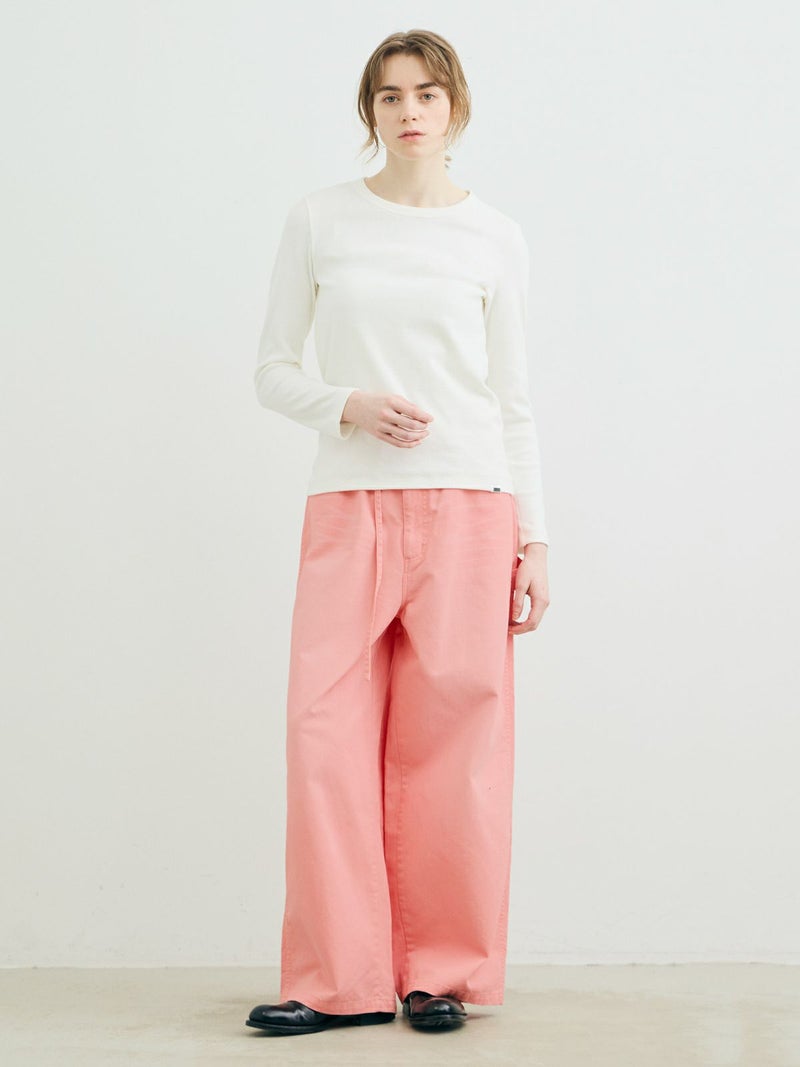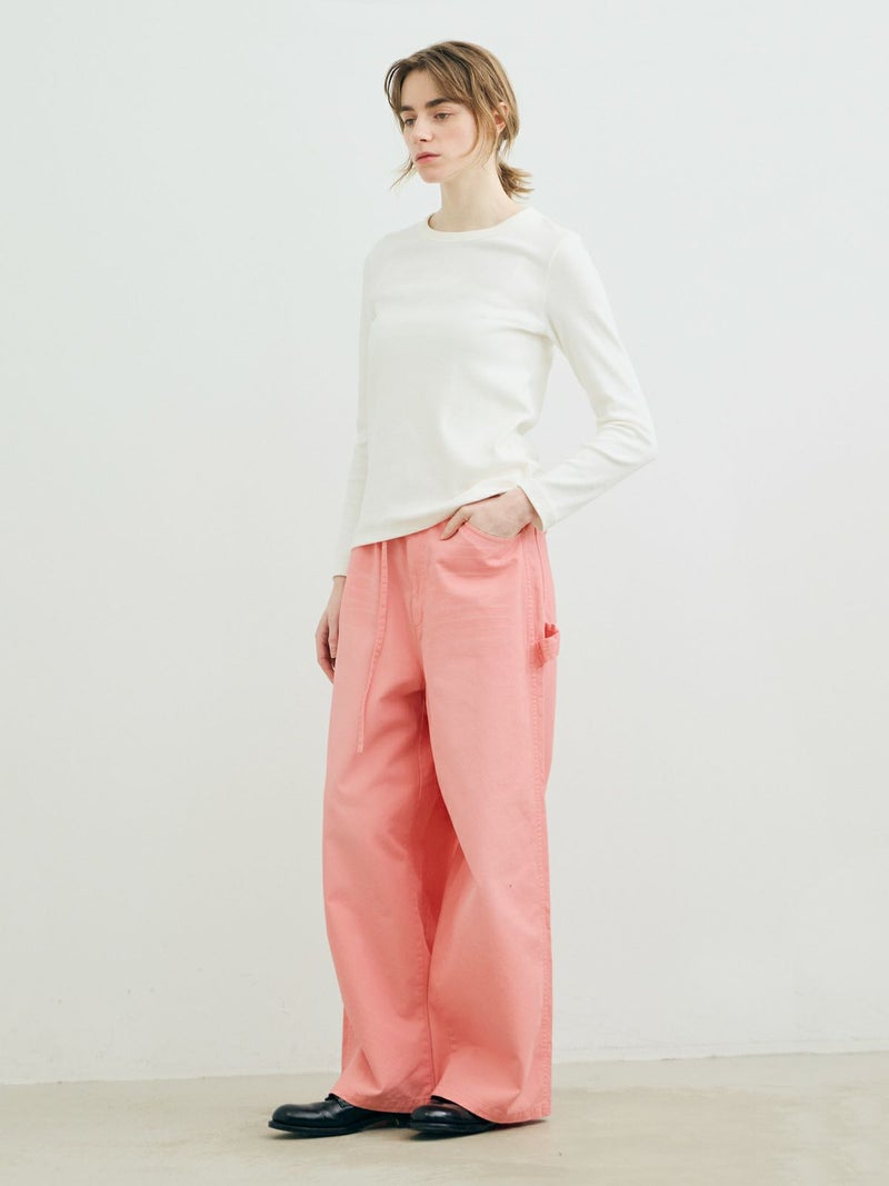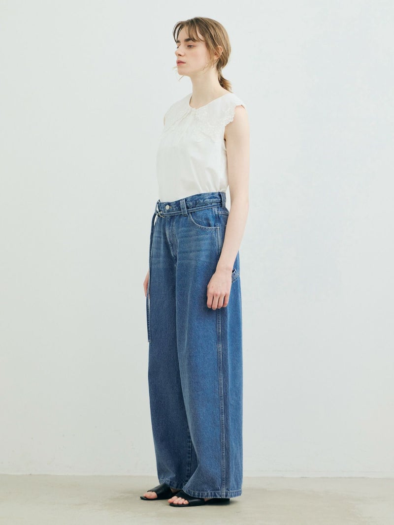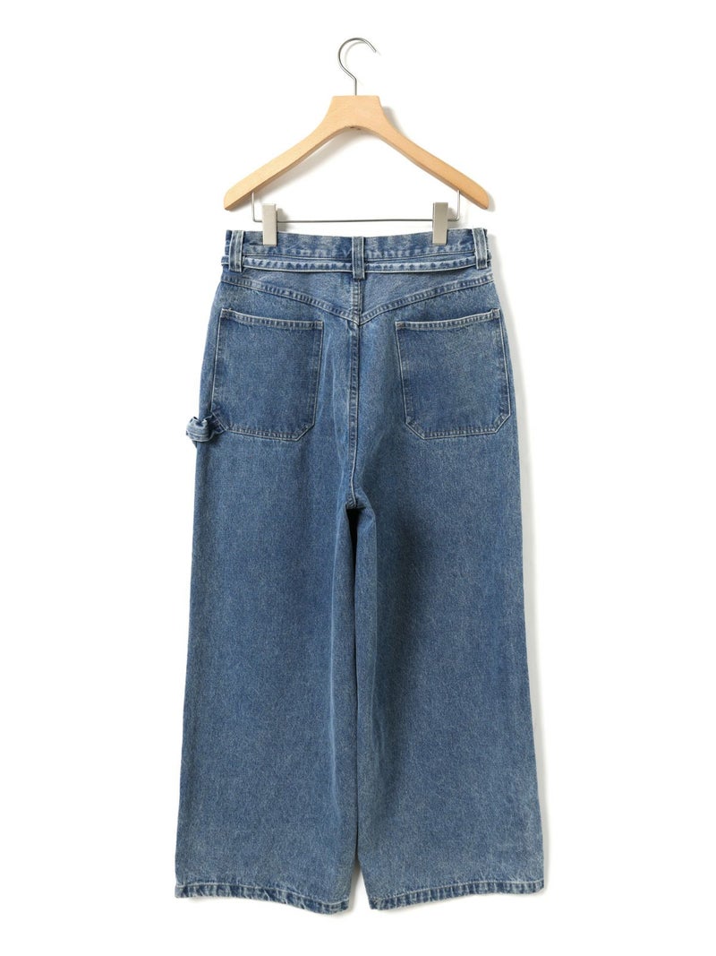 共布のベルトで持ち上げ、メンズライクに着用するイメージのワイドデニムパンツです。ワイドシルエットで腰回りはすっきり、ディティールをそぎ落としてシンプルなトップスに合わせてかっこよくコーディネートしていただくのがお勧め。ベルトループは下のほうで止まる仕様。ピンク(41)は真ん中をこすってダメージ感を表現、ワンウォッシュ(96)=インディゴと、ビンテージ(97)はワンウォッシュをさらにケミカルウォッシュに仕上げた3色展開となっています。同シリーズ1-860092/デニムハーフパンツも展開。
