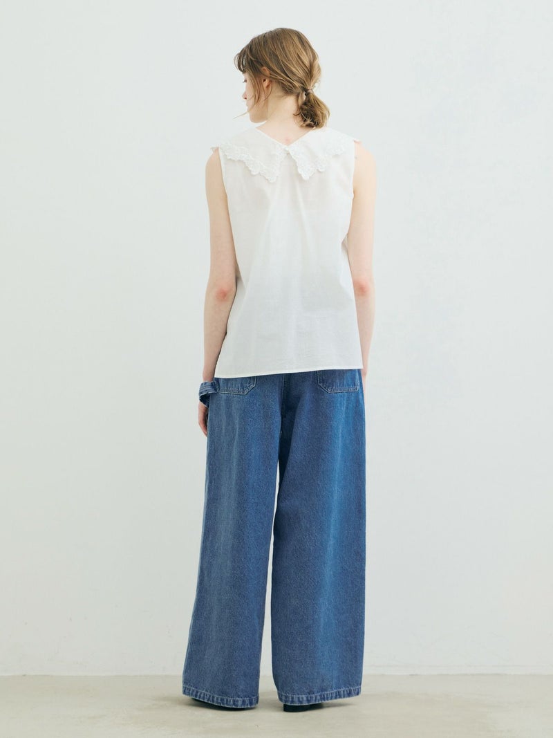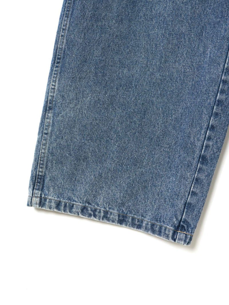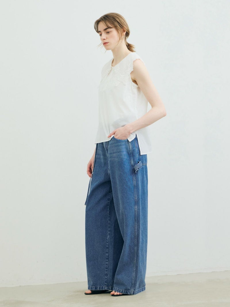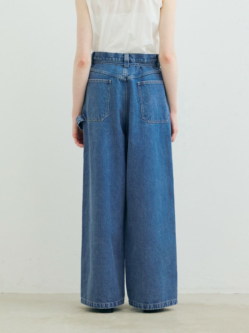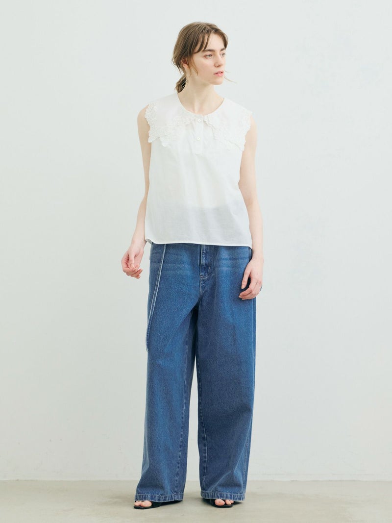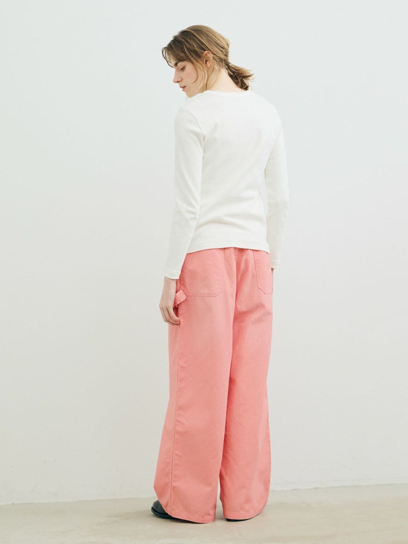 共布のベルトで持ち上げ、メンズライクに着用するイメージのワイドデニムパンツです。ワイドシルエットで腰回りはすっきり、ディティールをそぎ落としてシンプルなトップスに合わせてかっこよくコーディネートしていただくのがお勧め。ベルトループは下のほうで止まる仕様。ピンク(41)は真ん中をこすってダメージ感を表現、ワンウォッシュ(96)=インディゴと、ビンテージ(97)はワンウォッシュをさらにケミカルウォッシュに仕上げた3色展開となっています。同シリーズ1-860092/デニムハーフパンツも展開。