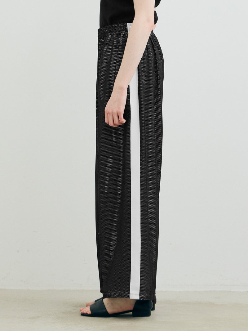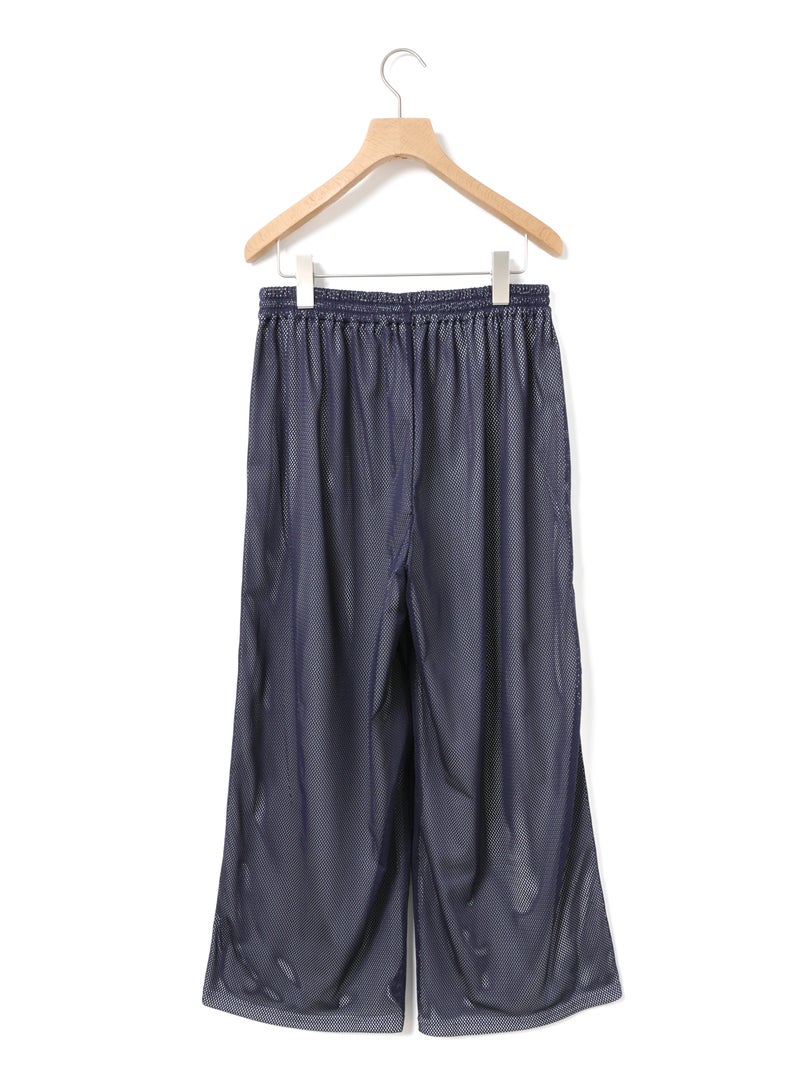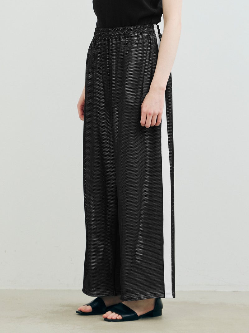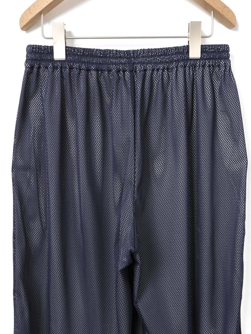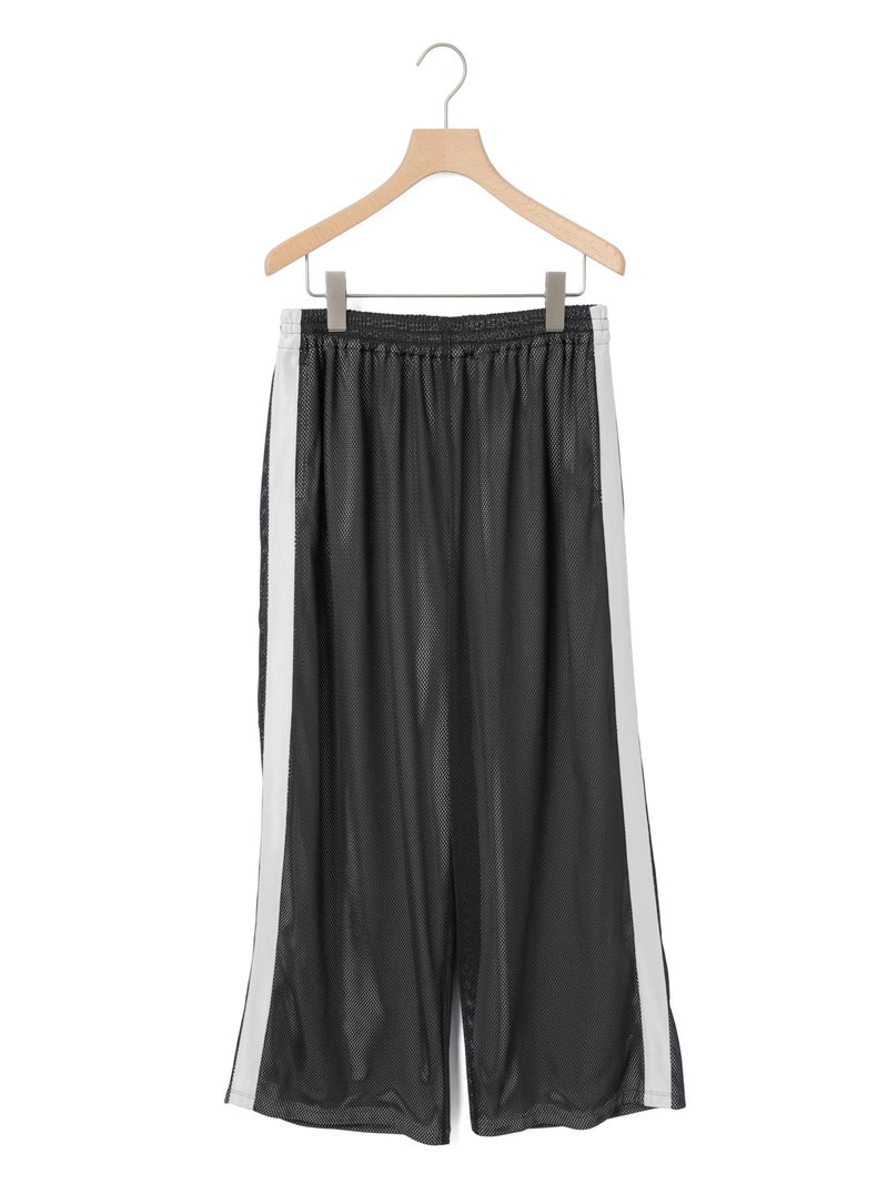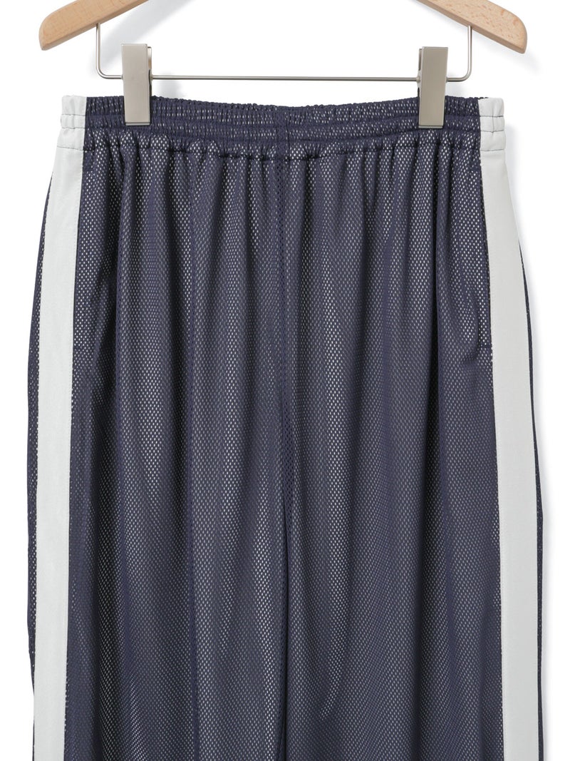 スポーティなトラックパンツをイメージしてデザインしたメッシュトラックパンツ。白のサイドラインを入れ、メッシュが生地の軽快さを楽しめる1枚。総裏地が付いているので透け感をきにせず着用していただけます。サイドラインは全色共通。ウエストゴムに中紐が付いたデザインなので、ラフに着用できしっかりとウエストキープも可能。ゆったりとしたサイズ感でフルレングス丈仕上げ。Tシャツ以外にもシャツを合わせたコーディネートも素敵です。メッシュ生地を重ねているので通気性も良く夏場も着用しやすい1枚です。