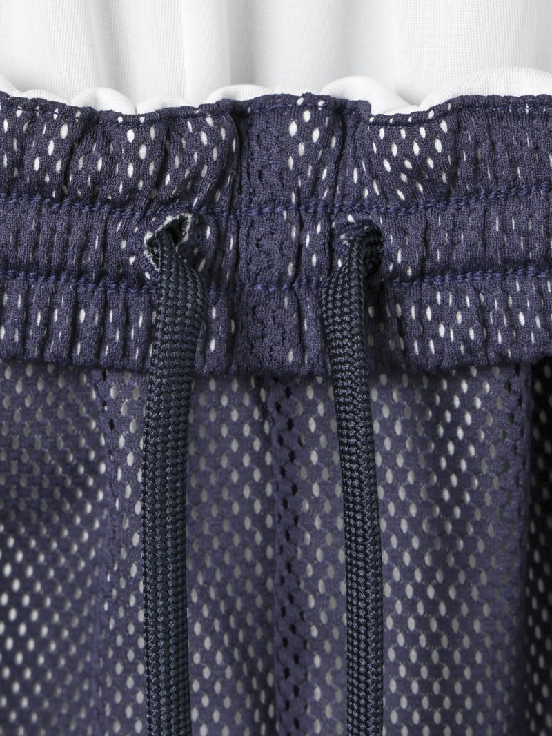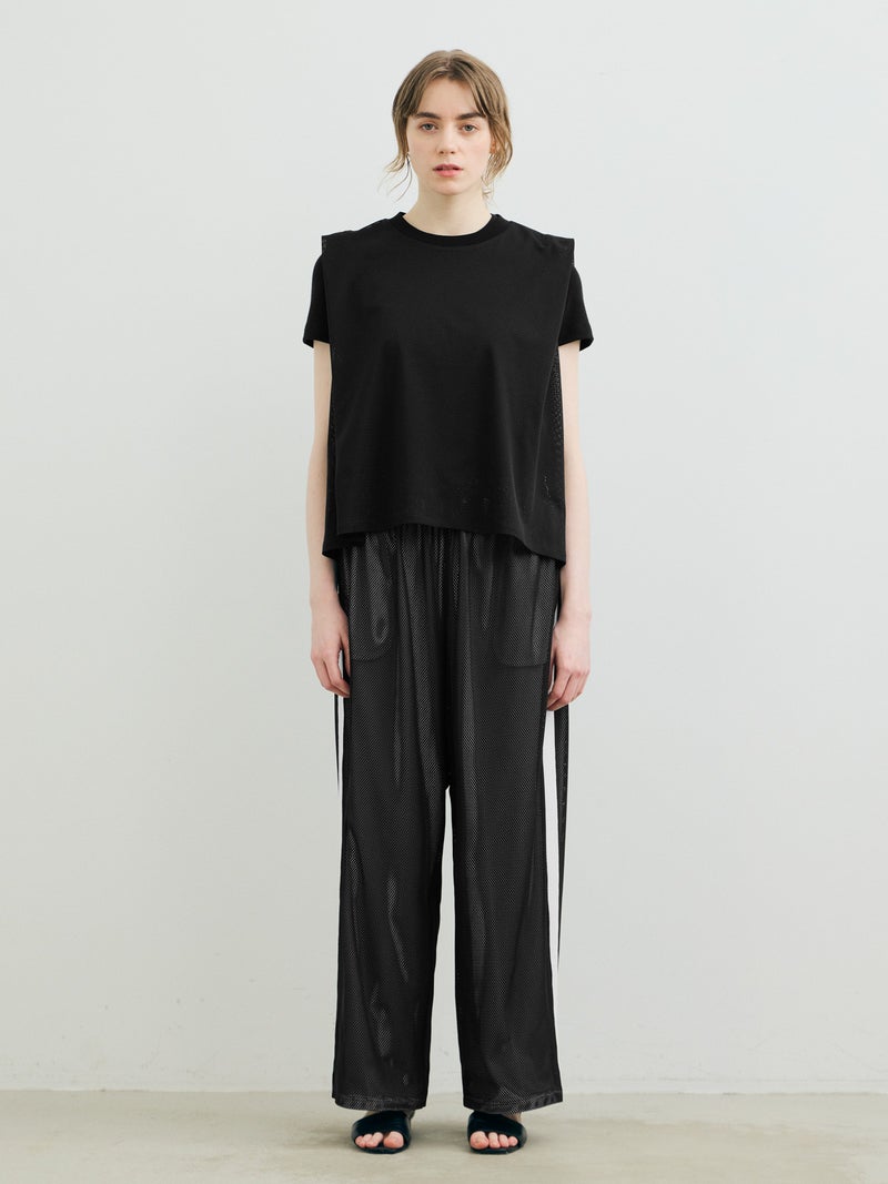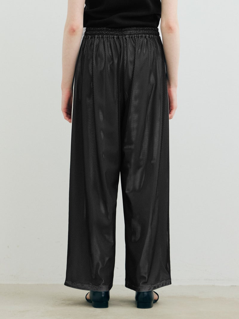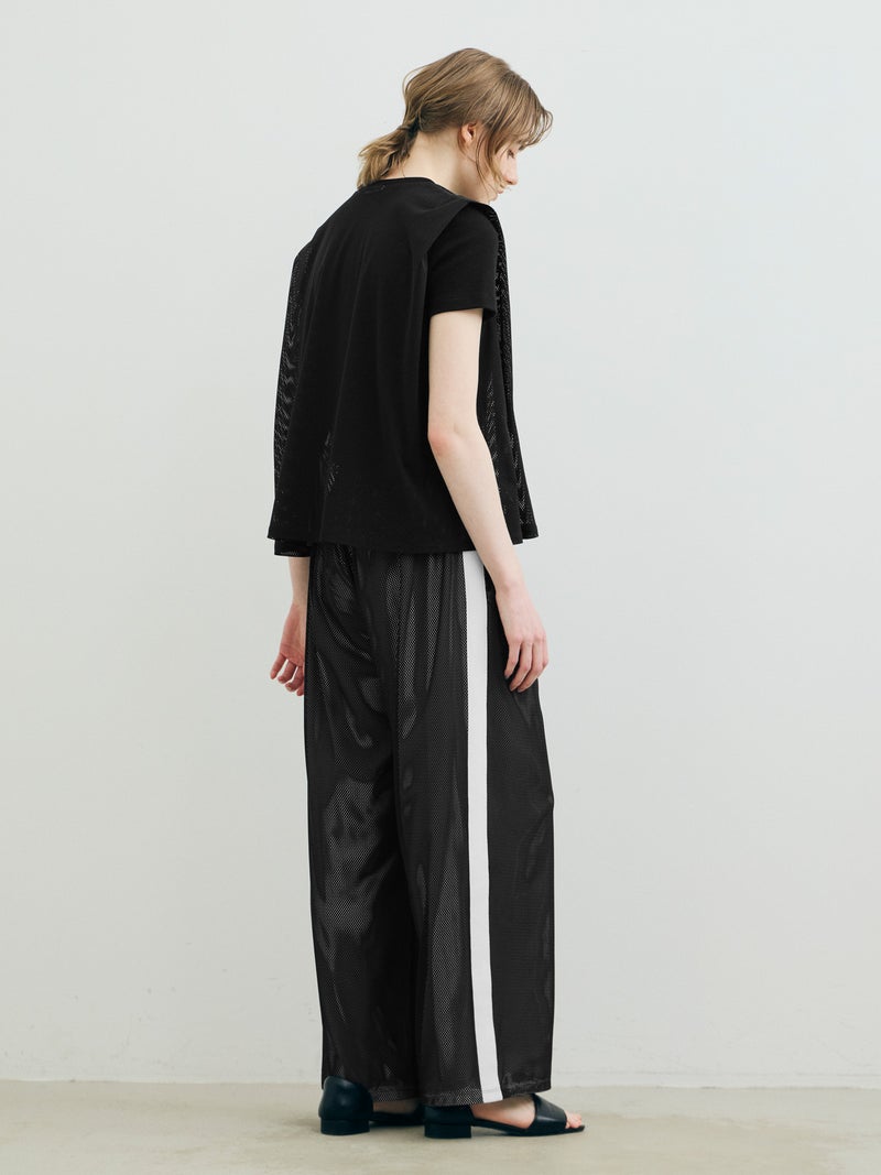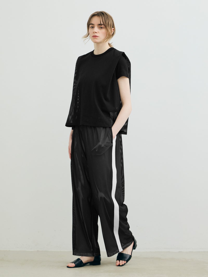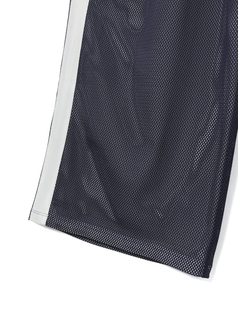 スポーティなトラックパンツをイメージしてデザインしたメッシュトラックパンツ。白のサイドラインを入れ、メッシュが生地の軽快さを楽しめる1枚。総裏地が付いているので透け感をきにせず着用していただけます。サイドラインは全色共通。ウエストゴムに中紐が付いたデザインなので、ラフに着用できしっかりとウエストキープも可能。ゆったりとしたサイズ感でフルレングス丈仕上げ。Tシャツ以外にもシャツを合わせたコーディネートも素敵です。メッシュ生地を重ねているので通気性も良く夏場も着用しやすい1枚です。